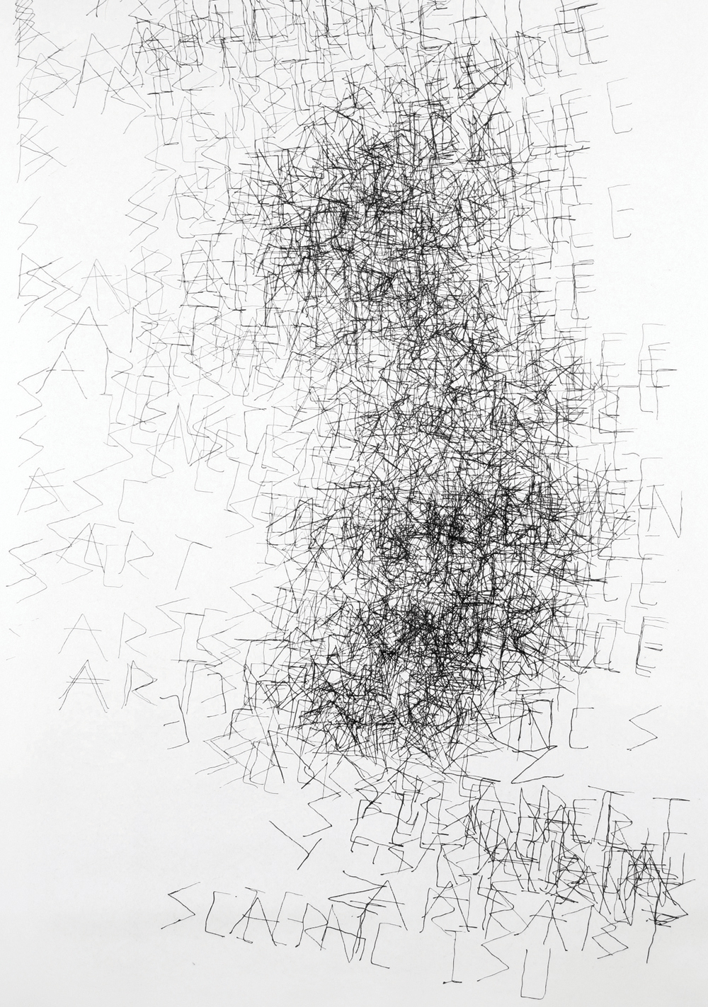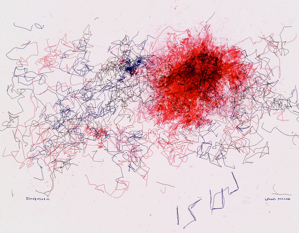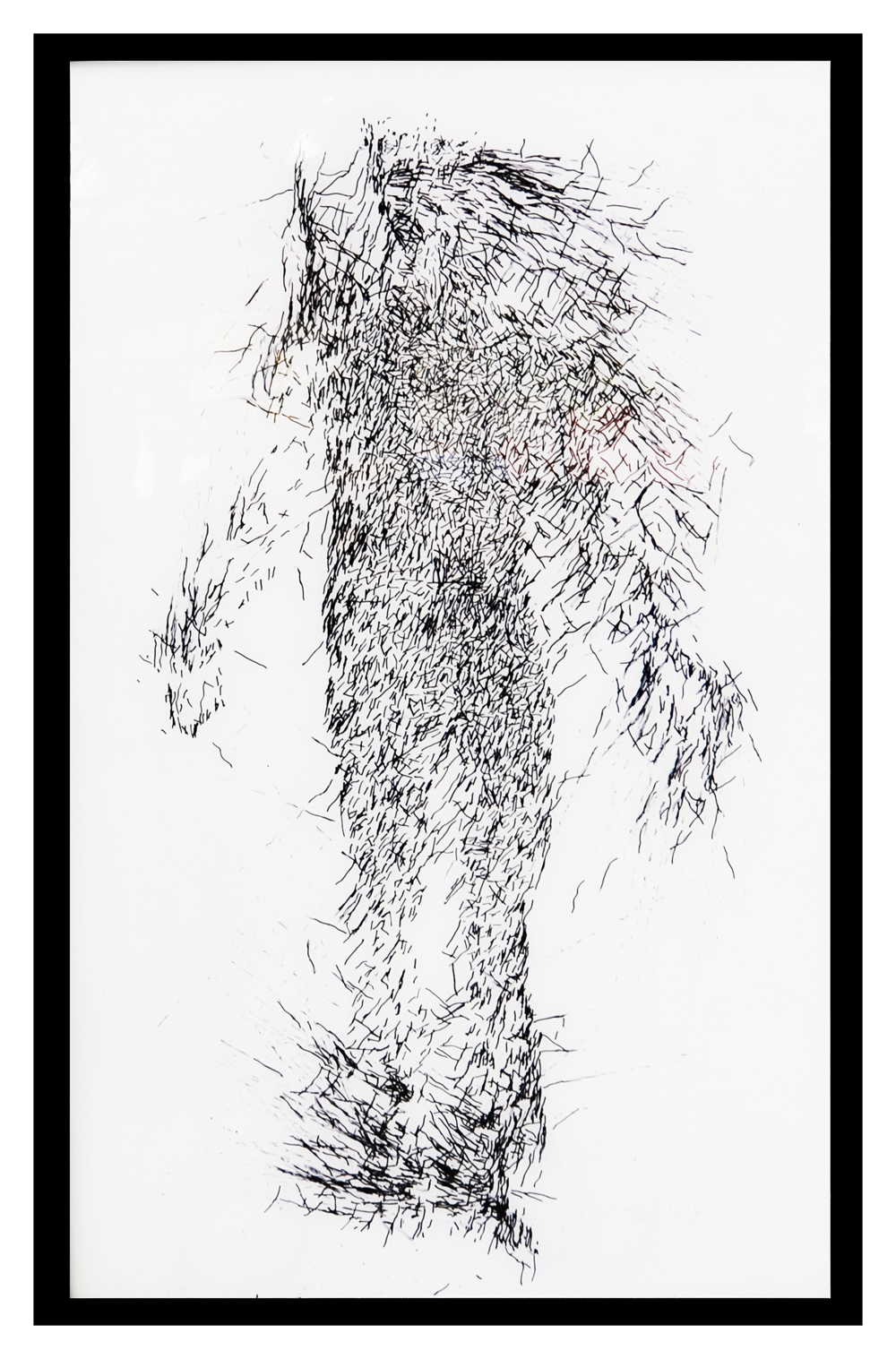 ISU its mechanistic production triggers the viewer’s mind in the same way as any human representation. Having for source a human silhouette ISU tries to fill the contours. Its perception and action are solely local, as ISU does not have the ability to capture the whole image. The result is a fuzzy and gestaltian shape made of hundreds of small scribbles.