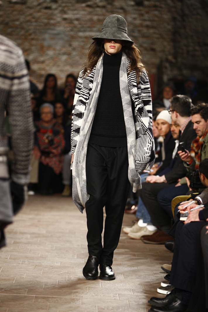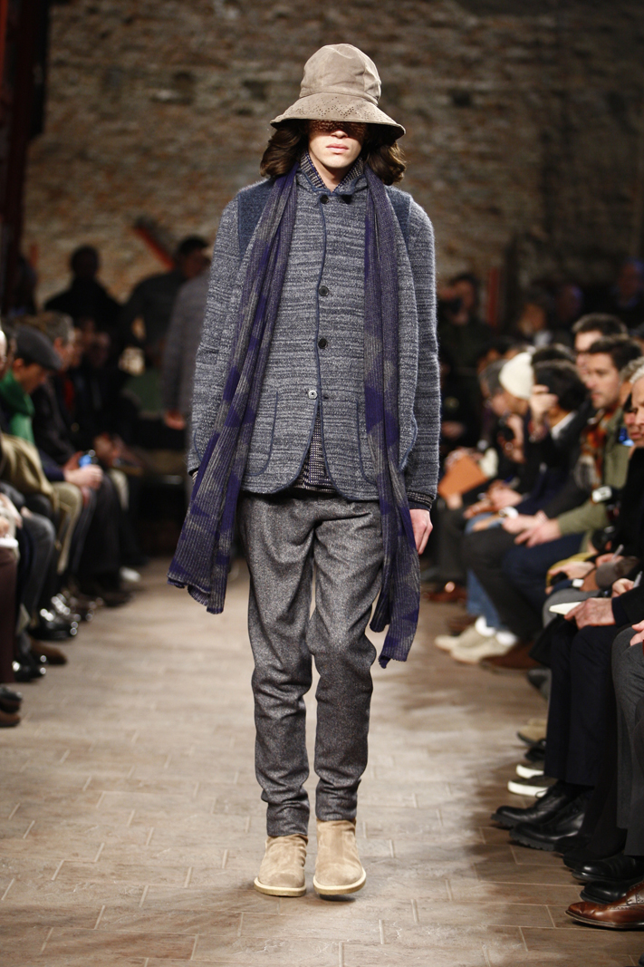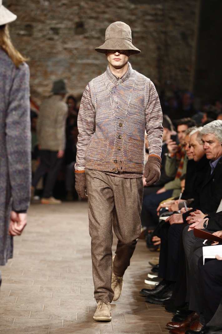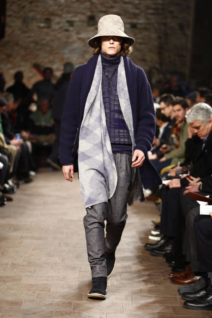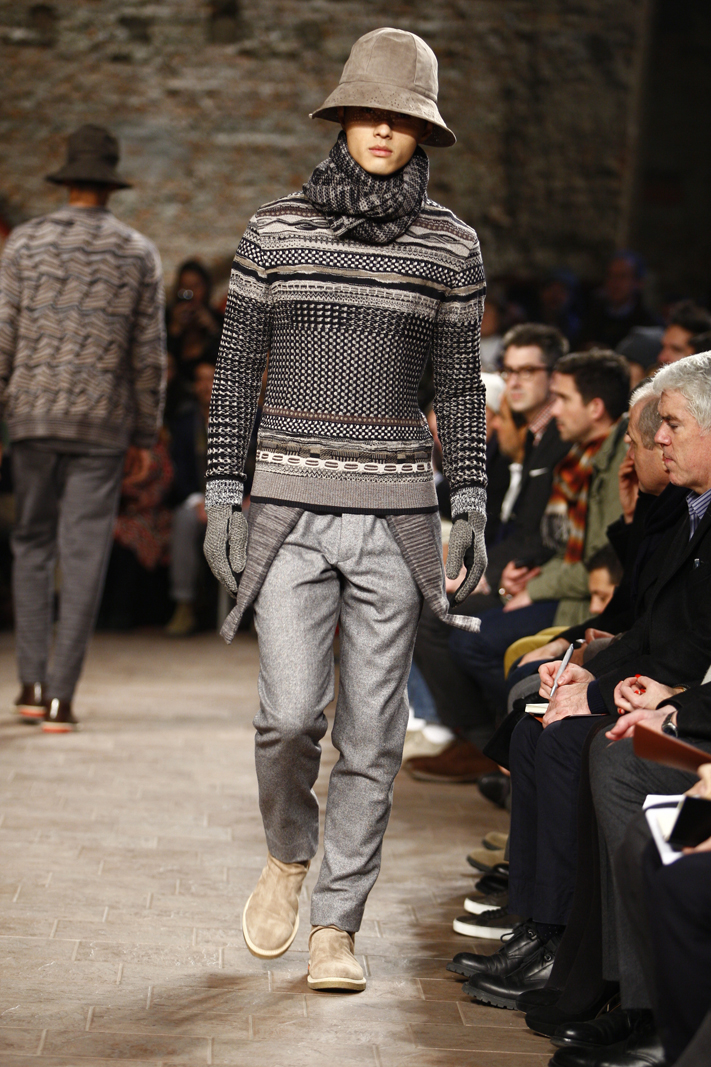 This was Missoni’s main strength and Ottavio and Rosita’s daughter Angela, current women and men’s wear Creative Director at the Italian fashion house, knows this very well. For the Autumn/Winter 2011-12 menswear season, Angela sent out on the Missoni runway models clad in multi-layered styles, accessorised with floppy suede hats. There was a trick, though: none of the layered items – shirts, cardigans, bomber jackets and scarves included – seemed cumbersome nor cluttered the silhouettes and the movements of the models. The trademark zigzagging motifs and abstract geometrical textures weren’t missing, but there were also intarsia creating interesting decors and cobweb-like elements and the focus was on double-faced and reversible items, from jackets to trousers.