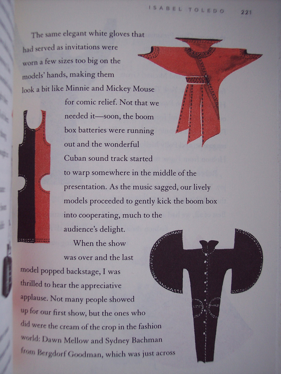 The designer also writes about her work at Anne Klein and her collaborations with bigger retailers such as Target and Payless ShoeSource, conceived not as a way to go global, but as an opportunity to offer to a wider audience the chance of buying a piece designed by Isabel Toledo.