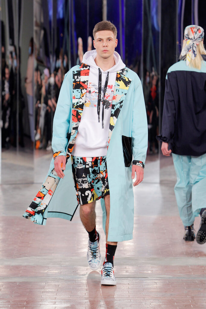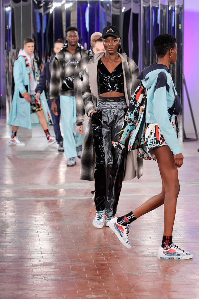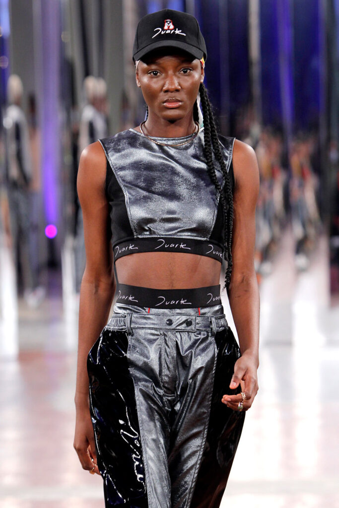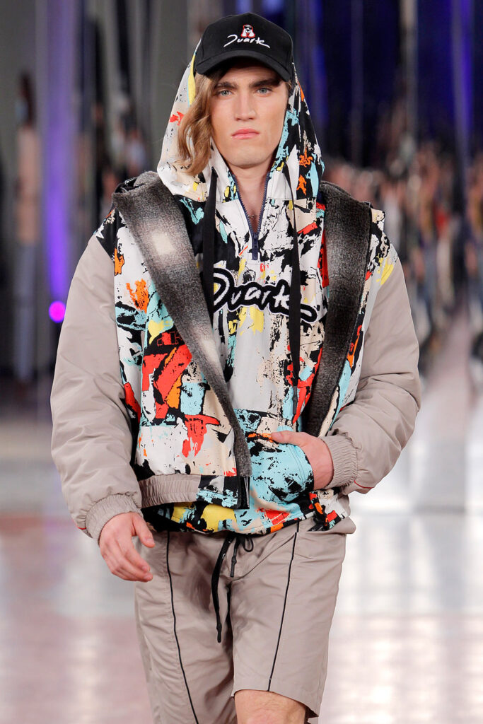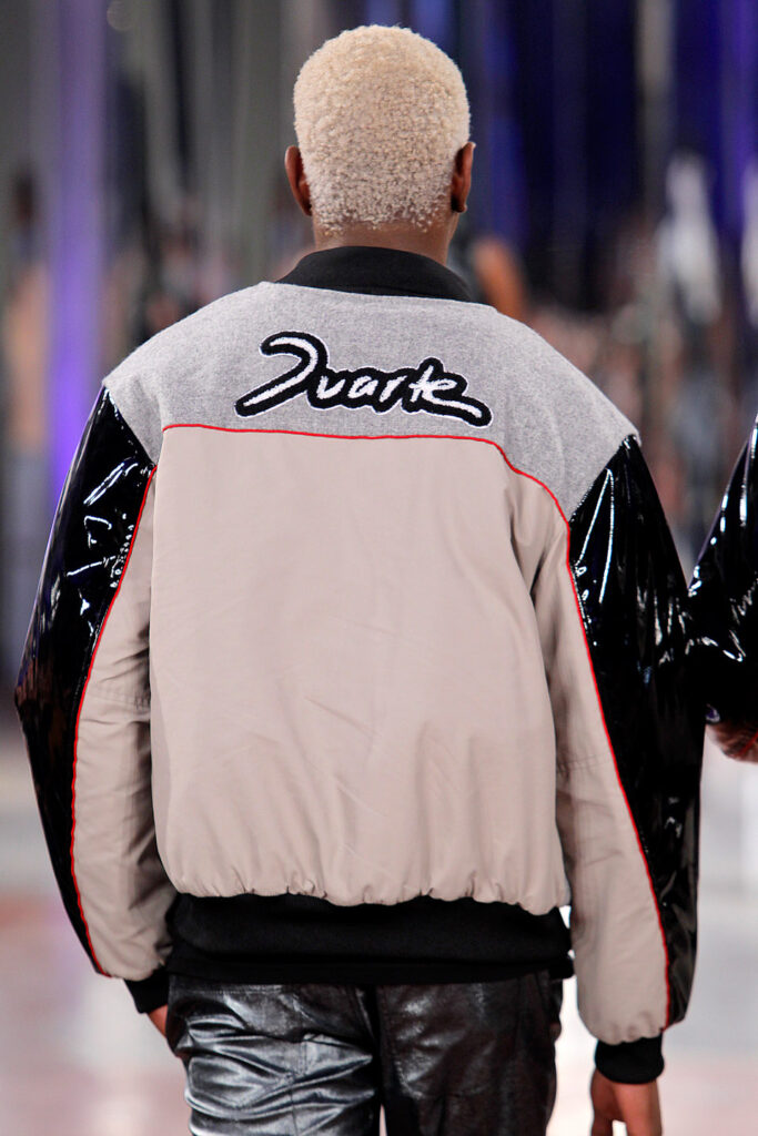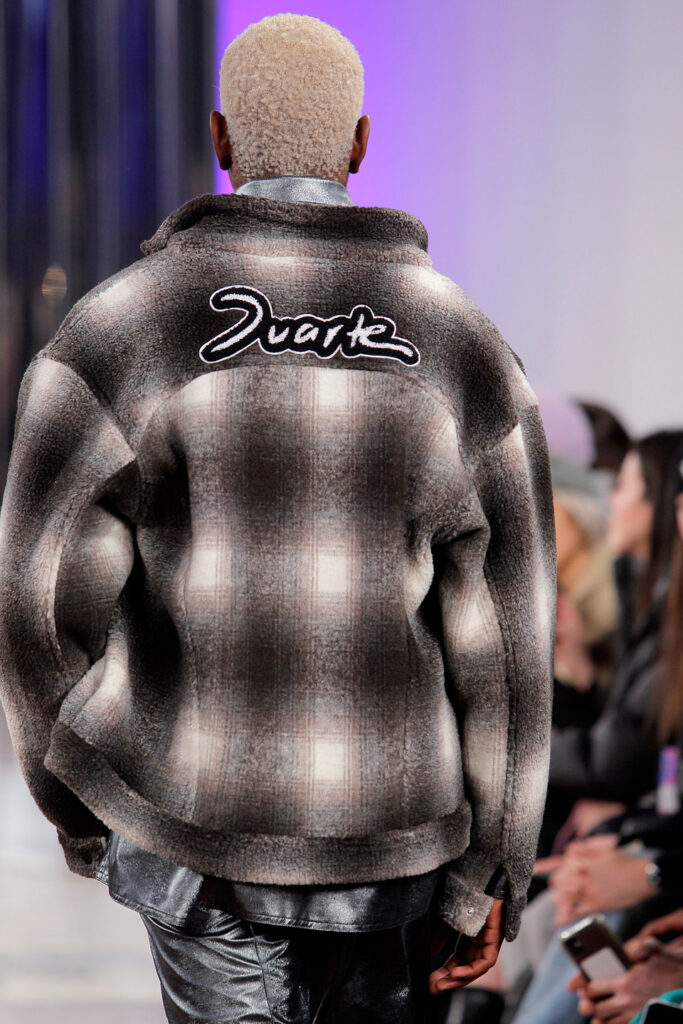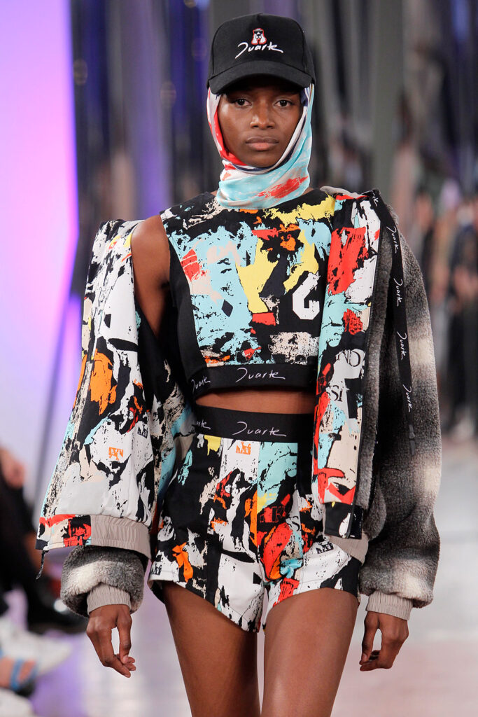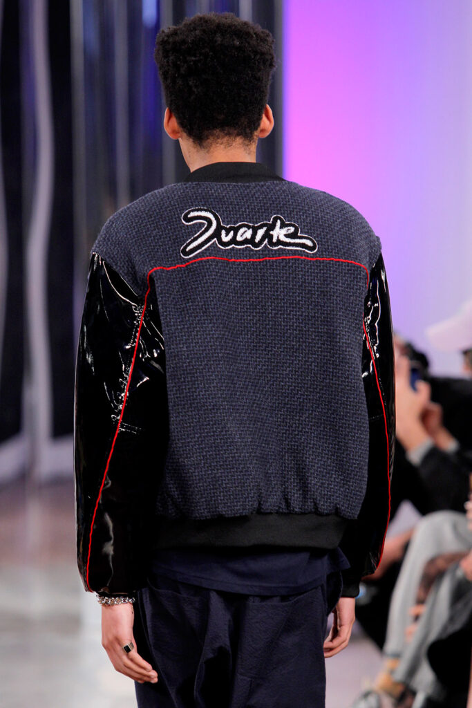 Lisbon born fashion designer Ana Duarte is showing with her label DUARTE since 2015 at ModaLisboa. Her current A/W 2022 collection is a bold and strong statement and embraces the concept of sustainable streetwear. Anna is following up her previous collection which was entitled “World Keeper”. It circles around the story of the dog Tadao, that fights environmental threats created by mankind. She draws her inspiration from street art and street dance – the show also included a street dance performance – and most of her pieces are unisex, layering and mix of materials are key. Duarte fabrics are well resourced as she does not want to harm the planet with her work but on the contrary, wants to make a statement that our way of living and consuming can safe our planet.