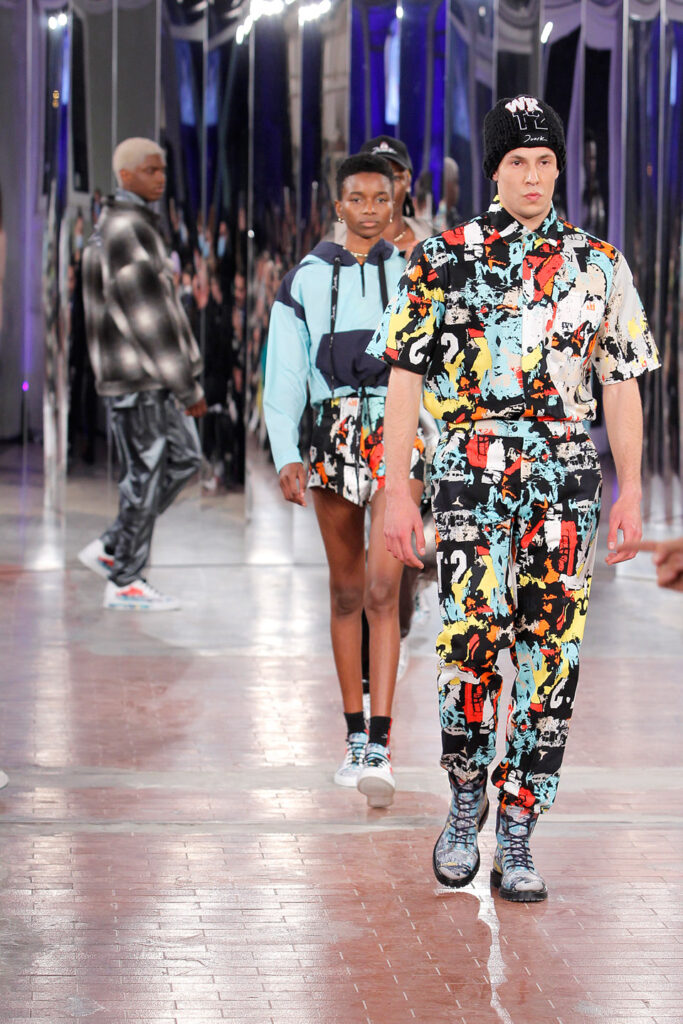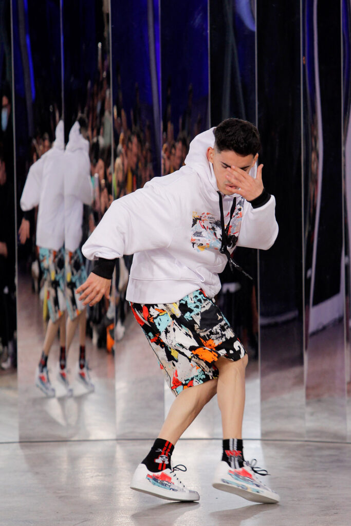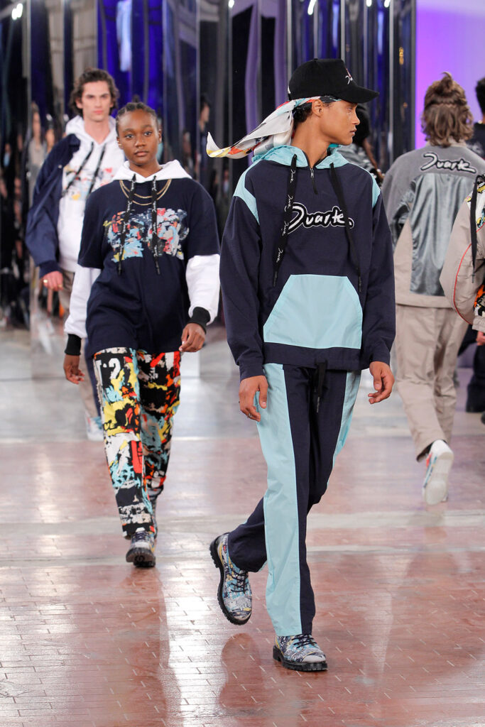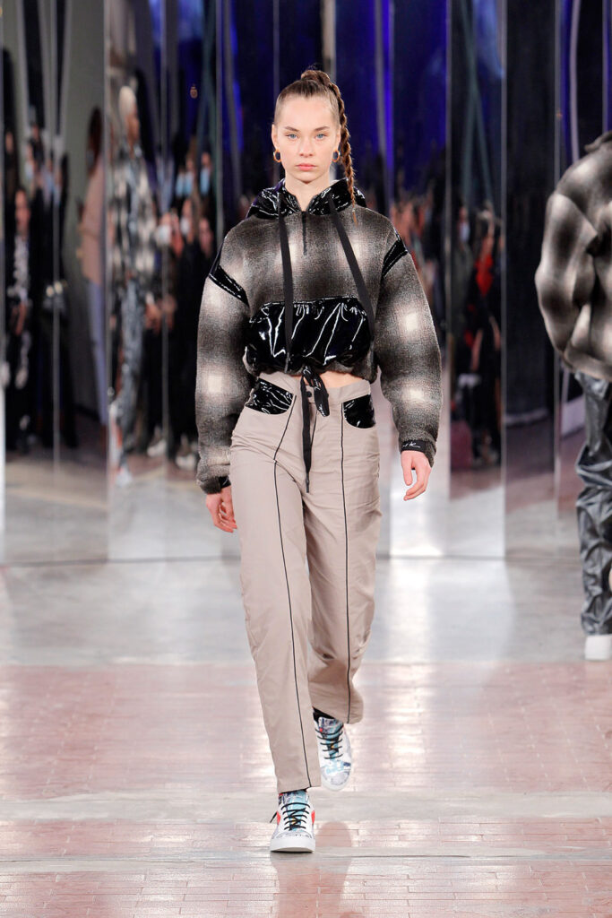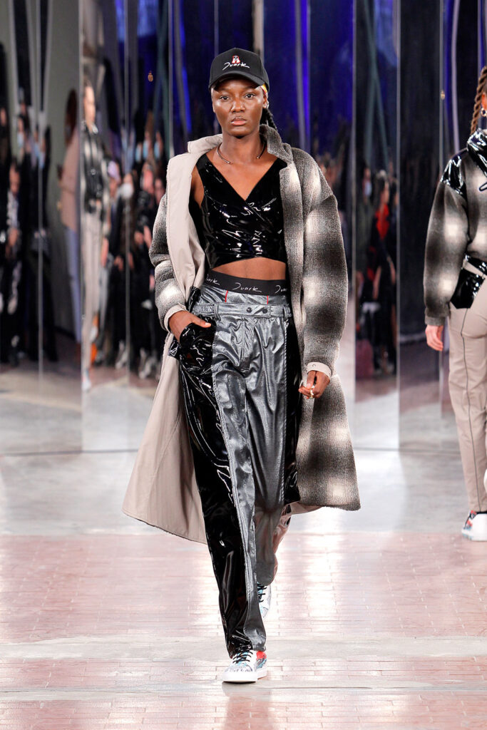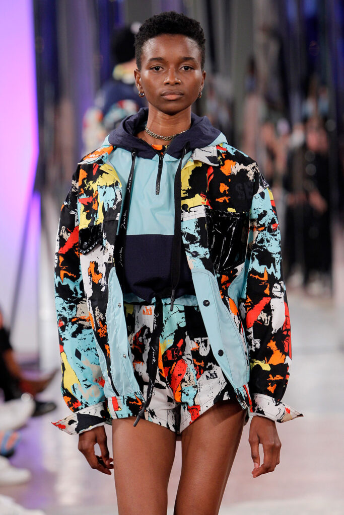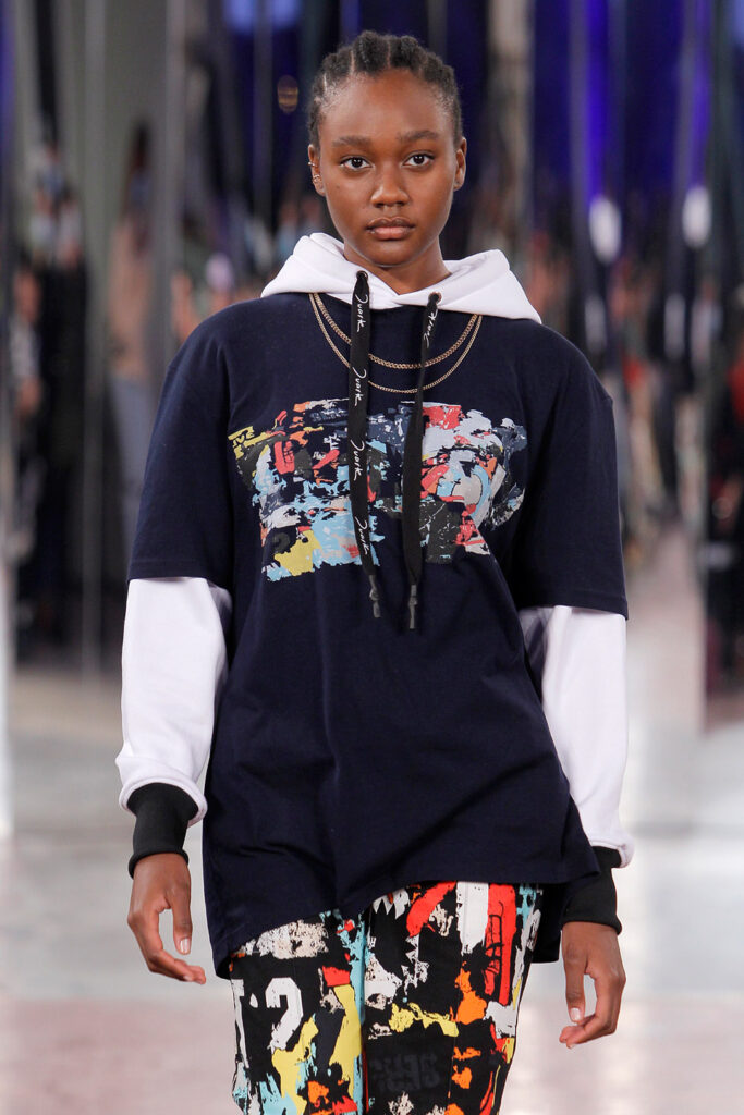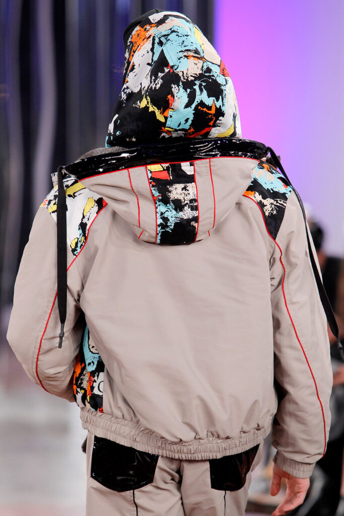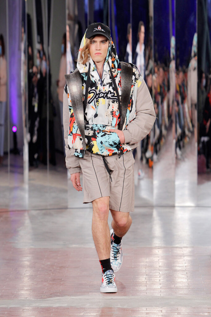 Lisbon born fashion designer Ana Duarte is showing with her label DUARTE since 2015 at ModaLisboa. Her current A/W 2022 collection is a bold and strong statement and embraces the concept of sustainable streetwear. Anna is following up her previous collection which was entitled “World Keeper”. It circles around the story of the dog Tadao, that fights environmental threats created by mankind. She draws her inspiration from street art and street dance – the show also included a street dance performance – and most of her pieces are unisex, layering and mix of materials are key. Duarte fabrics are well resourced as she does not want to harm the planet with her work but on the contrary, wants to make a statement that our way of living and consuming can safe our planet.