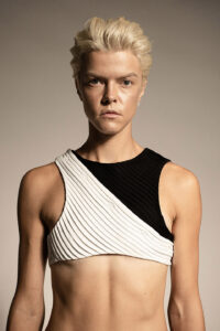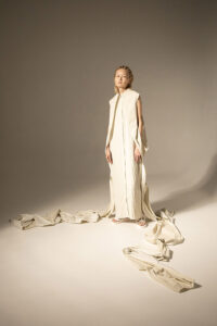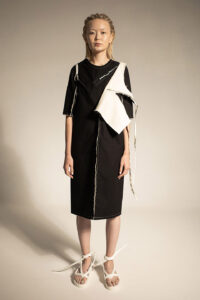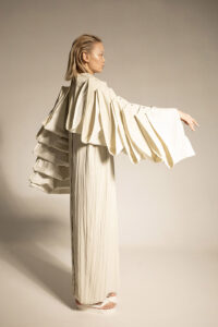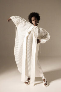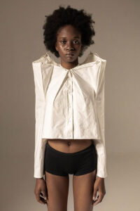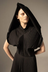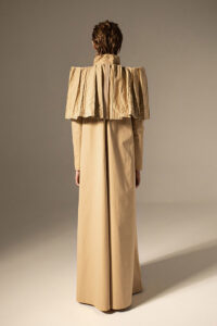 Dzhus’s designs are characterized by architectural silhouettes and geometrical pleats that create complex configurations and biomorphic shapes. Her latest collection is an ode to the transformative power of fashion, and reimagines the possibilities of reducing waste and consumption. Each design in this collection can be transformed into something else, thanks to ingenuously placed metal zippers and press studs. A quilted dense cotton hat can be turned into a bag or worn as a harness sleeve; skirts, bras and hoods double as bags; a pleated wide-leg jumpsuit transforms into two-layered trousers or can be worn as a cape or a hood; while a multipurpose bi-coloured design can be styled as a jumpsuit, a coat, a dress and a two-layer jacket, or transformed into two hats or bags or a hat and a bag. And there’s some added value as well: the packaging – a classic universal shopping bag made with fabric rather than plastic – can be easily transformed into a practical yet iconic dress or top.