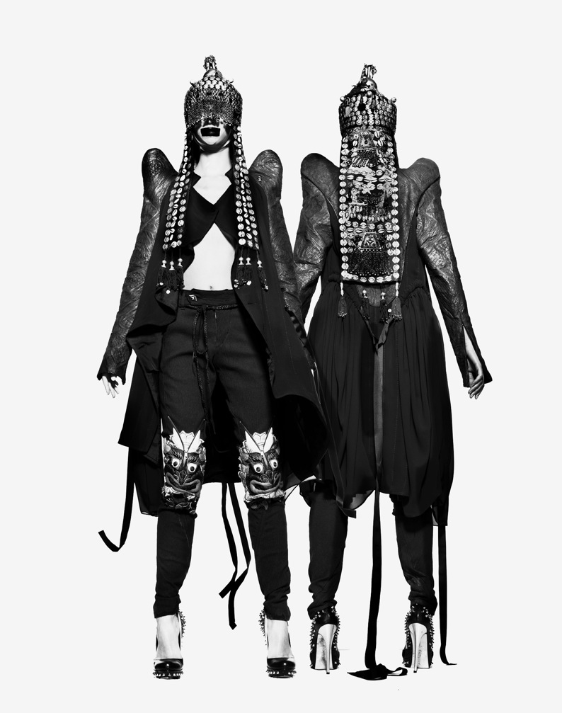 Hat stylist’s own; Black jacket and long black pant by TSOLMANSAKH MUNKHUU; Metal ring by K-MO JEWELLERY; leather and metal shoes by TSURU BY ALESSANDRA STELLA