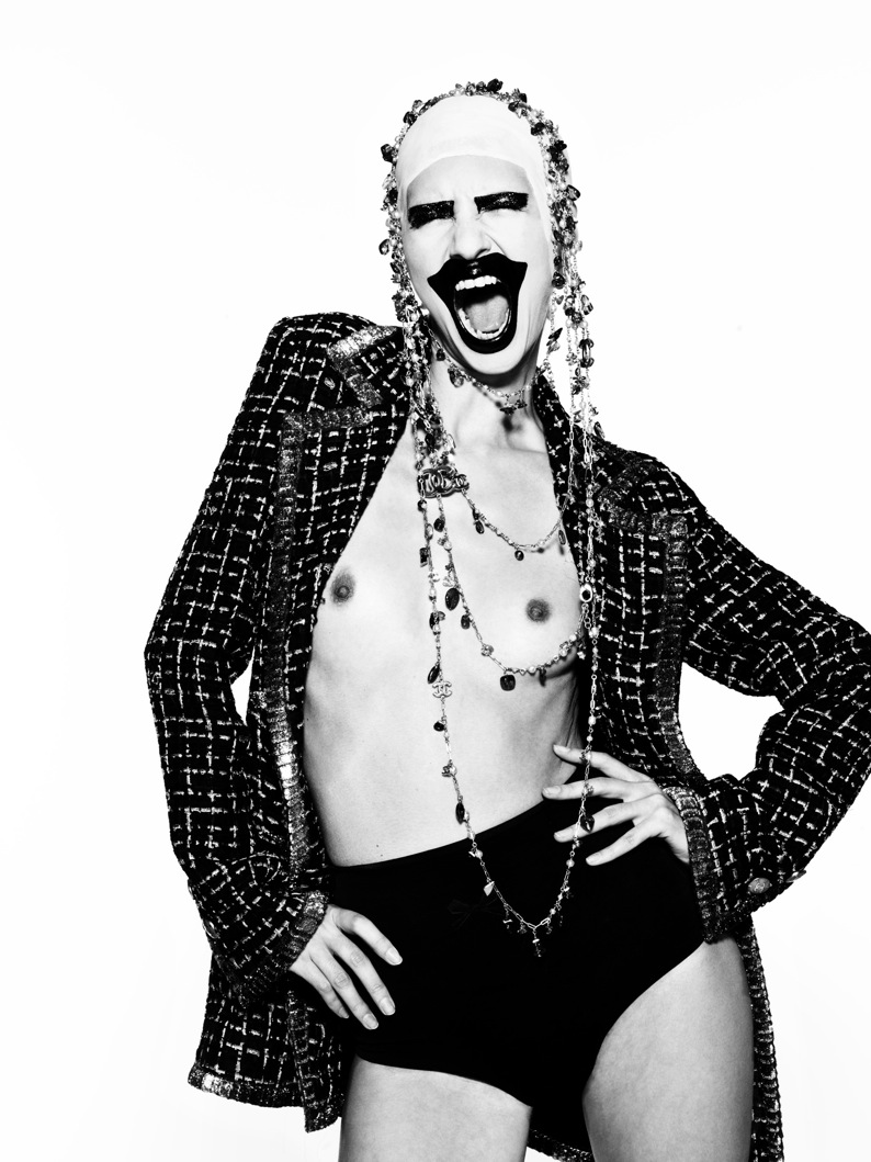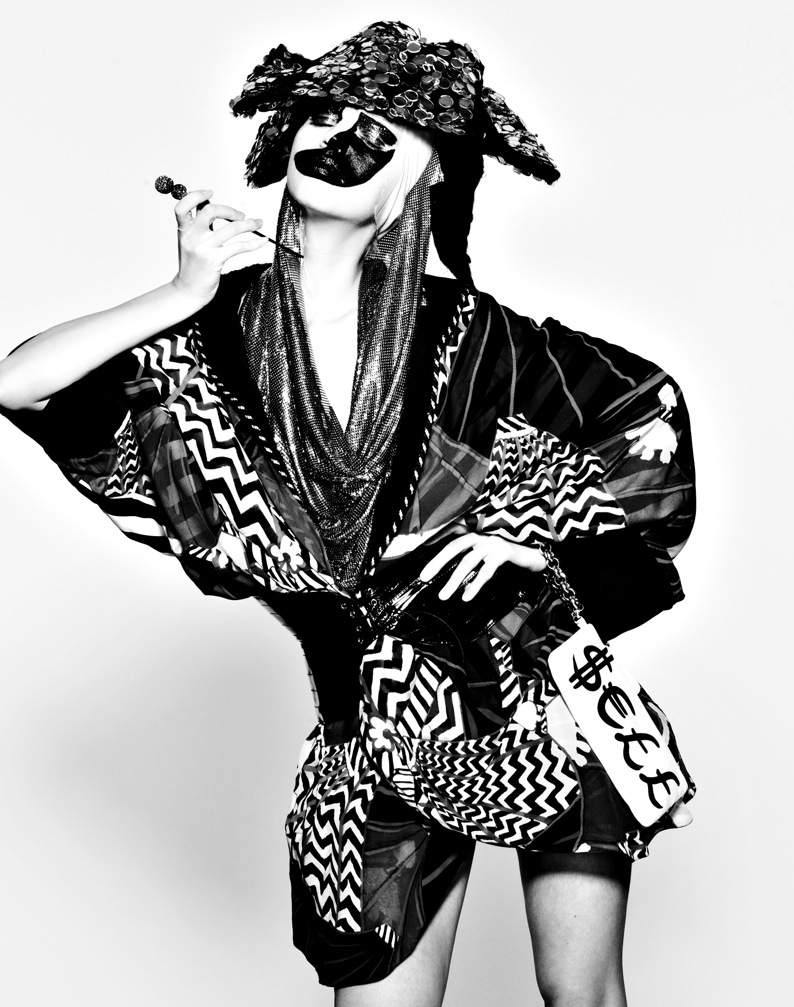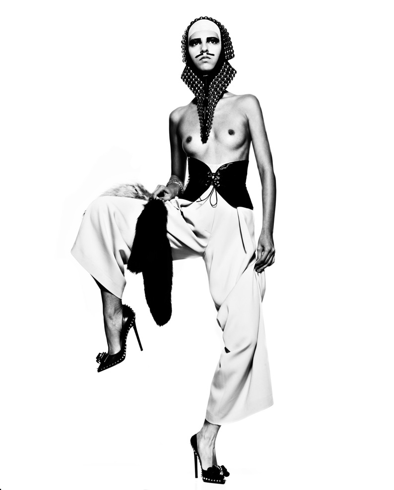 Top by JOSEP FONT; black pants by LA PERLA; metal armour and metal eye patch by AND.I; leather legs by JEAN CLAUDE JITROIS; leather metal shoes by TSURU BY ALESSANDRA STELLA
