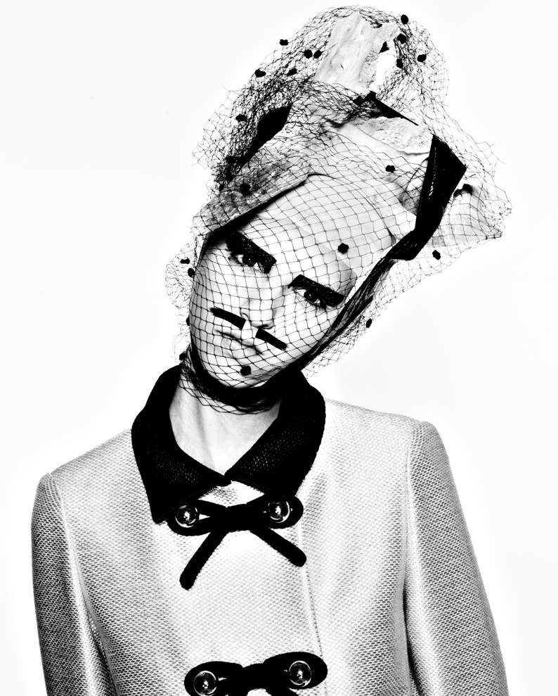 Gold coat by MOSCHINO; veil hat and skull stylist’s own.