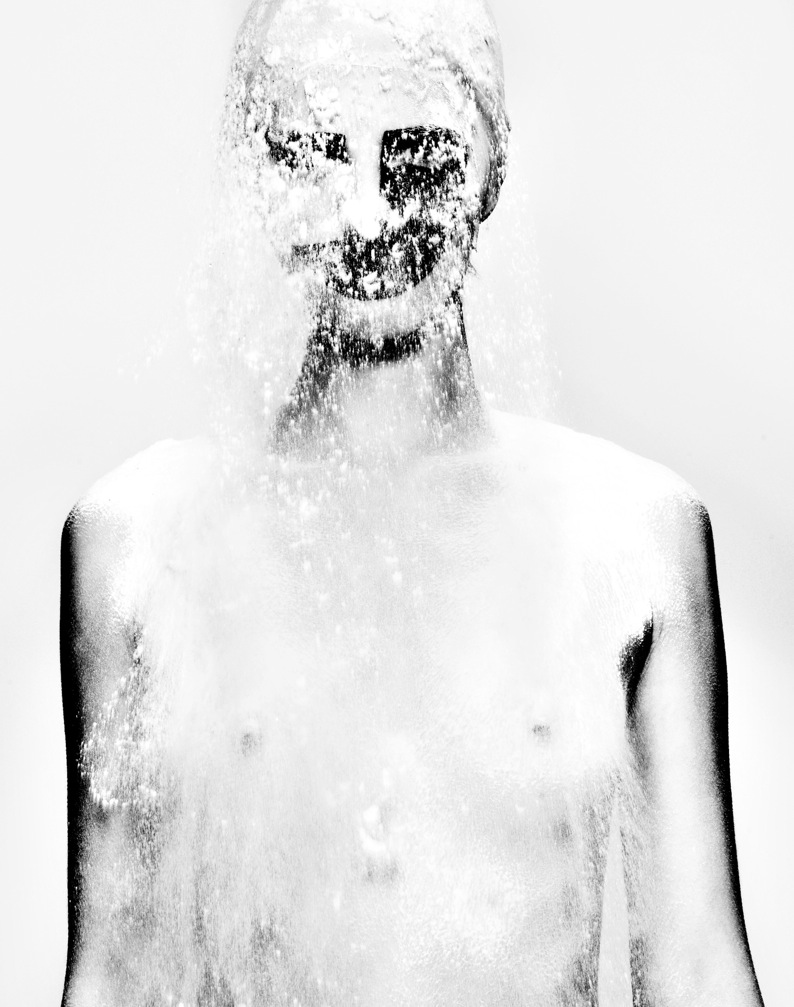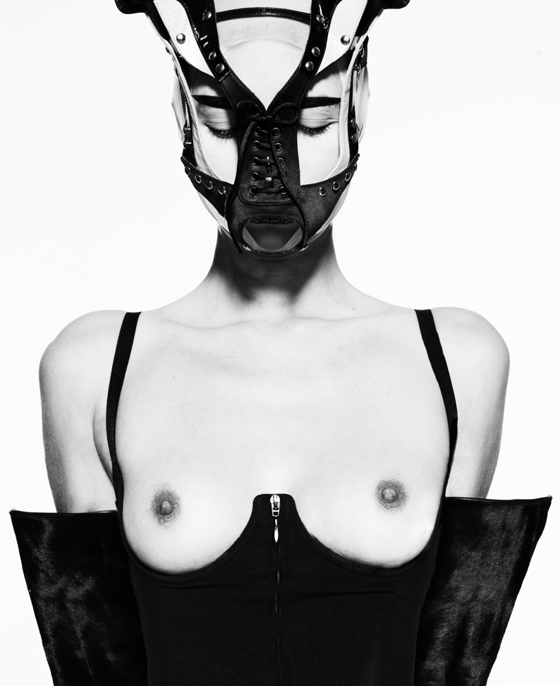 “Wings” by EVA MINGE; black panties by LA PERLA; leather and metal belt by HELENE PONOT; stockings by FALKE; leather and metal shoes by TSURU BY ALESSANDRA STELLA; metal mask by AND.I.