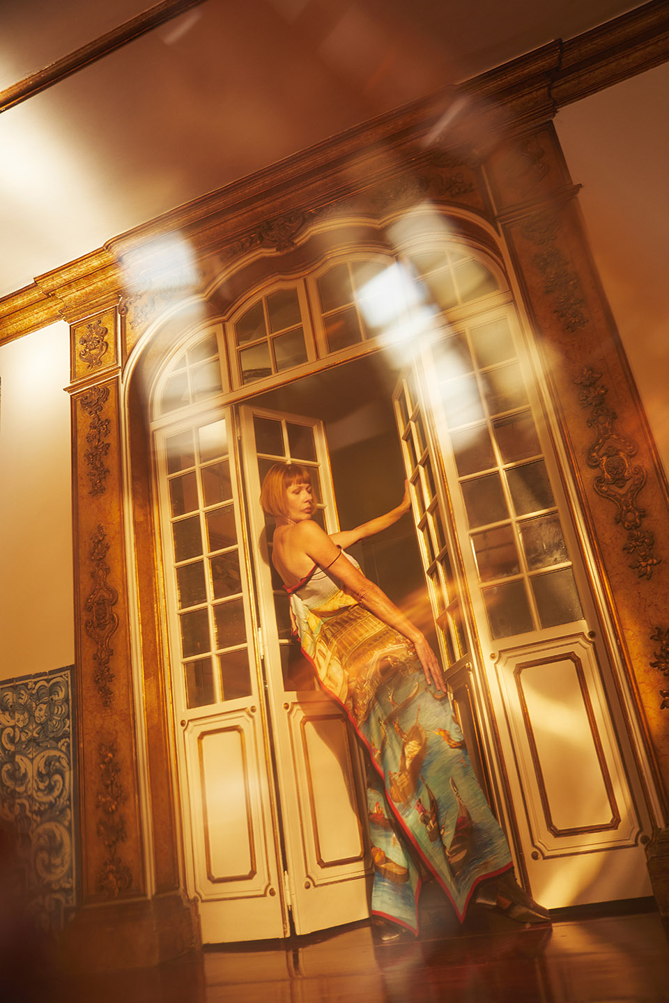 The photoshoot was done at the Palácio Cabral, next to Igreja de Santa Catarina. Defined by decorative art and adorned inside out with Portuguese tiles, it is a striking example of urban architecture from the first half of the 18th century—and a dreamy place to photograph Zoë in some of Filipe’s signature looks.