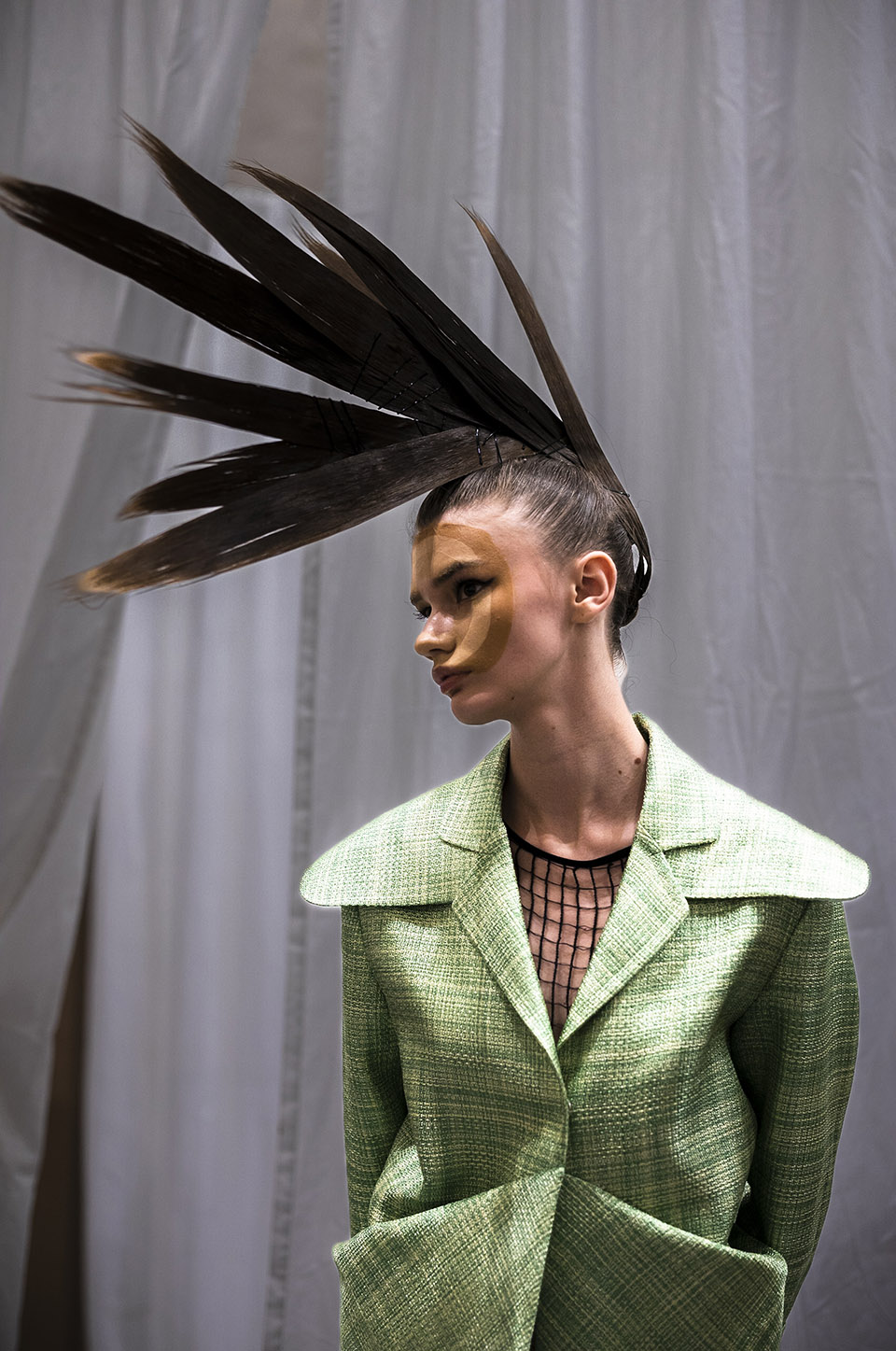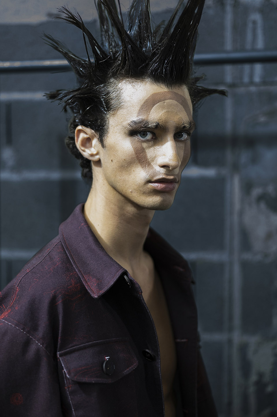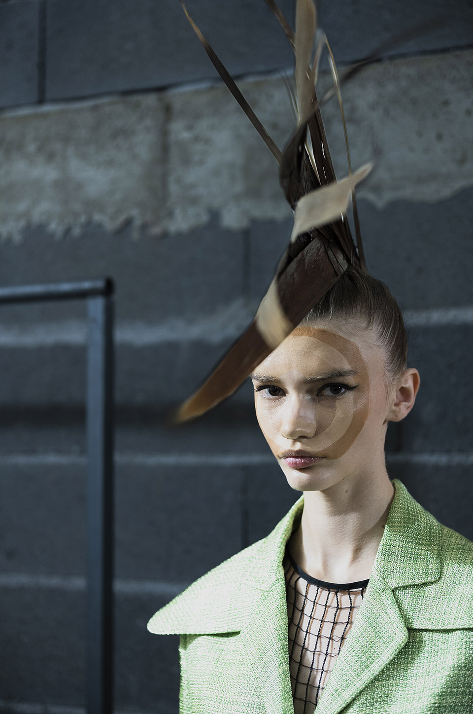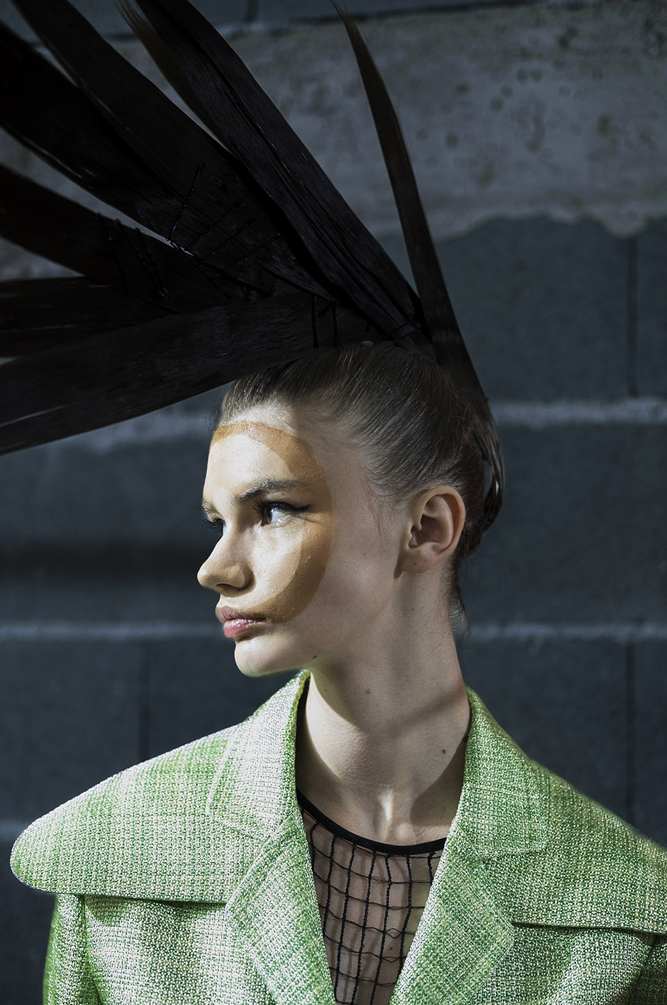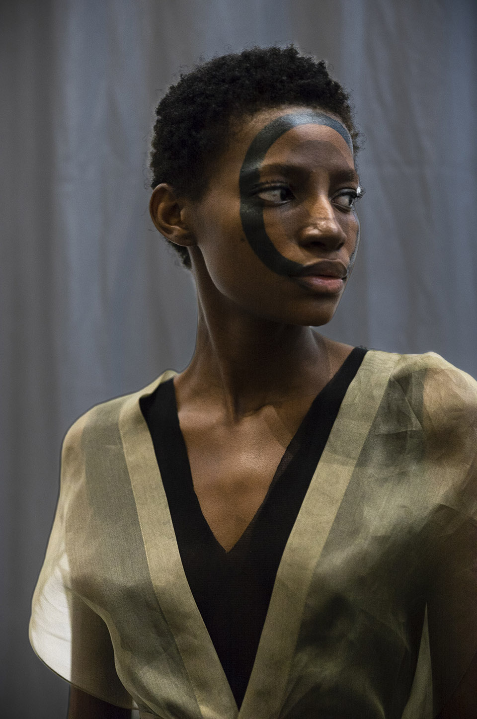 ANTONIA ROSA: Lidija wanted three-dimensional faces but subtly… without it being too obvious. This is why I created this optical illusion with the circles. I used skin coloured foundation in different tones from Clarins for the 3D effect.