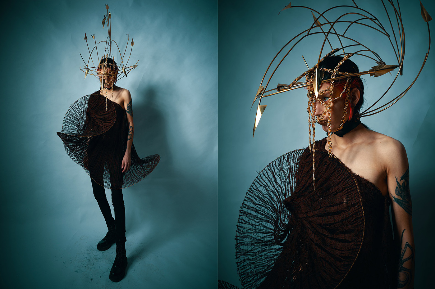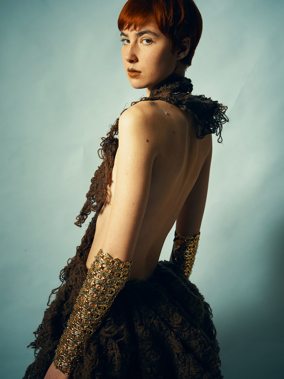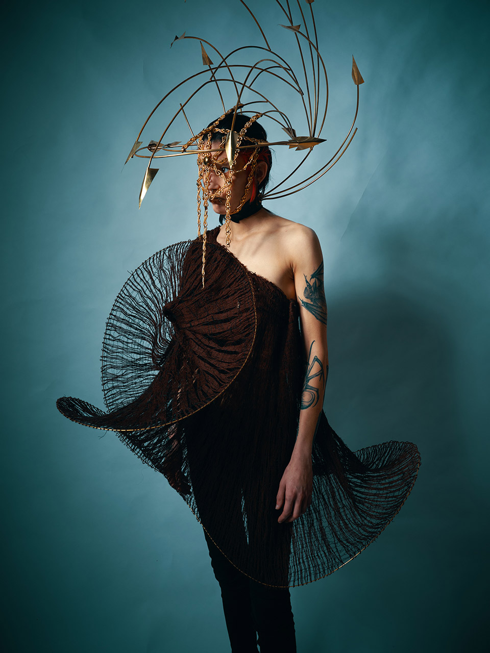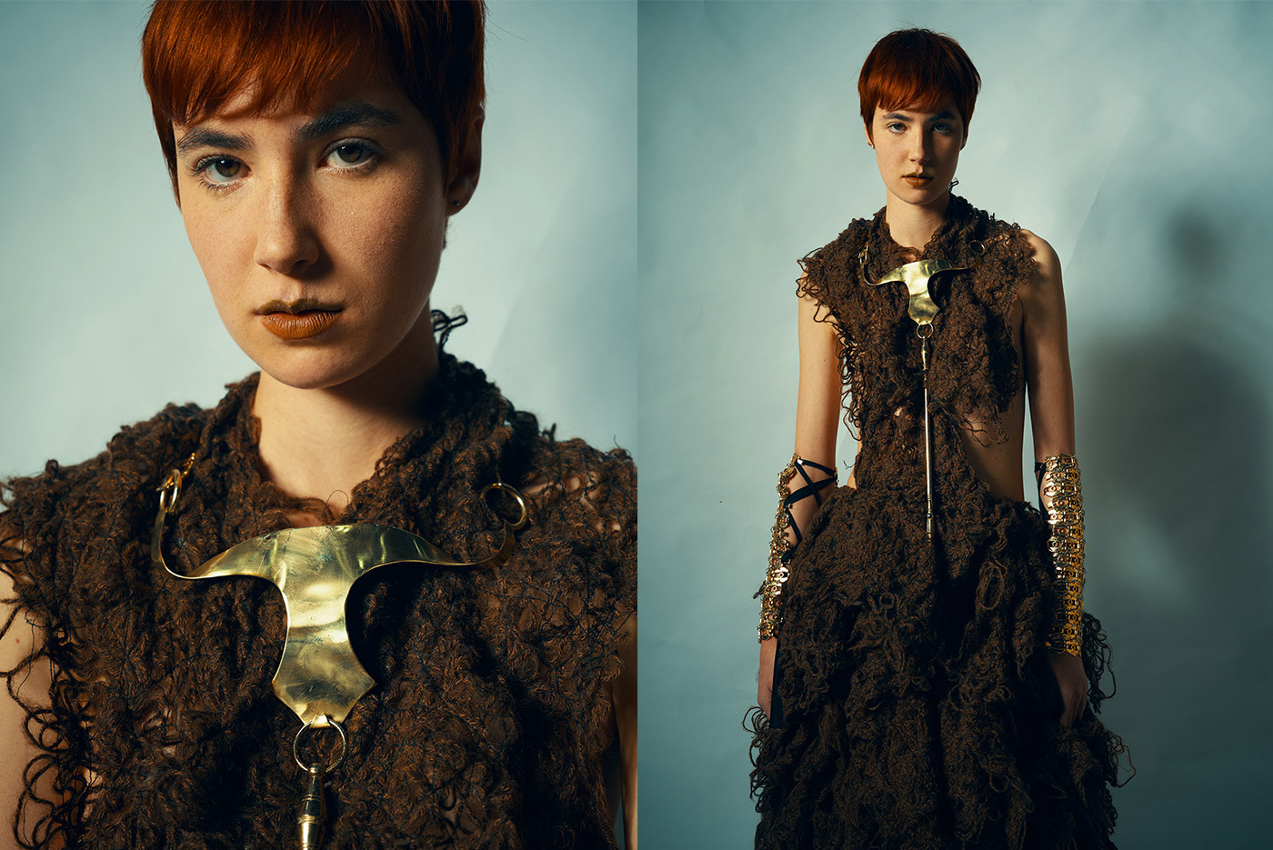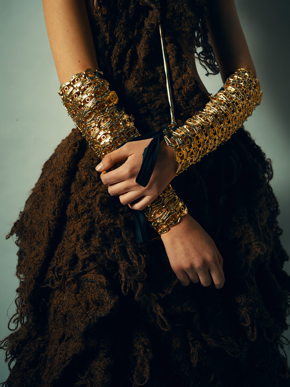 The assortment of deconstructed fabrics was another hallmark of the Mythology collection. Using manual textile manipulation techniques stabilized with a hydrosoluble film traditionally used for embroidery, Valentim created reimagined textures in wool and other fabrics. Here there is an interesting anti-reference to the industrial revolution—a borrowing of the Victorian fashion forms while discarding the machine-made textiles. In the looks, we see the technique applied both in draped, fitted dresses, full tops and in a tangled yarn-ball oversized scarf, wrought with golden wires. The manipulated threads and the balls of yarn bring us back to the myth of the Labyrinth, in which Ariadne, the daughter of King Minos, falls in love with Theseus, a Greek hero who comes to Crete to slay the Minotaur, and gives him a ball of yarn to unwind as he enters the Labyrinth and then use as an escape route in the end. And of course, the nod to the Minotaur would not be complete without oversized golden septum rings accompanying many of the looks.