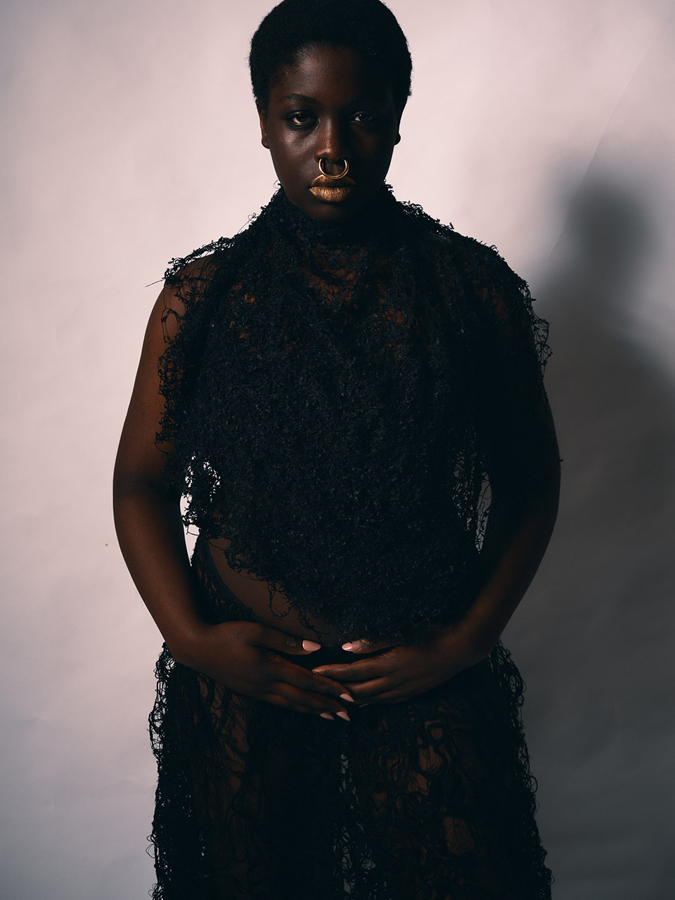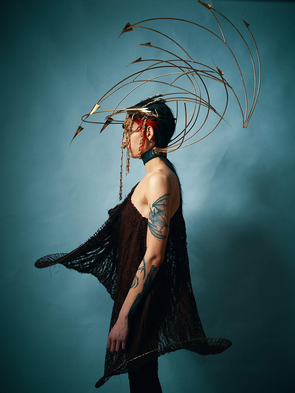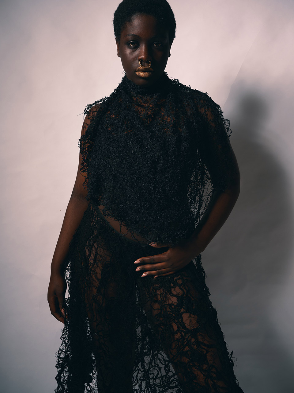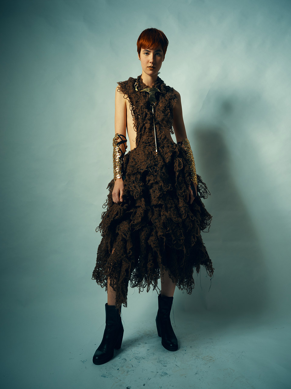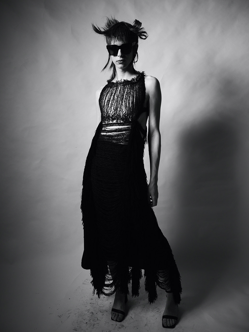 The assortment of deconstructed fabrics was another hallmark of the Mythology collection. Using manual textile manipulation techniques stabilized with a hydrosoluble film traditionally used for embroidery, Valentim created reimagined textures in wool and other fabrics. Here there is an interesting anti-reference to the industrial revolution—a borrowing of the Victorian fashion forms while discarding the machine-made textiles. In the looks, we see the technique applied both in draped, fitted dresses, full tops and in a tangled yarn-ball oversized scarf, wrought with golden wires. The manipulated threads and the balls of yarn bring us back to the myth of the Labyrinth, in which Ariadne, the daughter of King Minos, falls in love with Theseus, a Greek hero who comes to Crete to slay the Minotaur, and gives him a ball of yarn to unwind as he enters the Labyrinth and then use as an escape route in the end. And of course, the nod to the Minotaur would not be complete without oversized golden septum rings accompanying many of the looks.