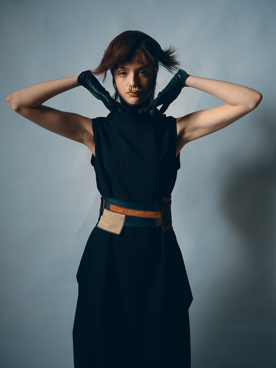A common theme in Valentim’s collection is the use of patchwork, seen throughout in an array of earthy and cool-toned colours on squared midi dresses, cut-out sweatshirts and, more discreetly, in the accessories. The resulting patterns play on the classic imagery of the myth of the Labyrinth built by King Minos of Crete to imprison the Minotaur, a half-man/half-beast monster. Just as there exist many versions of the myth, so too do we see different versions of the motif in Valentim’s collection, such as the mosaic fabric that draws inspiration from Piet Mondrian, a Dutch abstract painter who came of age at the end of the Victorian era and was known for his grid-based paintings. With the Mondiran-esque prints and the Victorian references that crop up in A-line skirts, sleeveless tops, an embellished asymmetrical hat and the closing dress of the collection, Valentim adds a more contemporary twist to the mythological theme.