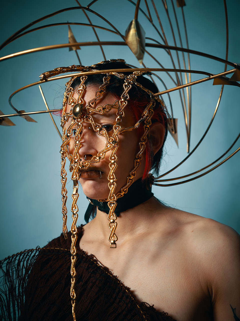 The god Apollo was often depicted wearing a golden wreath on his head, while the goddess Aphrodite was said to have worn gold jewelry that enhanced her beauty. Borrowing from these mythological tropes, golden jewellery and embellishments played a significant role in the collection. Given his background as a jewellery and accessories designer, Valentim—much like Midas—incorporated gold elements in his craftsmanship to symbolize the power of the divine. Intricate golden headpieces that were both treacherous and stunning and body jewellery reminiscent of armour closed the show to a captivated audience.