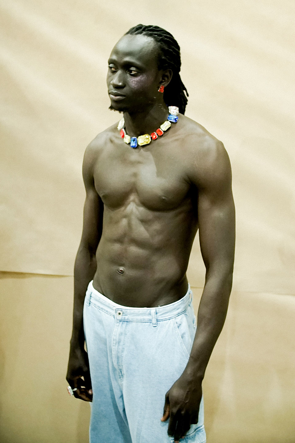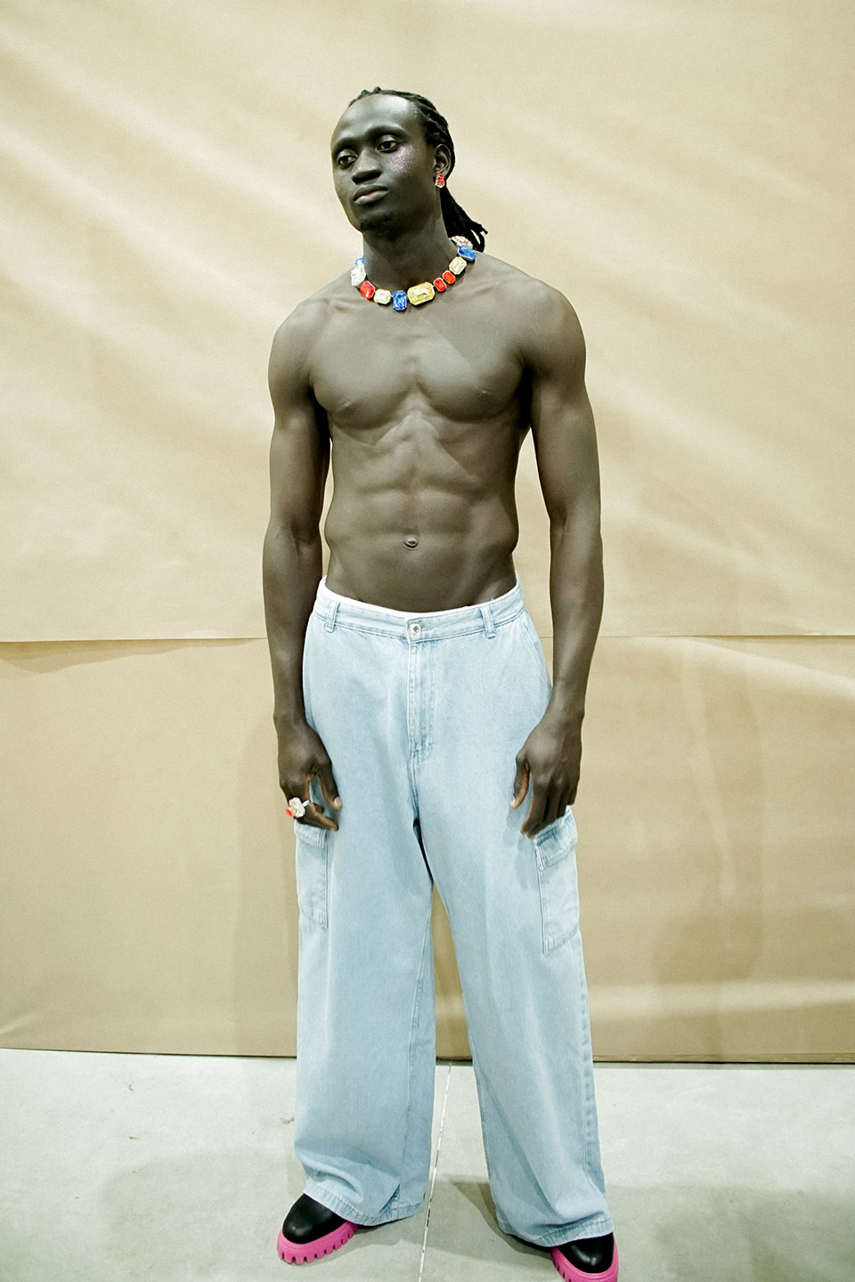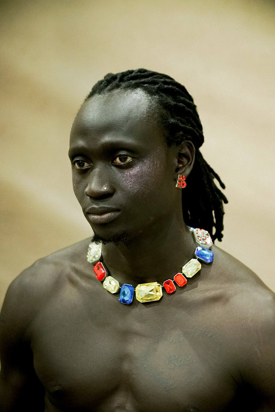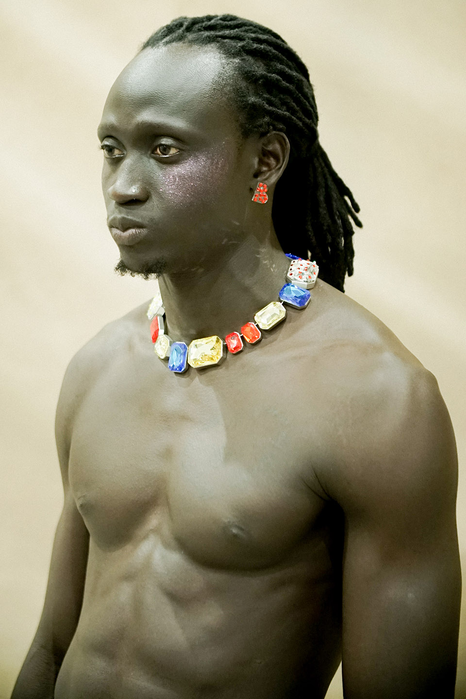 While the past collection had a sexy and attitude-filled approach, with the pieces shining over glistening naked torsos and black latex looks, this time Luis Borges brought his designs to streetwear. From chunky pearl necklaces to long drop earrings, each piece made a statement on its own while also enhancing the more casual denim trousers with white, blue and warm-tone tops.