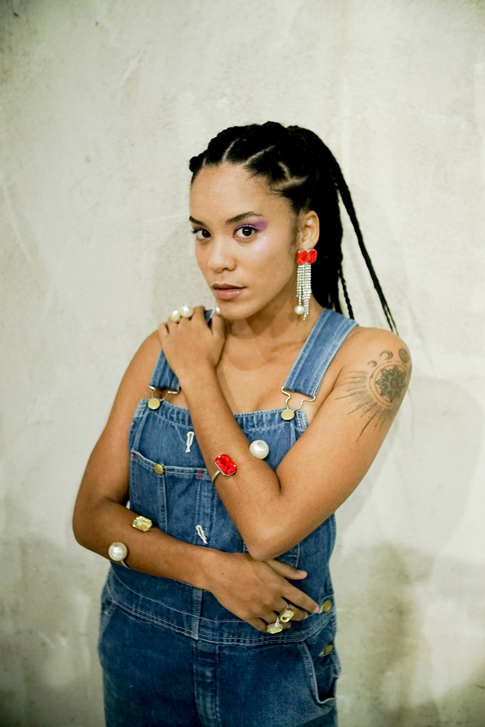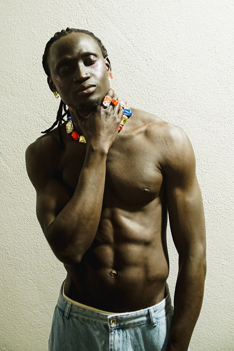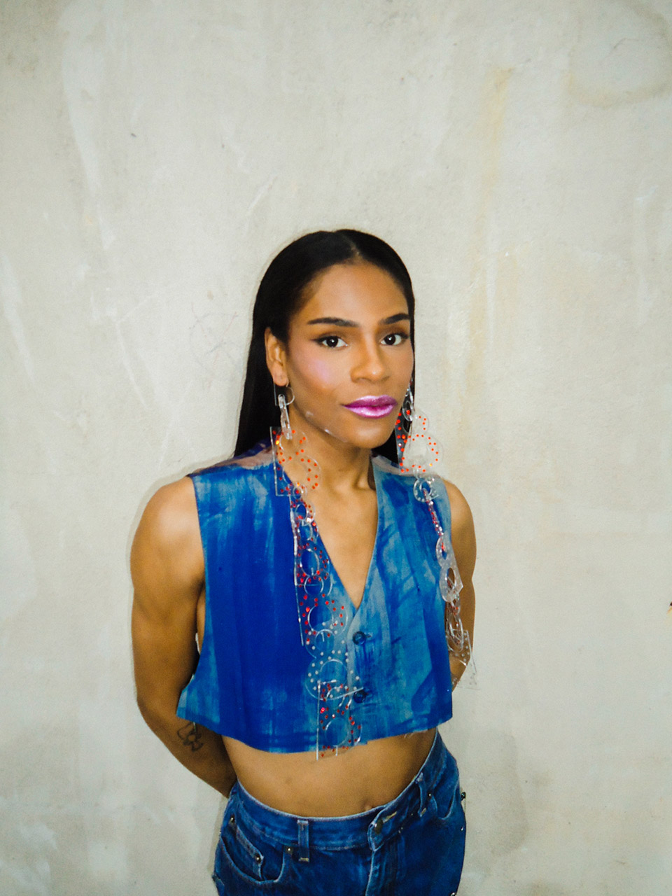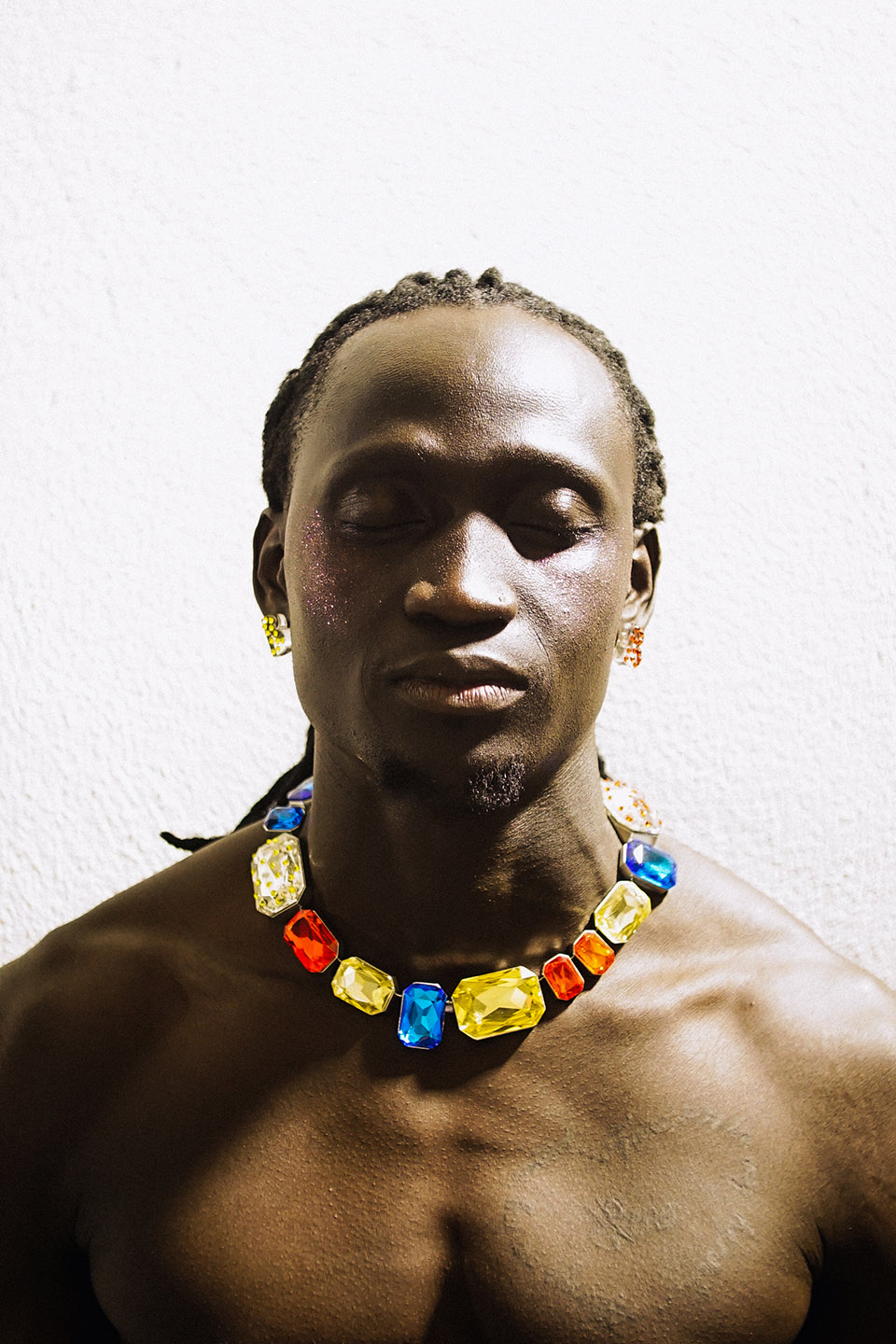 While the past collection had a sexy and attitude-filled approach, with the pieces shining over glistening naked torsos and black latex looks, this time Luis Borges brought his designs to streetwear. From chunky pearl necklaces to long drop earrings, each piece made a statement on its own while also enhancing the more casual denim trousers with white, blue and warm-tone tops.