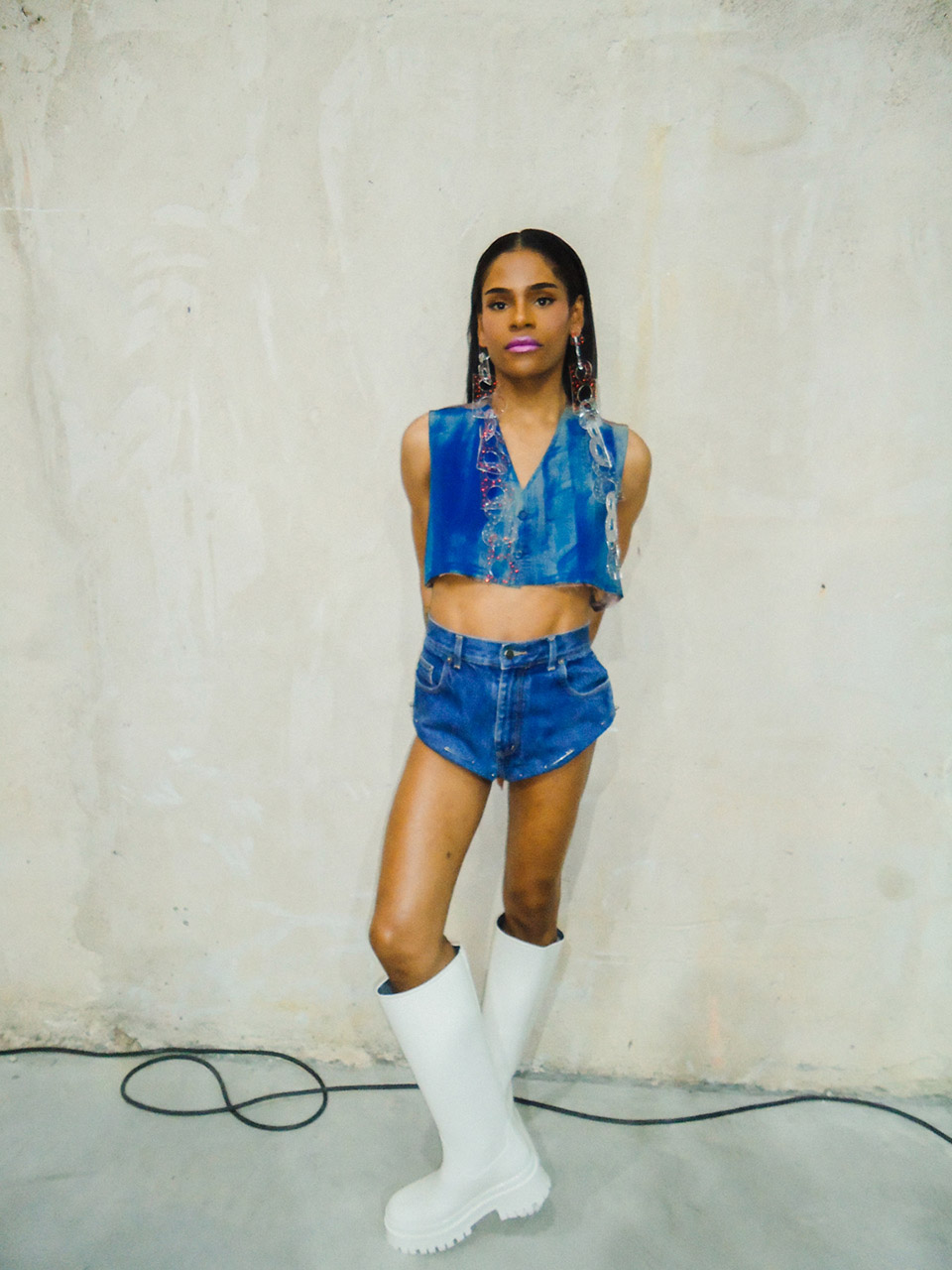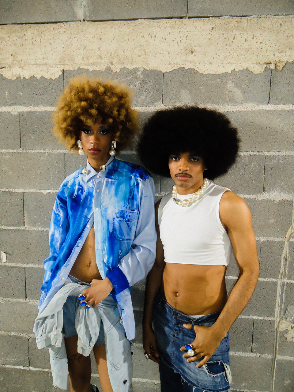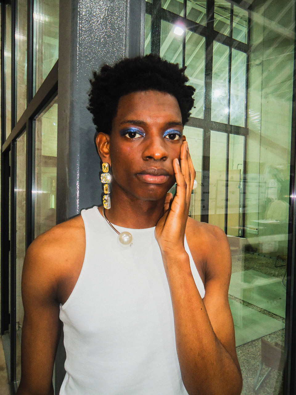 Joyfully gliding and spinning down the runway in her famous roller skates and Britney Spears-inspired blonde wig, street artist Eubrite set the tone for the Call Me Gorgeous FW23 collection. Following his past SS23 runway show that featured contemporary dancers taking over the catwalk to showcase his rhinestone-embellished jewelry, once again founder and creative director Luis Borges delivered an exciting show that even featured a performance