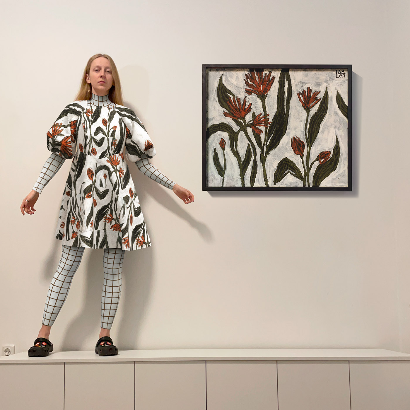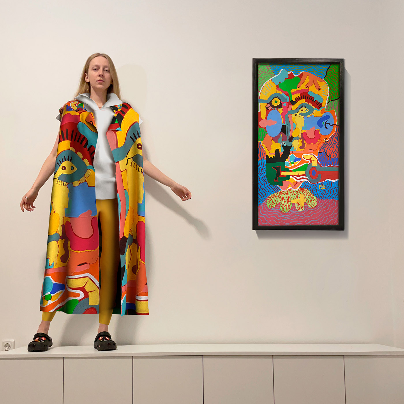 Alena’s artworks immediately inspired me to the collection. I intentionally made a lot of body-length details, because my idea was to show her artworks in full size and even bigger than the original paintings. I wanted to create a feeling of being enveloped with the colors.