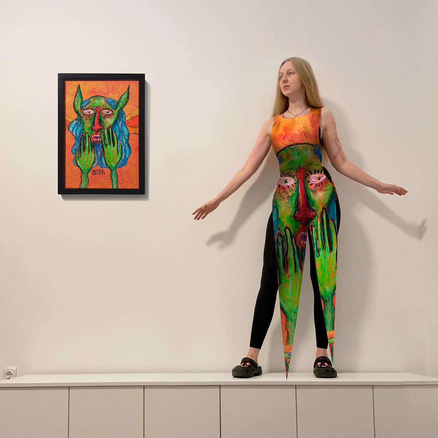 Circus Lab a creative director Julie Circus and artist Alèna Kotovskaya, long-time friends and now creative collaborators, combined their chosen mediums to transform Alèna’s paintings into wearable fashion. Julie is a fashion designer and 3D artist, and Alèna’s paintings, known for their dynamic colors and emotive qualities, are a key element in their artistic exploration. Alèna not only provides her artwork but also models the creations, adding a personal touch to the project. Their objective is to bridge the gap between art and fashion, making it accessible and wearable for everyone. Their collaboration showcases how art and technology can merge seamlessly with fashion.