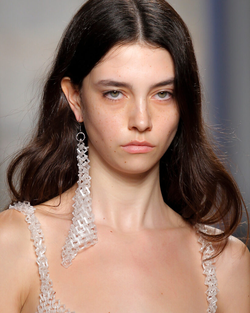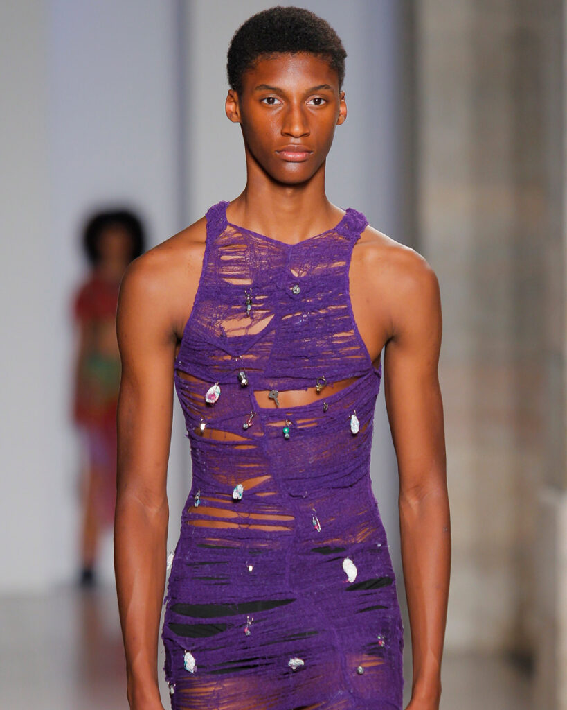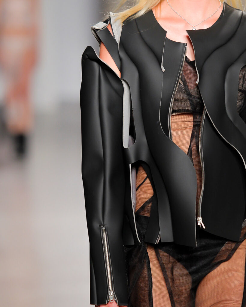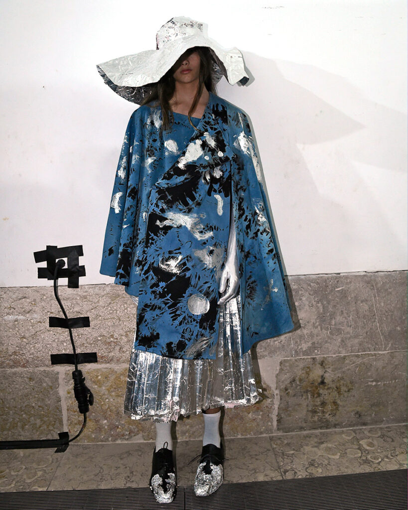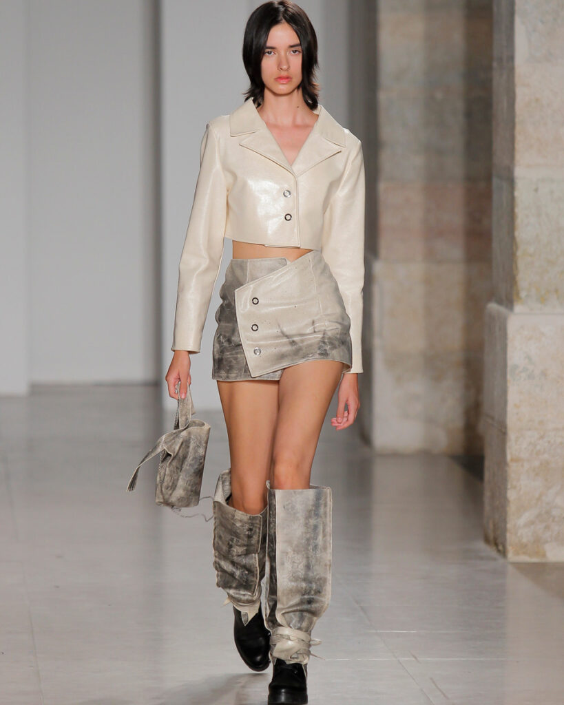 Isza’s “Dust in My Hand” collection showcases her ability to blend distinct elements in fashion. Drawing inspiration from everyday life and the ceaseless evolution of technology, this collection bridges these divergent worlds through a palette of neutral and darker tones. It incorporates plasticized and wet textures, intricate leather cutouts, and knit garments reminiscent of ancient chainmail. Isza’s innovative approach beautifully balances the traditions of fashion with a modern touch.