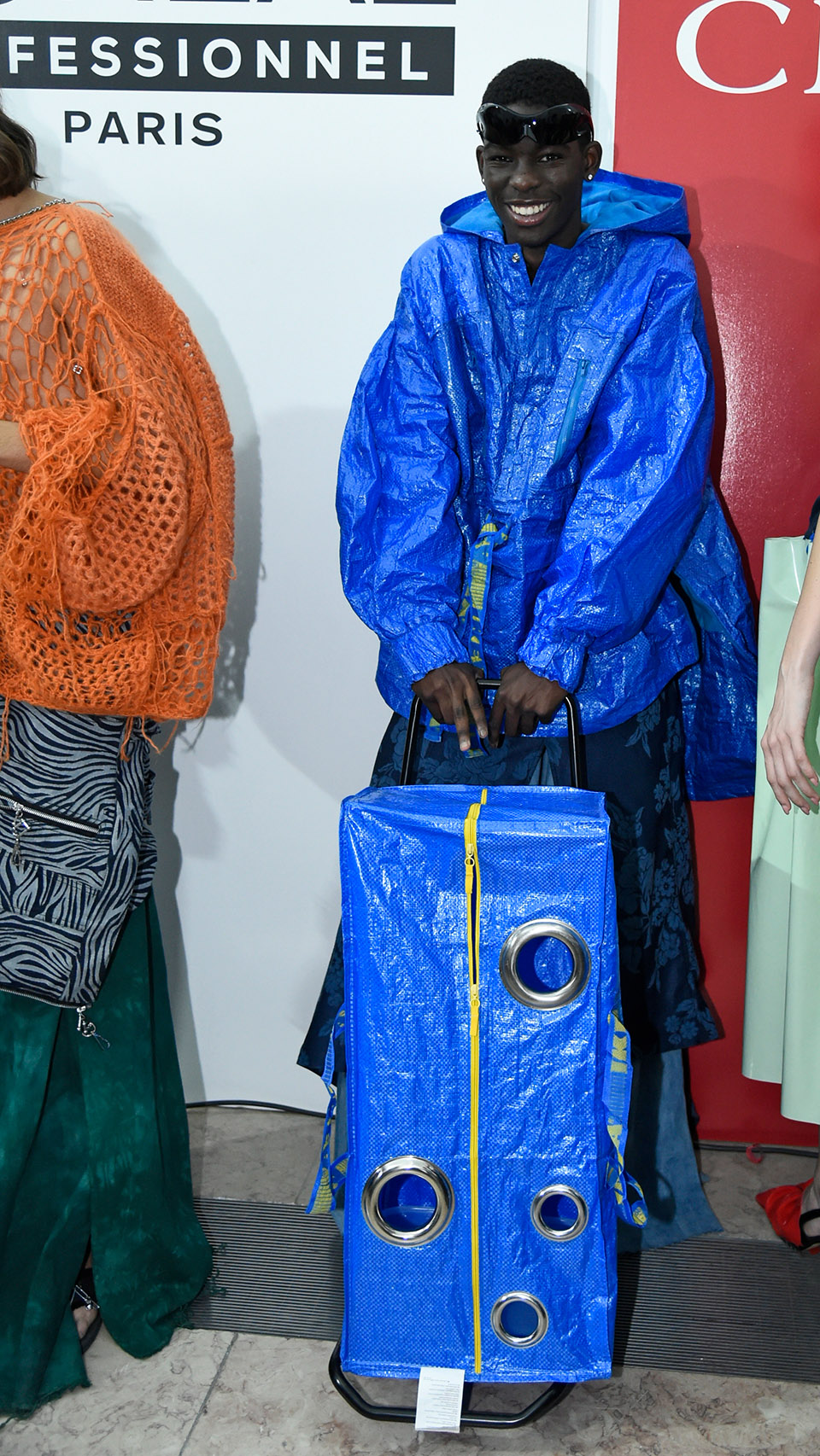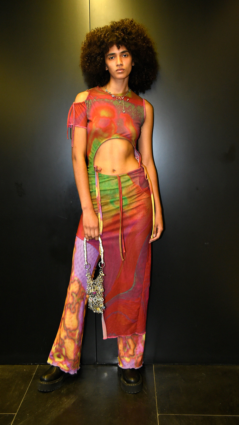 In the collection “A Sandes de Faraday”, Çal explores a unique concept, designing clothing that wraps individuals much like a sandwich. This collection features an eclectic range of items, from swords and bags filled with stars to weapons, cutlery, and robots. Presented in a silver-contaminated setting that symbolizes an arrival in an “unknown land,” the garments serve a dual purpose. The collection showcases vibrant colors and material contrasts, employing intricate, patterned designs that create a distinct connection between the pieces and the narrative. The interplay of metallic and dark elements infuses the collection with a youthful and playful essence, and Çal Pfungst stands out as an eagerly anticipated finalist in Sangue Novo.