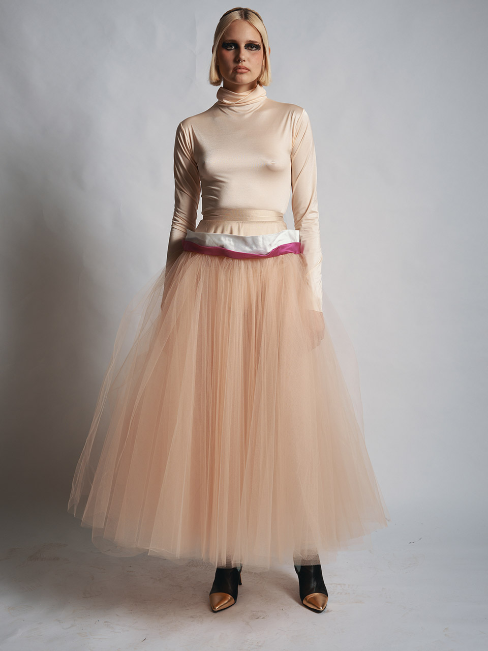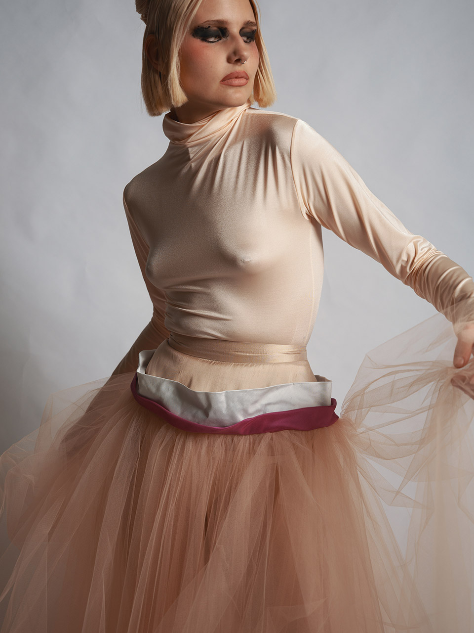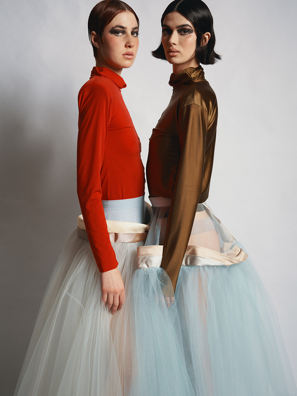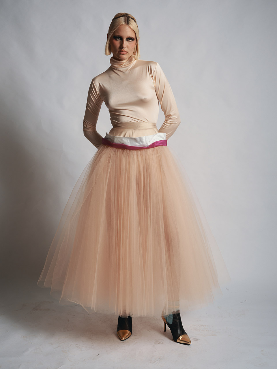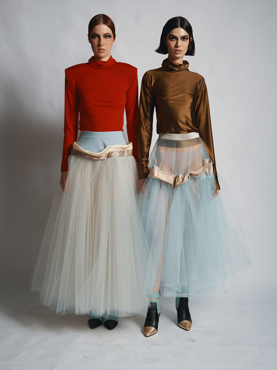 If we delve into the history of fashion, we can perceive that there has always been a strong desire to alter the body to “improve” it, often resorting to accessories for this purpose. Dino Alves, drawing from these 19th-century foundations, reinterprets them by incorporating them directly into the fabric of skirts, dresses, and trousers. Building upon this historical foundation, Dino crafts fresh and avant-garde silhouettes that exude a unique elegance, presenting a collection that transmutes the body’s innate silhouette. Draping techniques take center stage, and the spirit of crinolines infuses various aspects of garment construction. Wool, knits, tulle, denim, twill, organic cotton, poplin, vinyl, georgette, organza, viscose, and quilted textures emerge in a harmonious palette of colors: black, nude, white, blue, yellow, pink, pale salmon, and lilac.