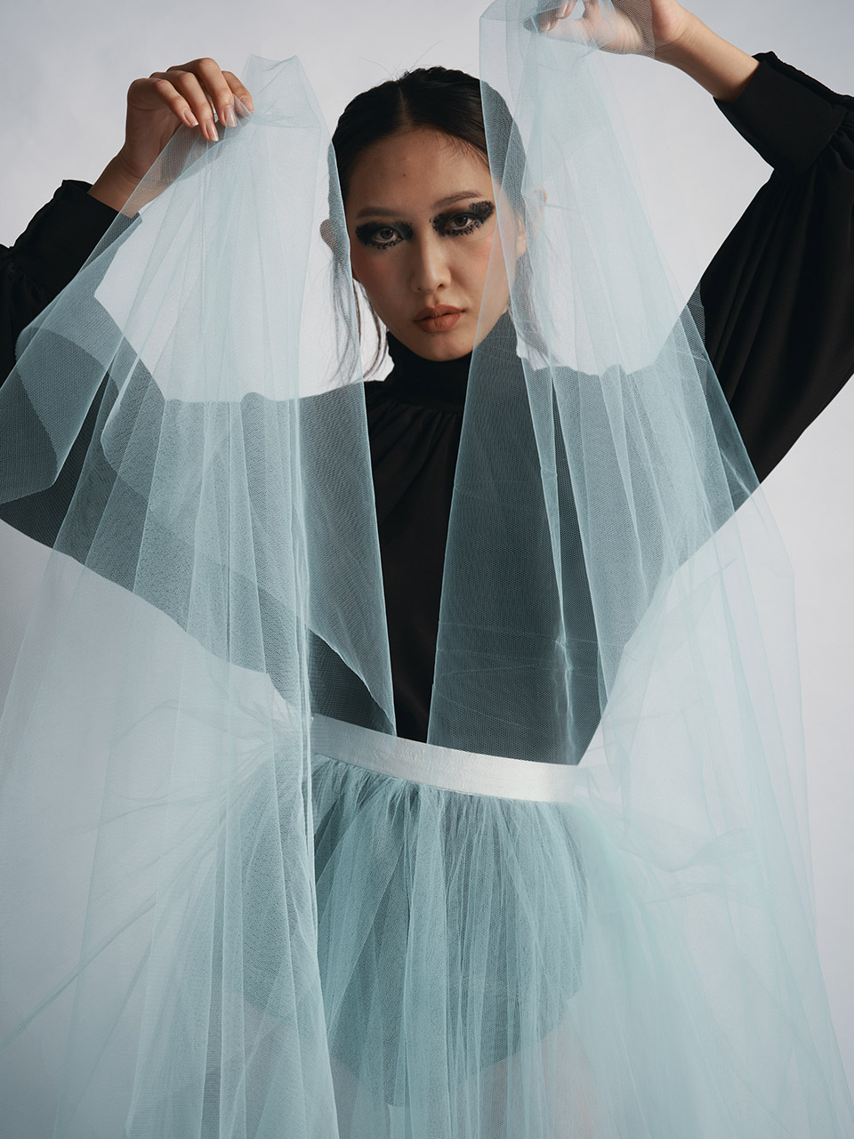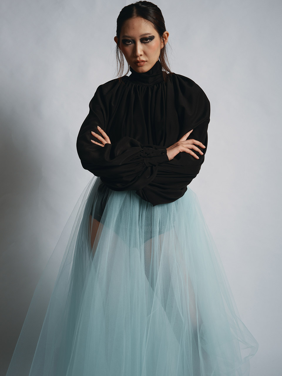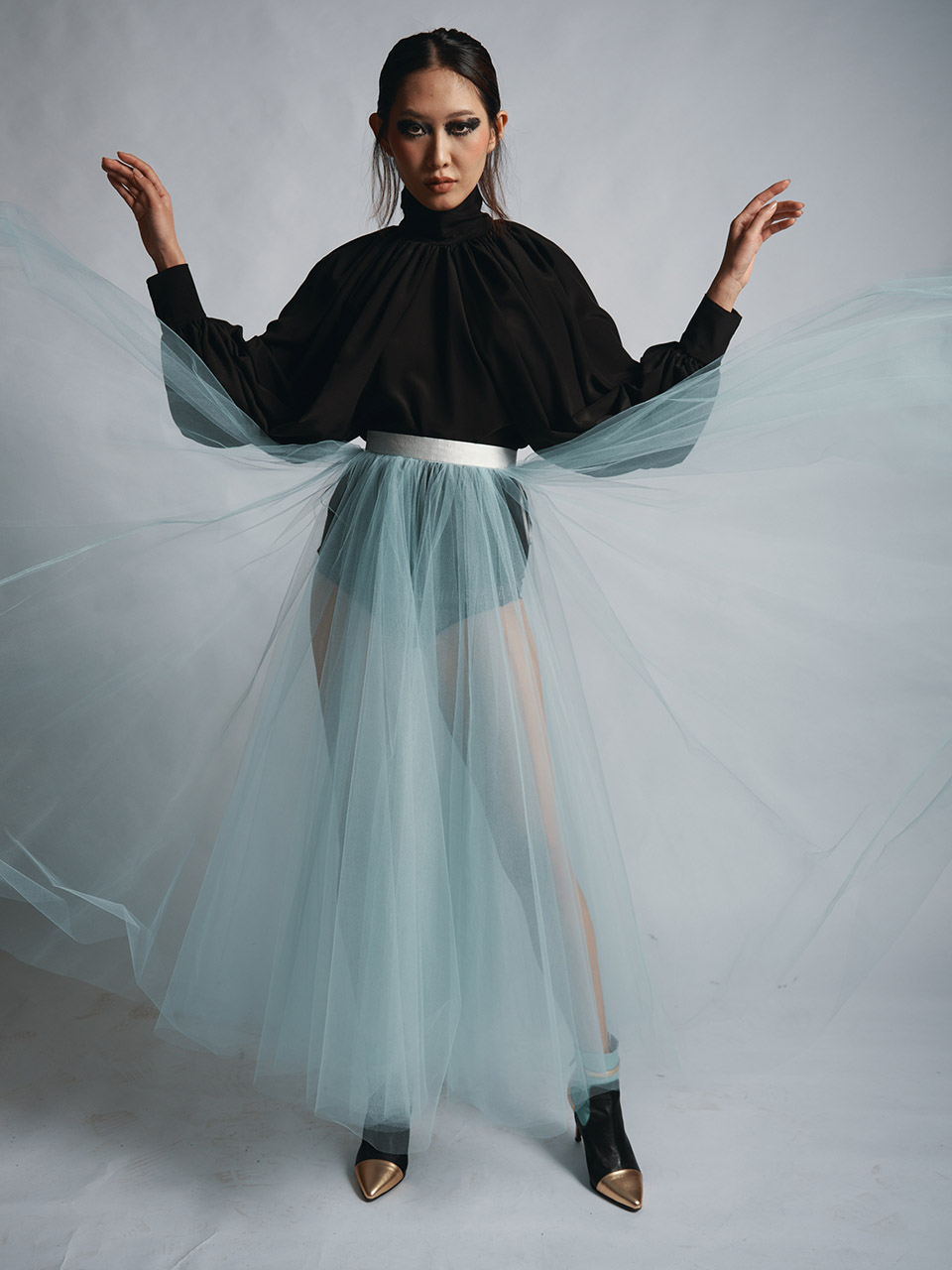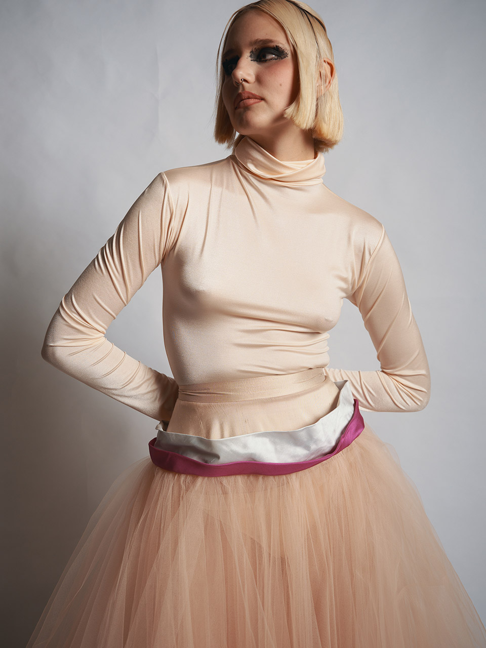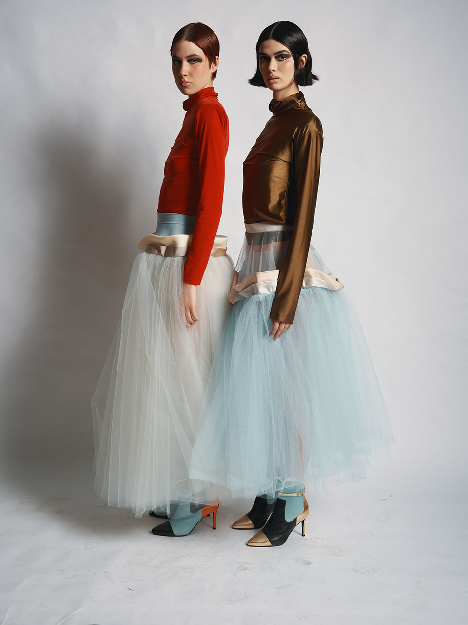 If we delve into the history of fashion, we can perceive that there has always been a strong desire to alter the body to “improve” it, often resorting to accessories for this purpose. Dino Alves, drawing from these 19th-century foundations, reinterprets them by incorporating them directly into the fabric of skirts, dresses, and trousers. Building upon this historical foundation, Dino crafts fresh and avant-garde silhouettes that exude a unique elegance, presenting a collection that transmutes the body’s innate silhouette. Draping techniques take center stage, and the spirit of crinolines infuses various aspects of garment construction. Wool, knits, tulle, denim, twill, organic cotton, poplin, vinyl, georgette, organza, viscose, and quilted textures emerge in a harmonious palette of colors: black, nude, white, blue, yellow, pink, pale salmon, and lilac.