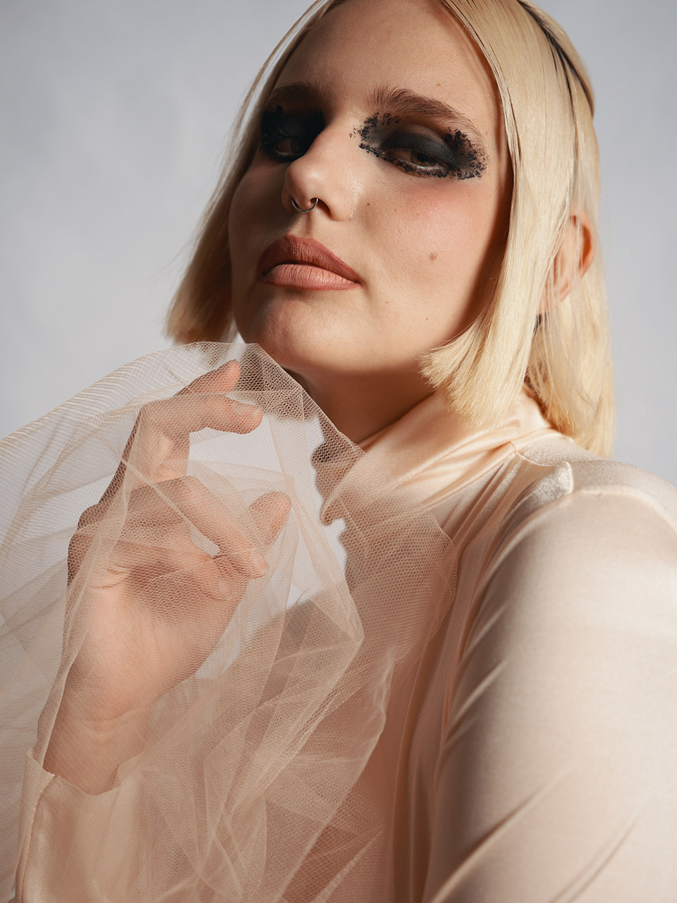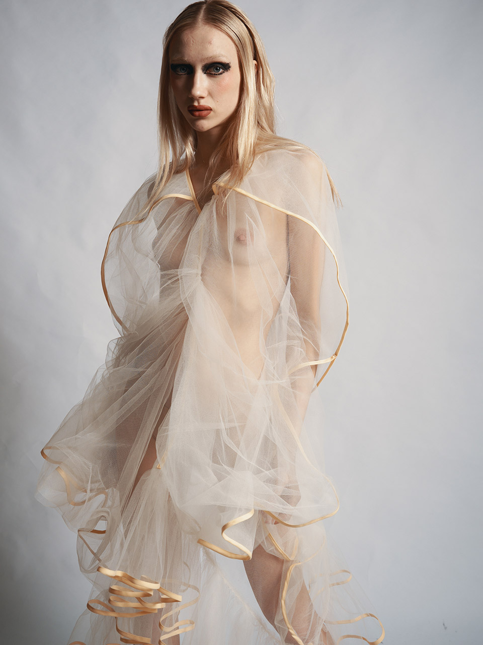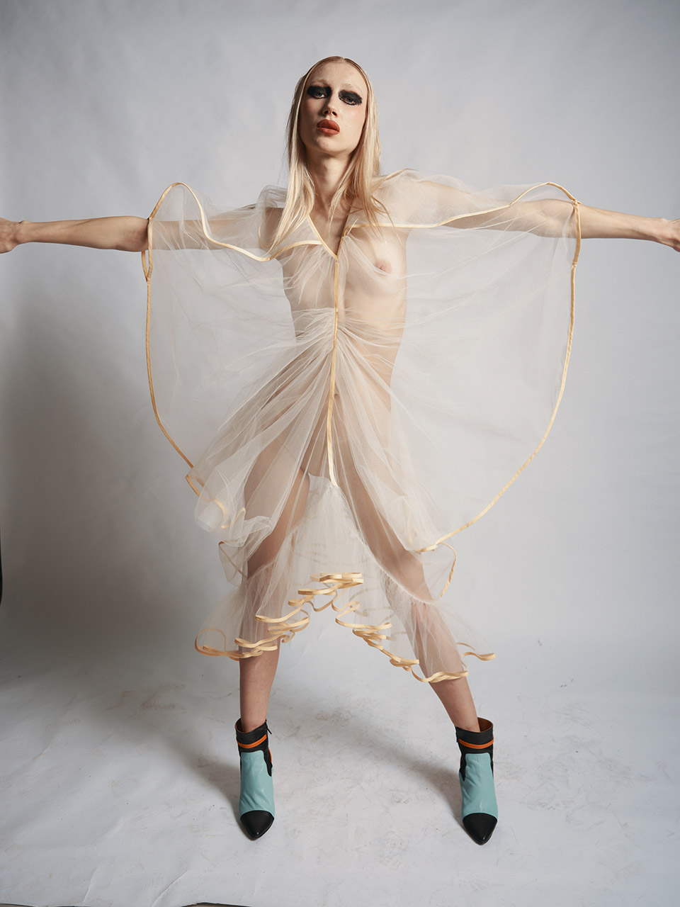 Dino Alves´ AW23/24 collection TRANS—FORM delves into the timeless human longing for transformation, especially when it comes to one’s physical presentation. It encompasses the creative process of trying out diverse hairstyles and hair colors, harnessing makeup as a medium for reshaping facial contours, and embracing attire that either accentuates or conceals the body’s natural shape. These metamorphoses resonate universally, fueled by the dynamic currents of fashion trends or, in its purest form, a personal journey towards self-acceptance, sometimes culminating in permanent modifications through plastic surgery.