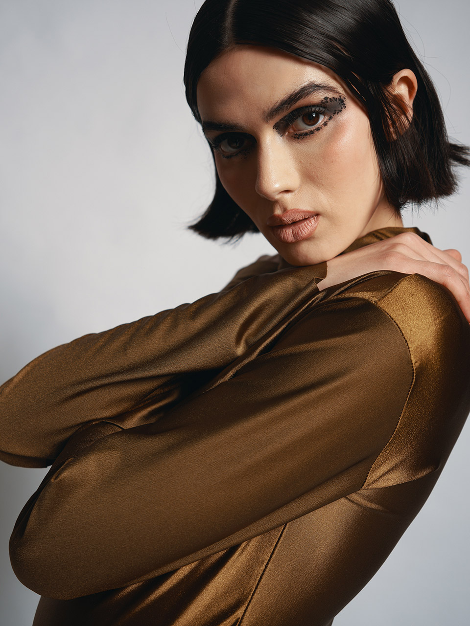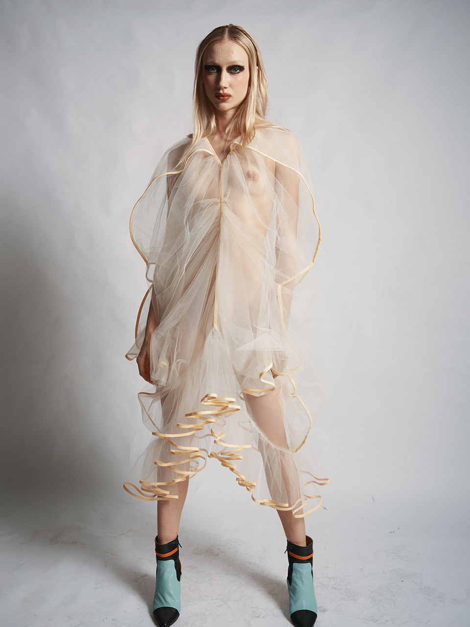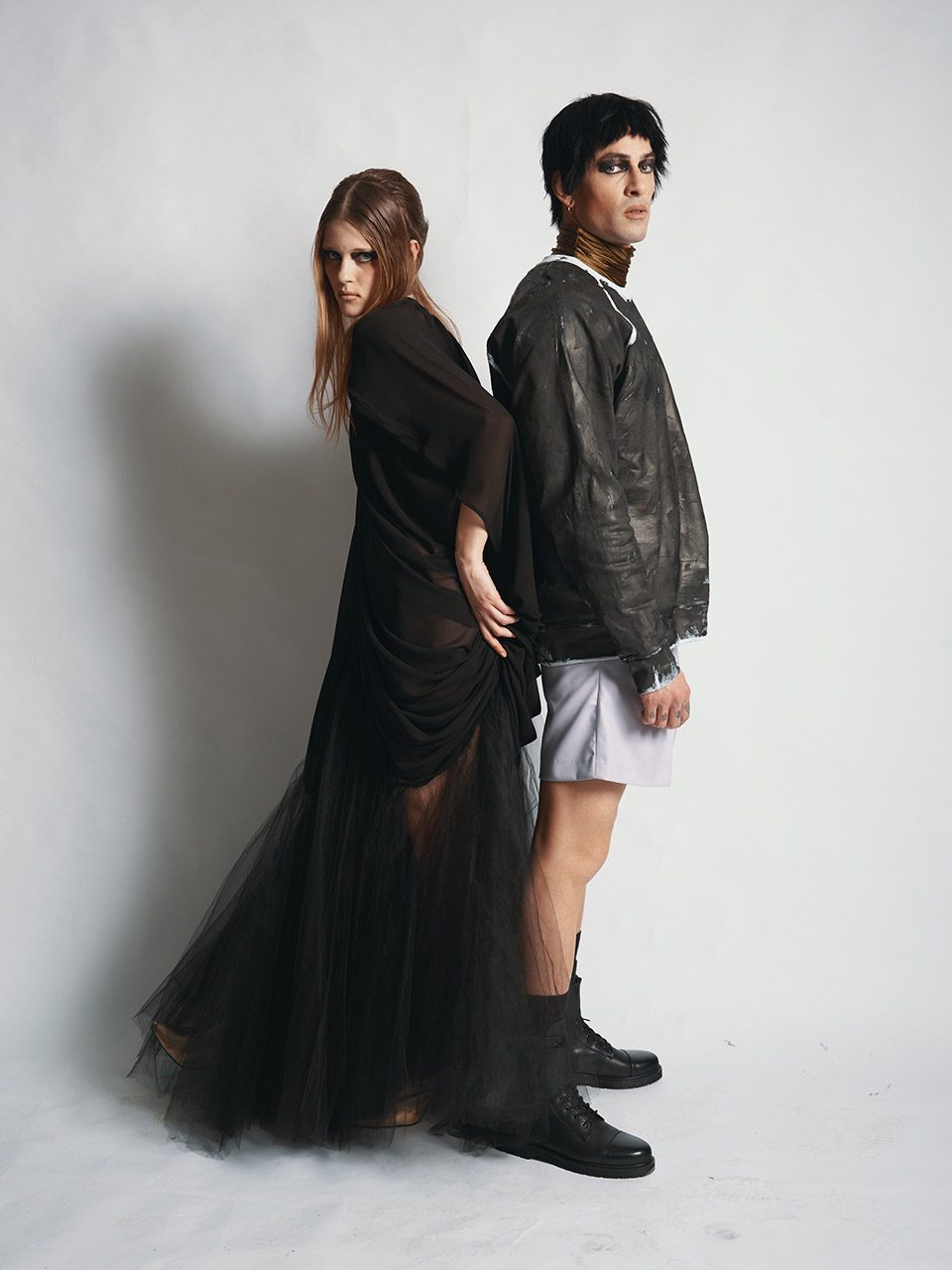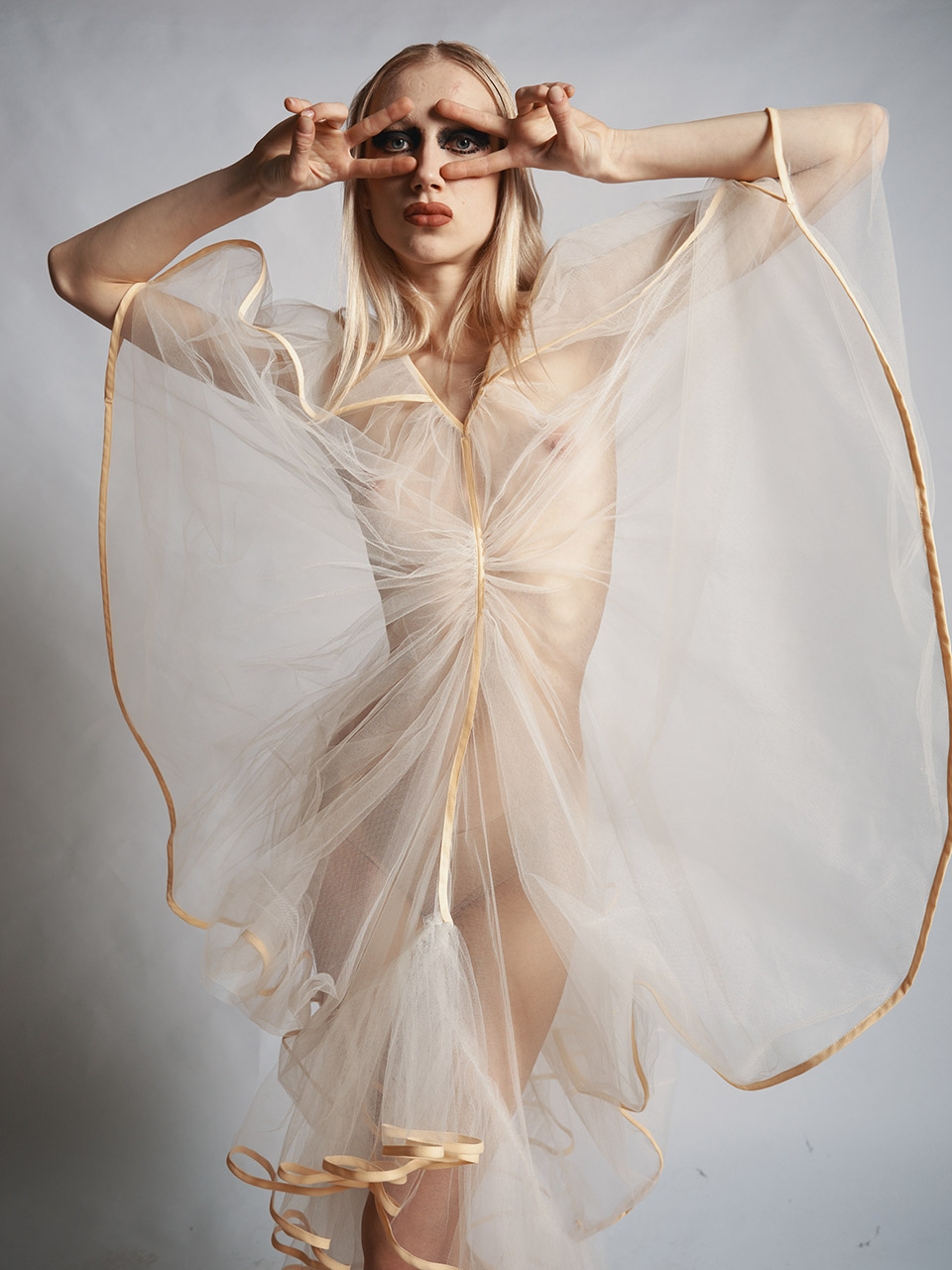 Dino Alves´ AW23/24 collection TRANS—FORM delves into the timeless human longing for transformation, especially when it comes to one’s physical presentation. It encompasses the creative process of trying out diverse hairstyles and hair colors, harnessing makeup as a medium for reshaping facial contours, and embracing attire that either accentuates or conceals the body’s natural shape. These metamorphoses resonate universally, fueled by the dynamic currents of fashion trends or, in its purest form, a personal journey towards self-acceptance, sometimes culminating in permanent modifications through plastic surgery.