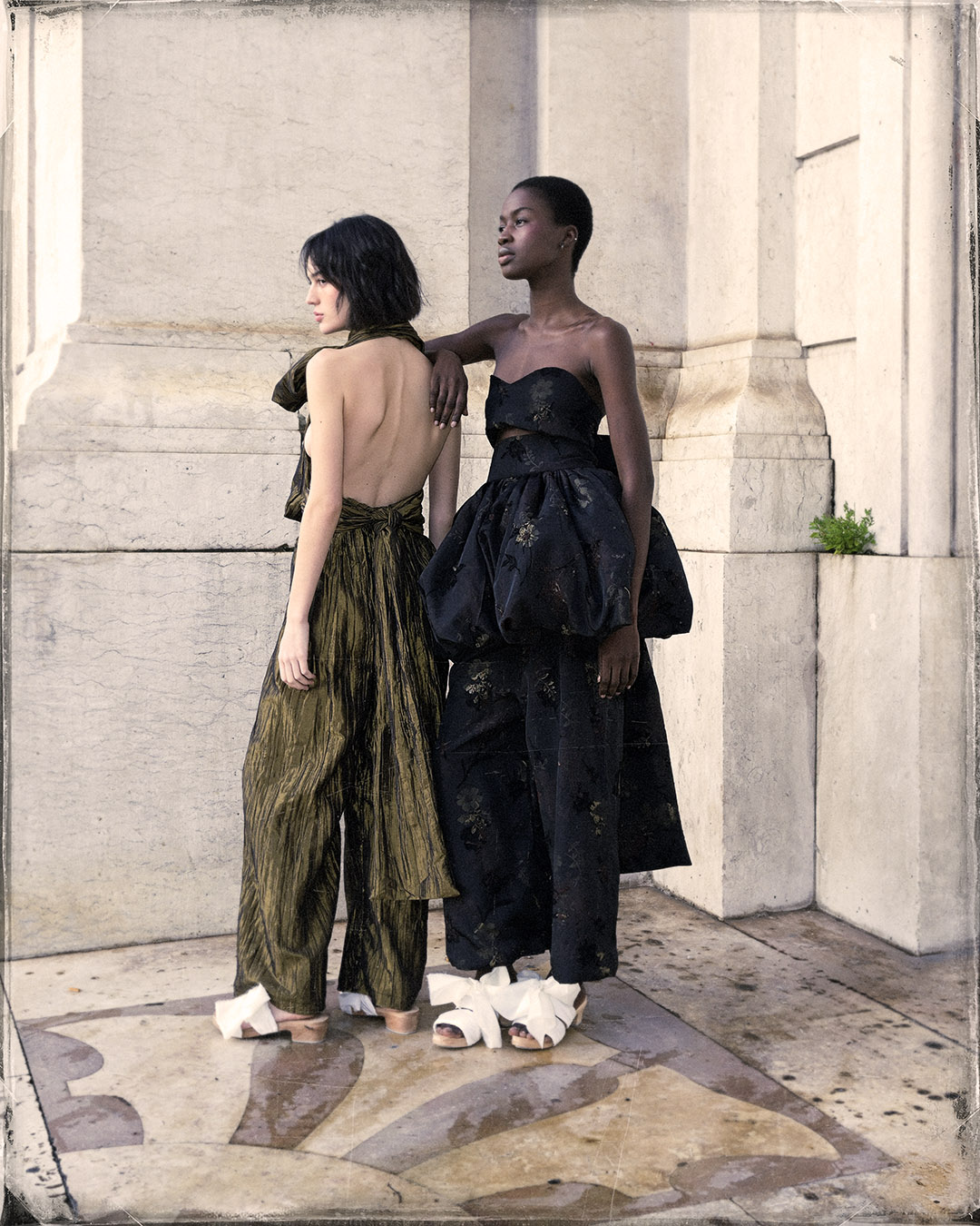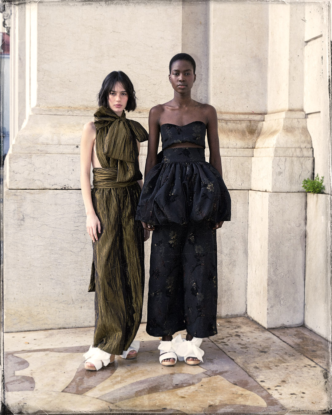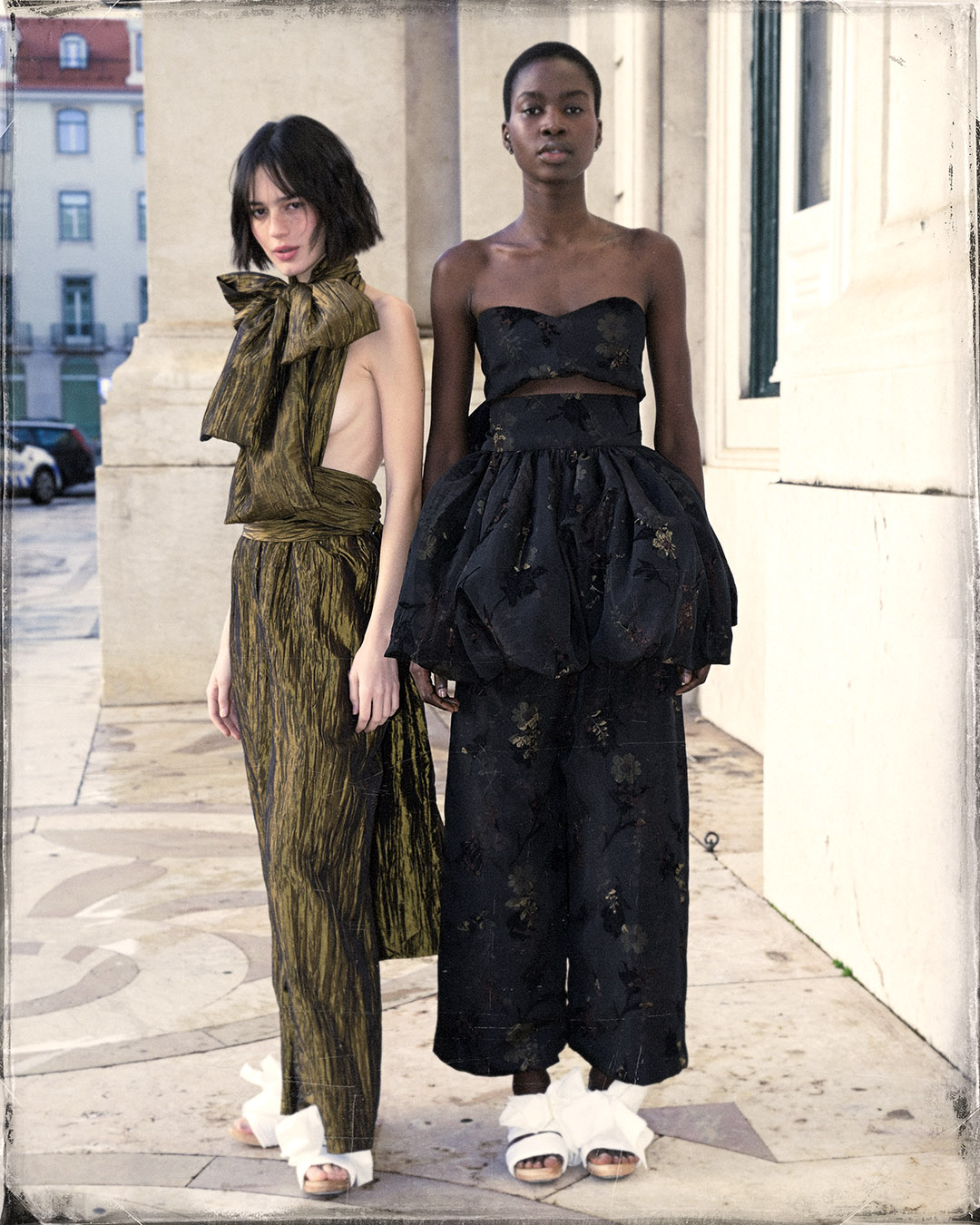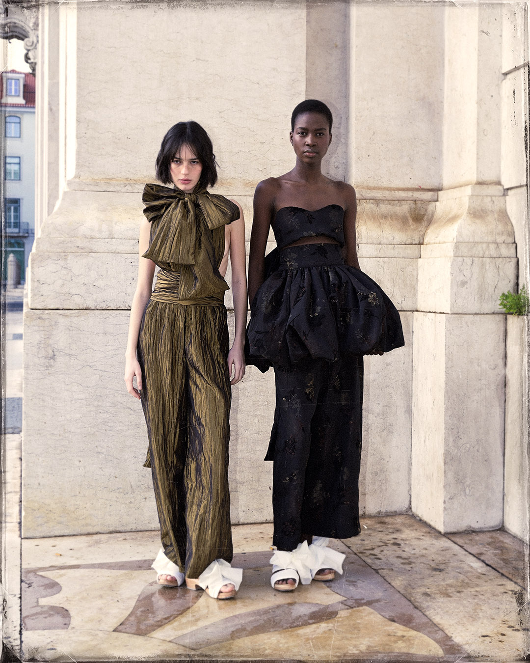 Rita and Aidé for BUZINA wearing Vera Fernandes´collection “Bucle”, a look in copper-cold look the signature bow and a with golden flowers embroided black bodysuit in silk.
