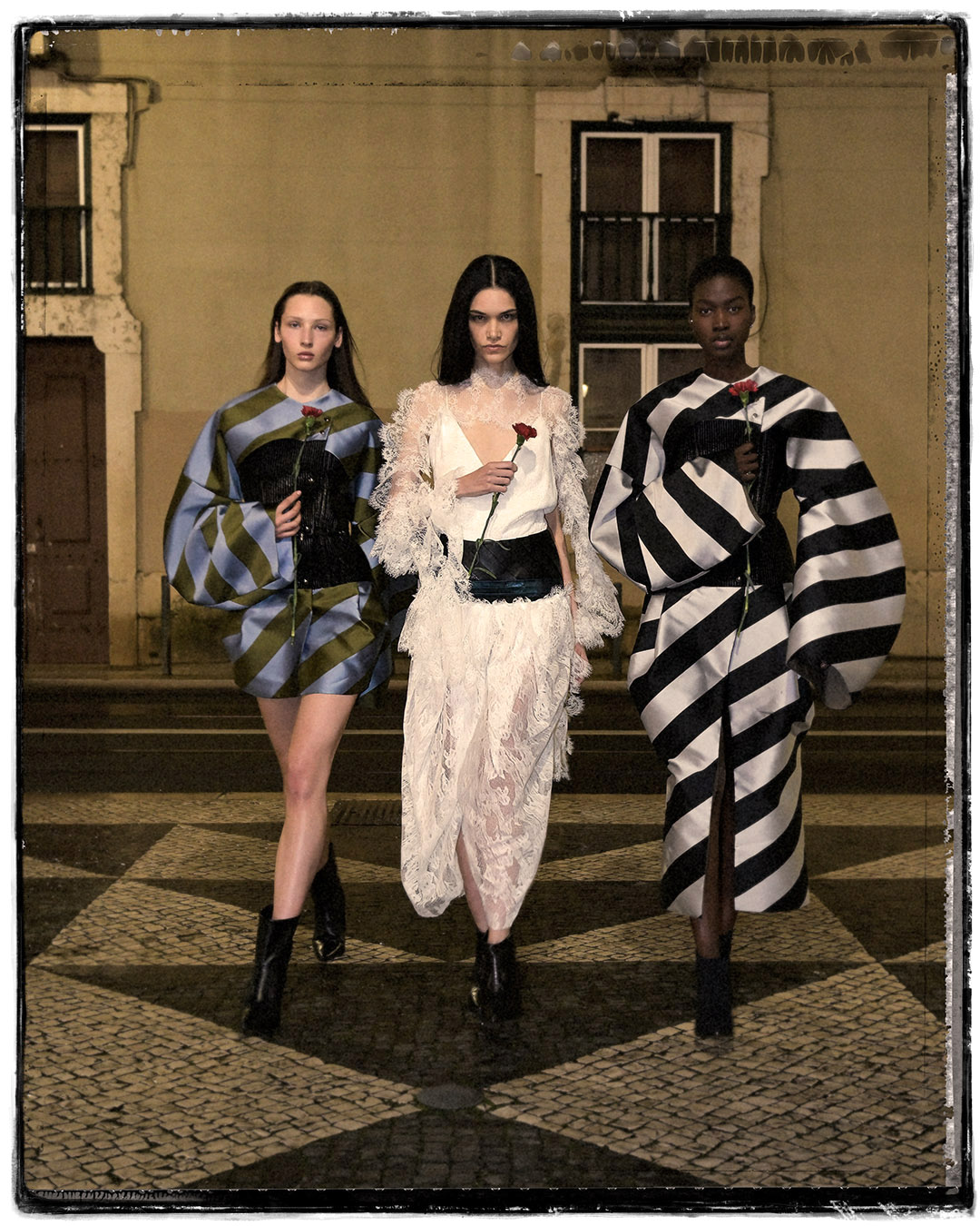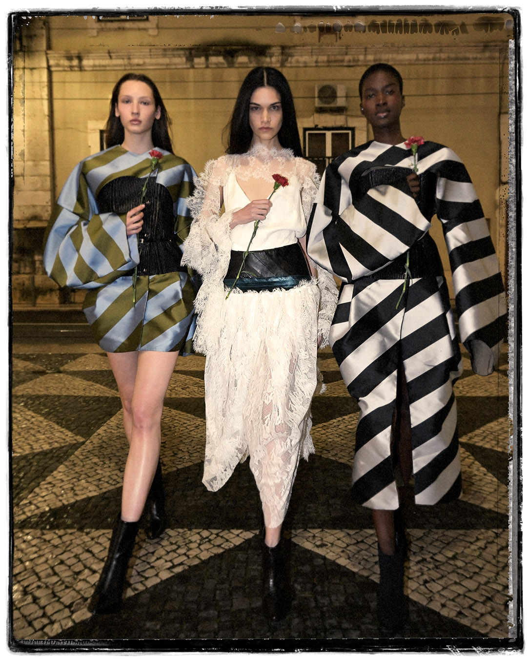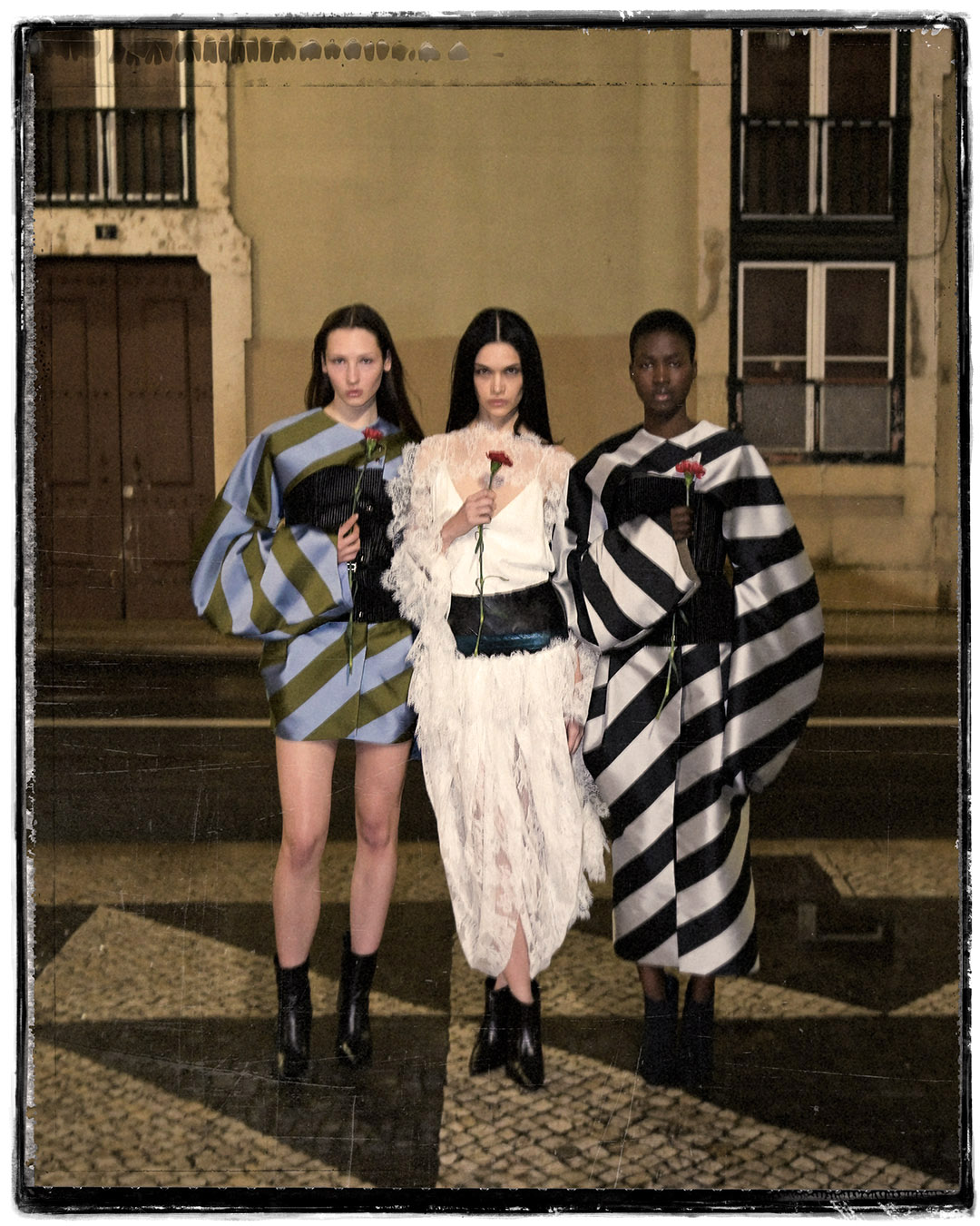 Dina, Isabella and Aidé for LUIS BUCHINHO wearing the final looks of his AW24 show. They are carrying the red coronations from Luis´catwalk, as a symbol for peace and democracy.