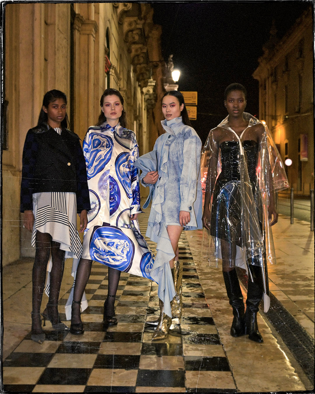 Sawitri, Ksenia, Mei and Aidé for RICARDO ANDREZ featuring our highlight looks of Ricardo´s collection “On the Rocks”, reworked denim, the checked wool jacket, the incredible raincoat and “The Stamp Dino Print” which was created in collaboration with Pedro Ventura Nunes.