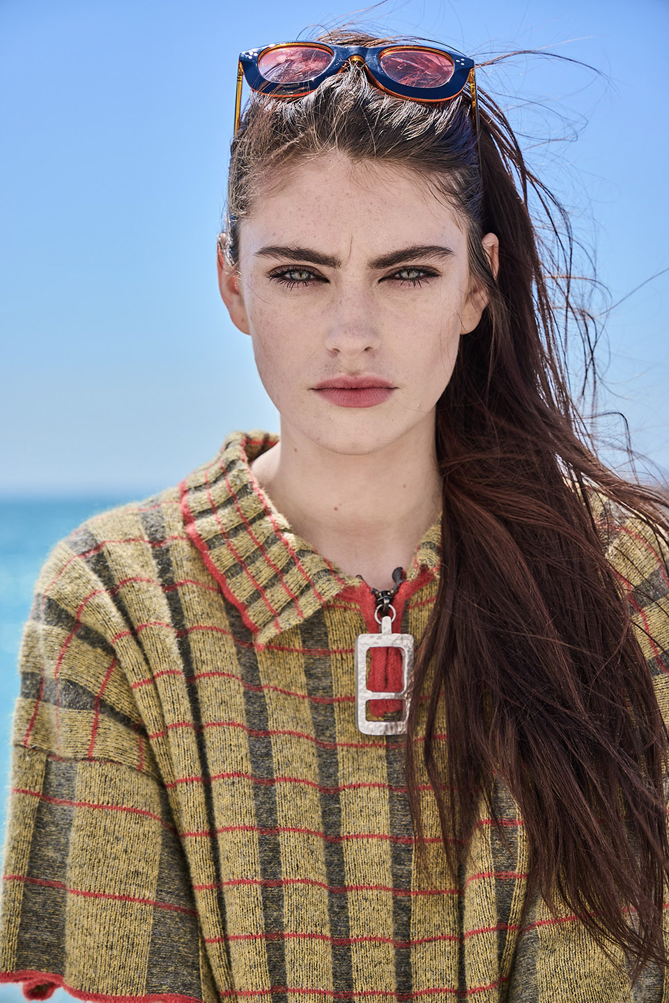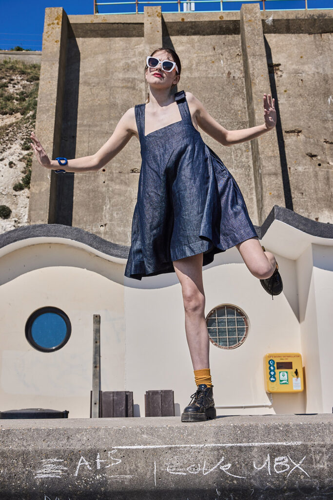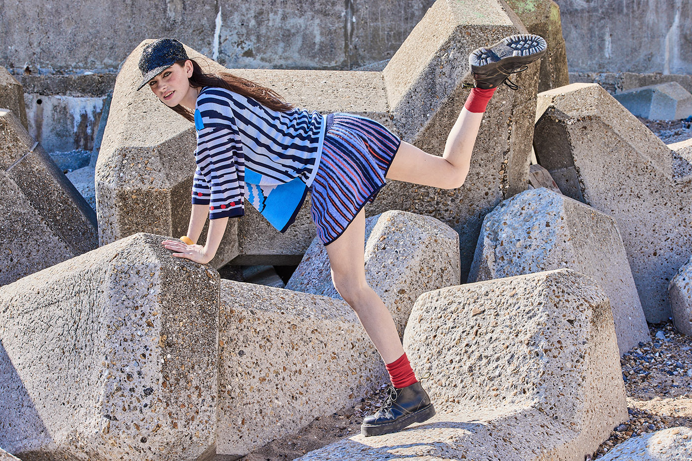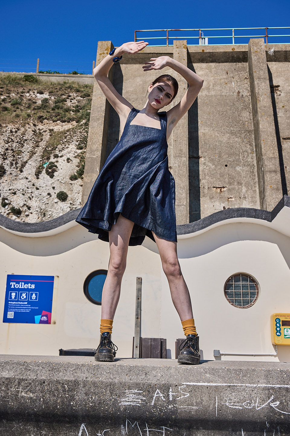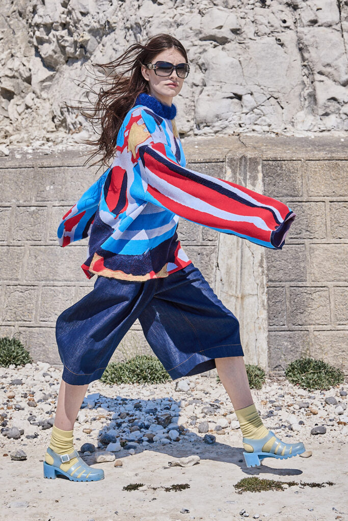 Young British fashion designer Amelia Caddick showcases a bold exploration of knitwear and denim in her latest BA degree collection — a tactile narrative of structure, softness, and raw edge. Shot on location in Brighton, the coastal backdrop added natural grit and atmosphere to the collection’s layered story. Captured through the lens of photographer Tim Kent, and brought to life by Cleopatra of The MiLK Collective, this editorial celebrates craftsmanship infused with playful confidence.