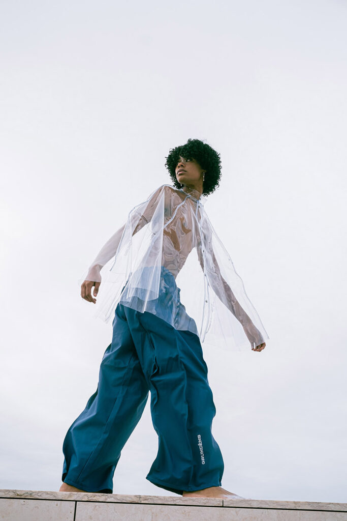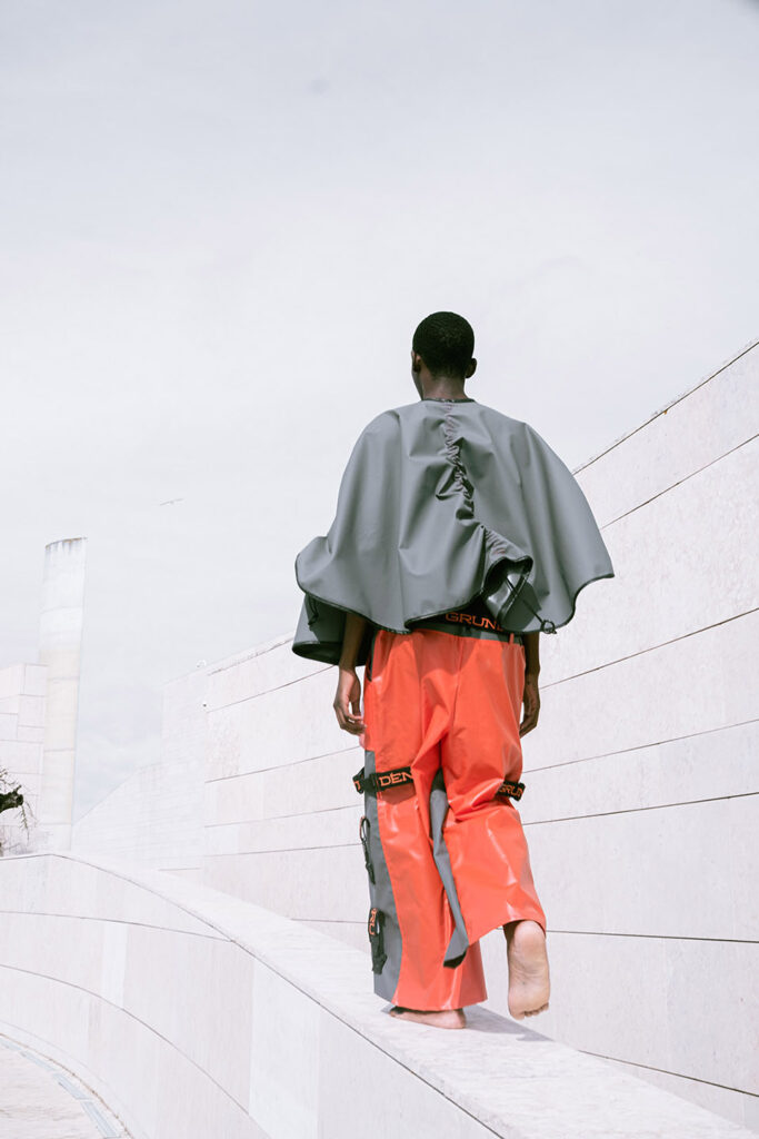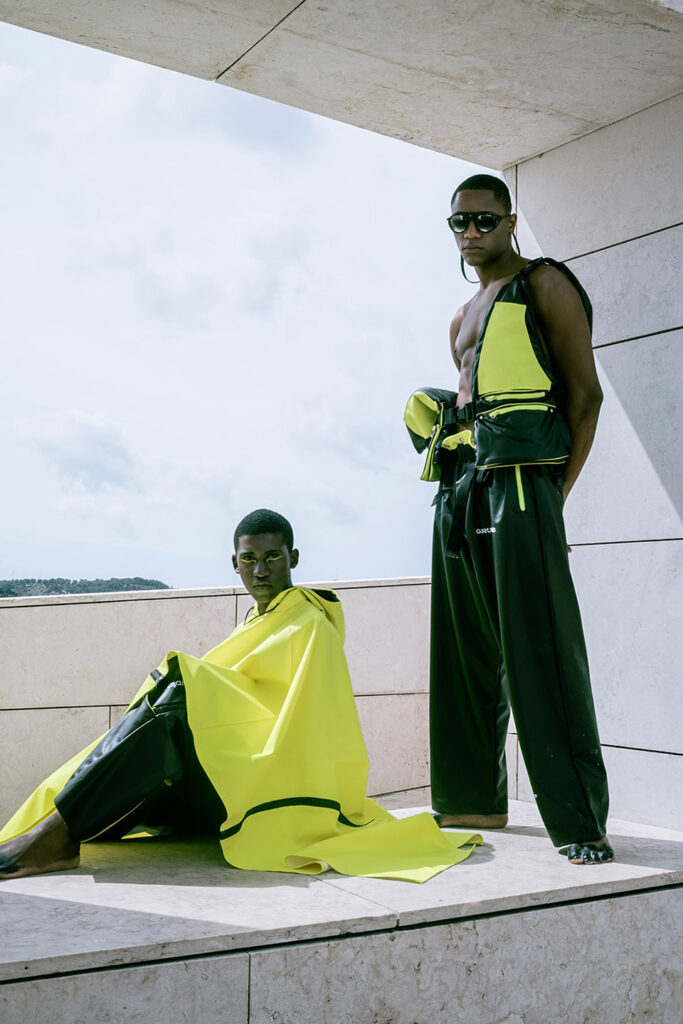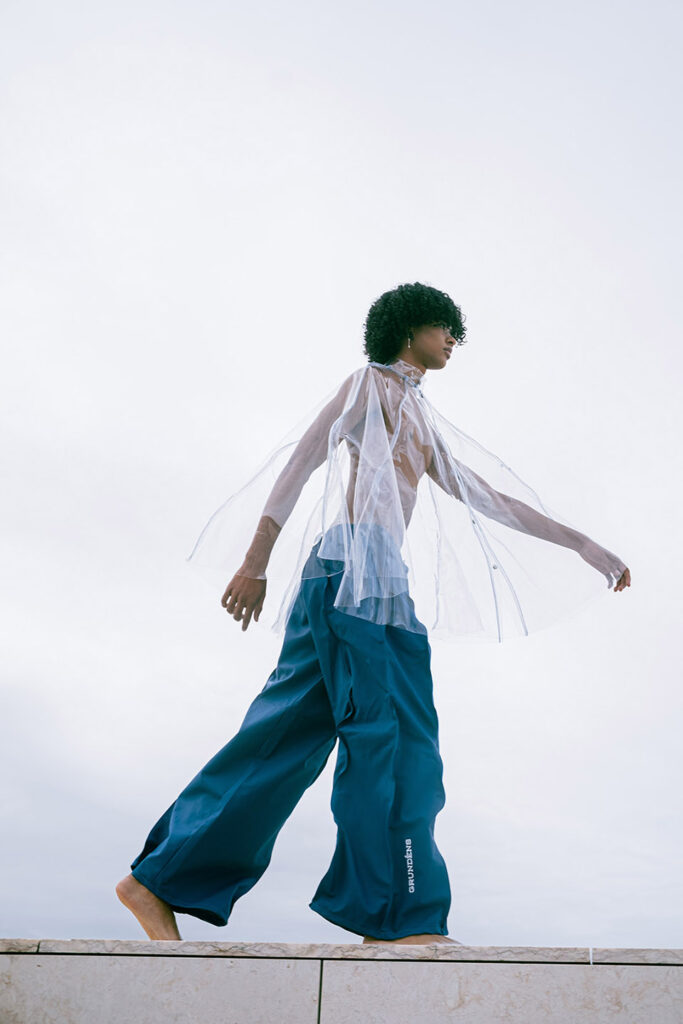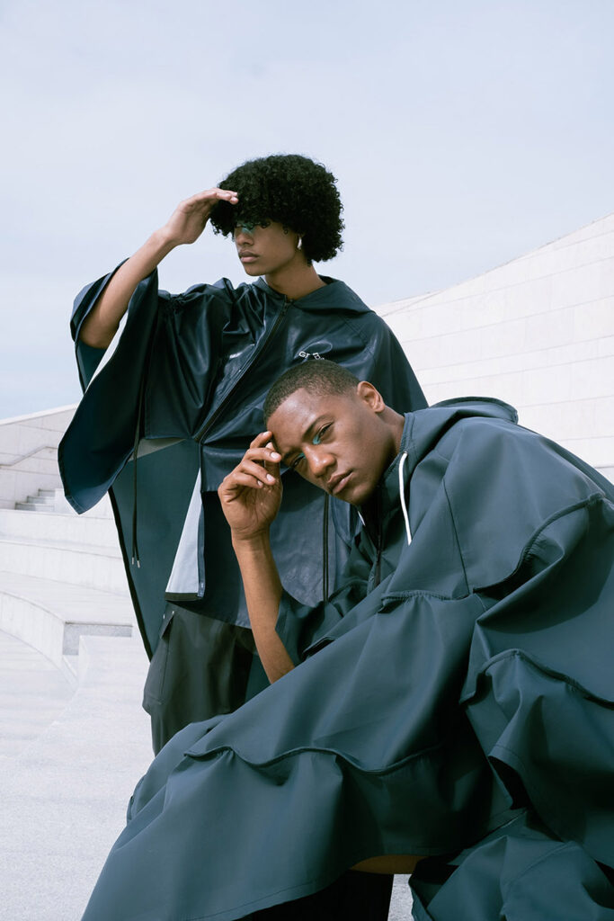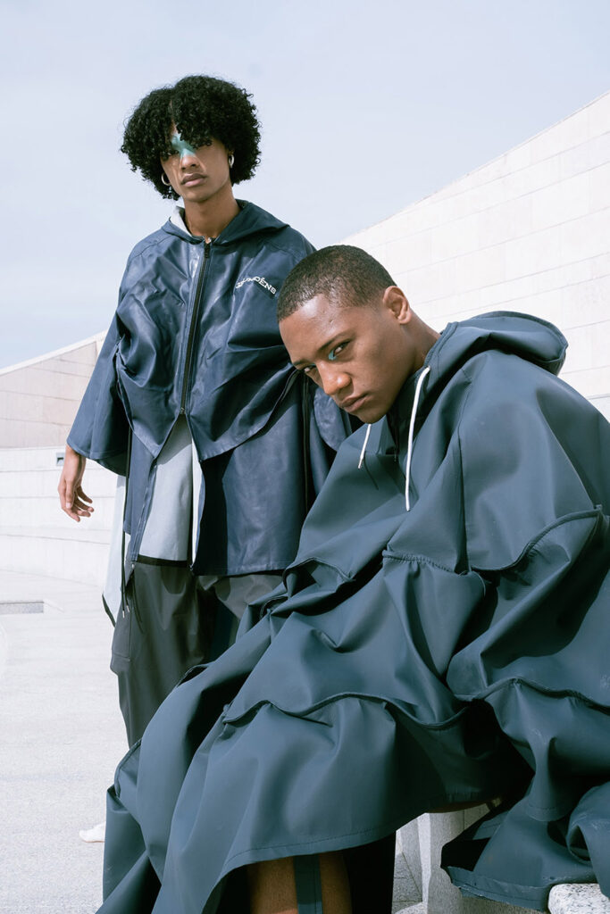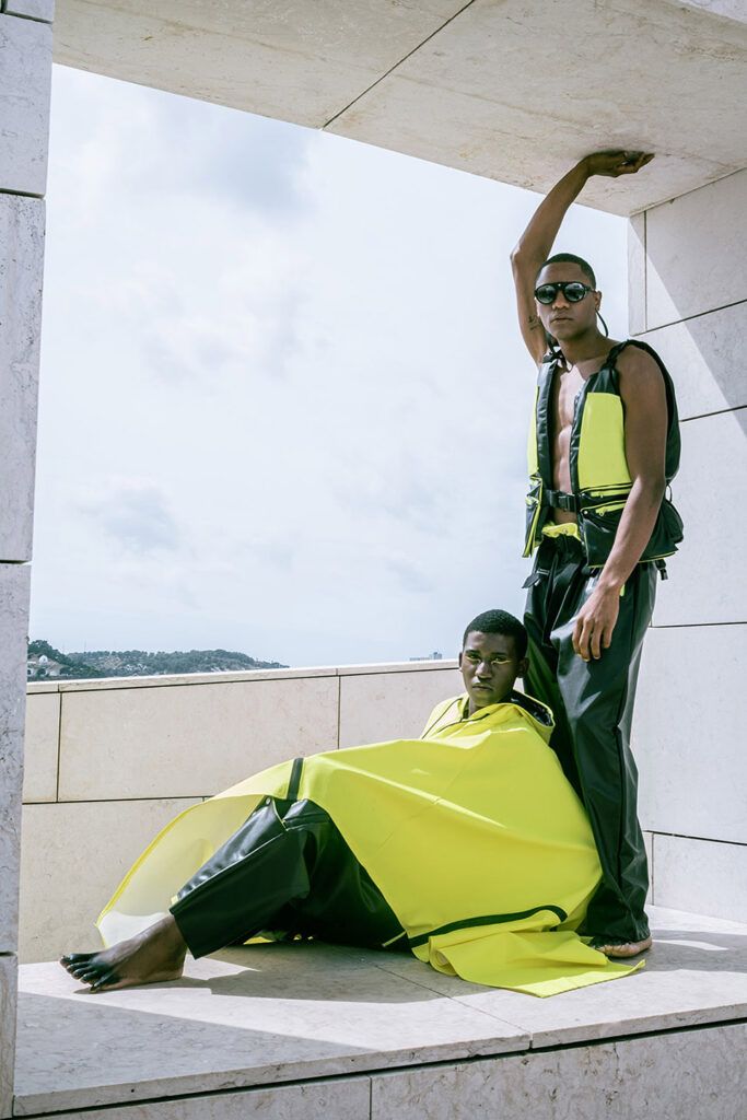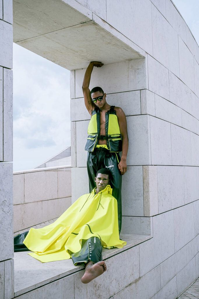 Shot on the riverside steps of the Champalimaud Foundation, ZOOT and ETIC joined forces to showcase a futuristic collection. ETIC’s final-year Fashion Design students using deadstock materials from the Swedish fishing-gear brand Grundéns, this capsule highlights the urgency of putting sustainable practices into action.