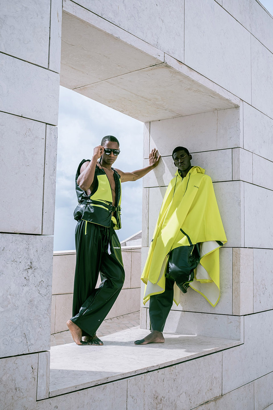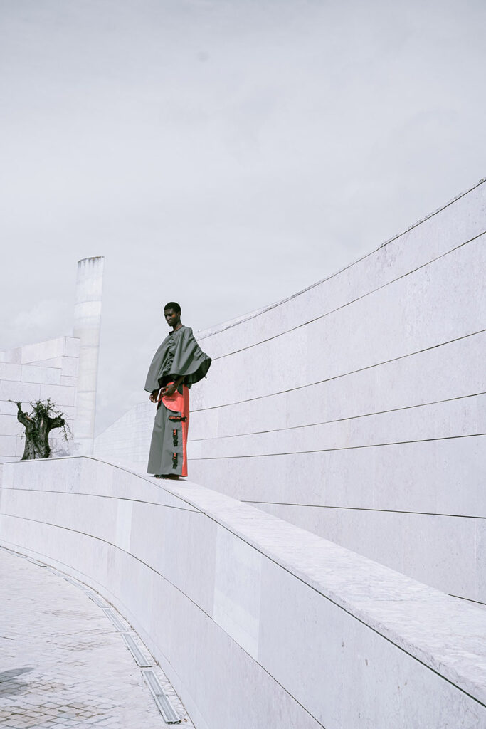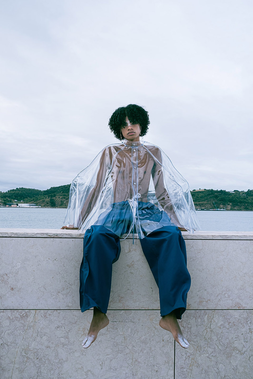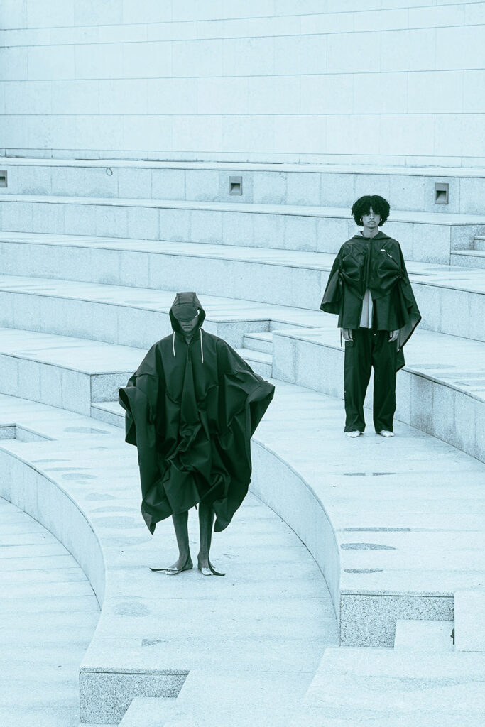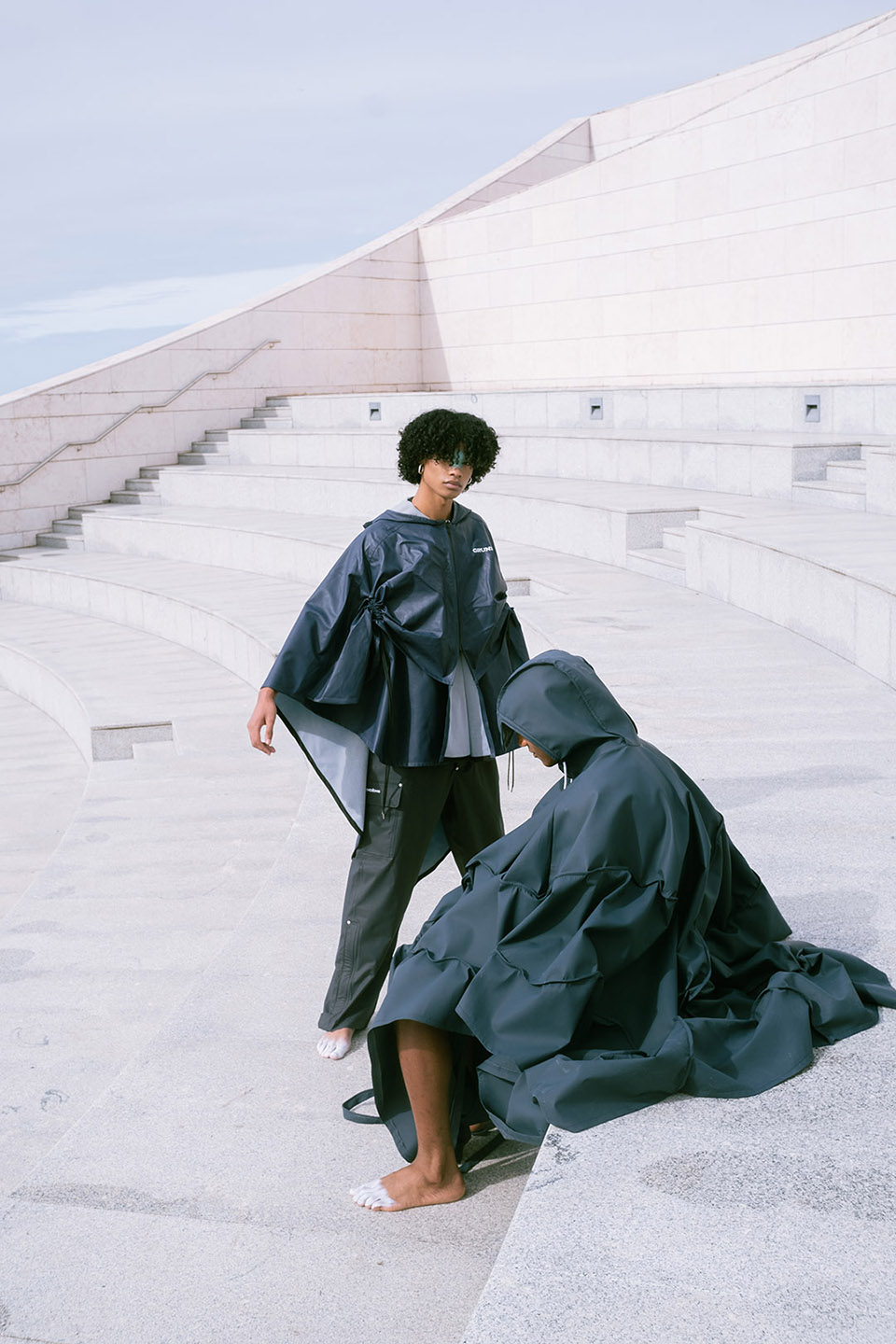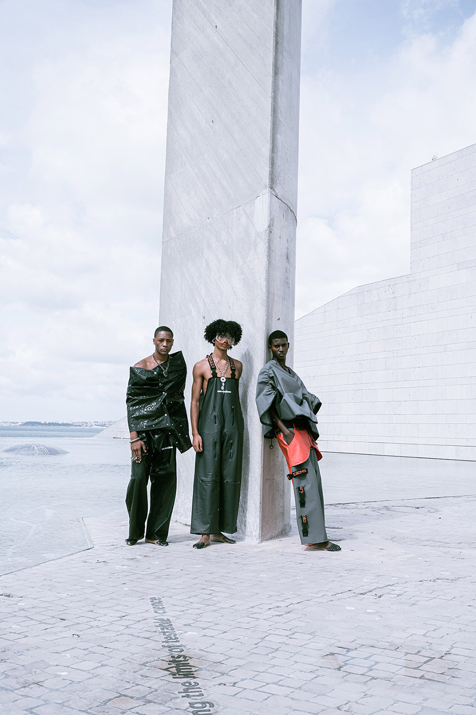 Photographed by Bárbara Martons along the edge of the Tejo, on the sculptural steps of the Champalimaud Foundation — a space dedicated to pioneering scientific research — the story evokes a surreal near-future landscape. The young creative team shapes the models, a full Da Banda cast, into a tribe armoured with waterproof materials, sculptural silhouettes and protective layers.