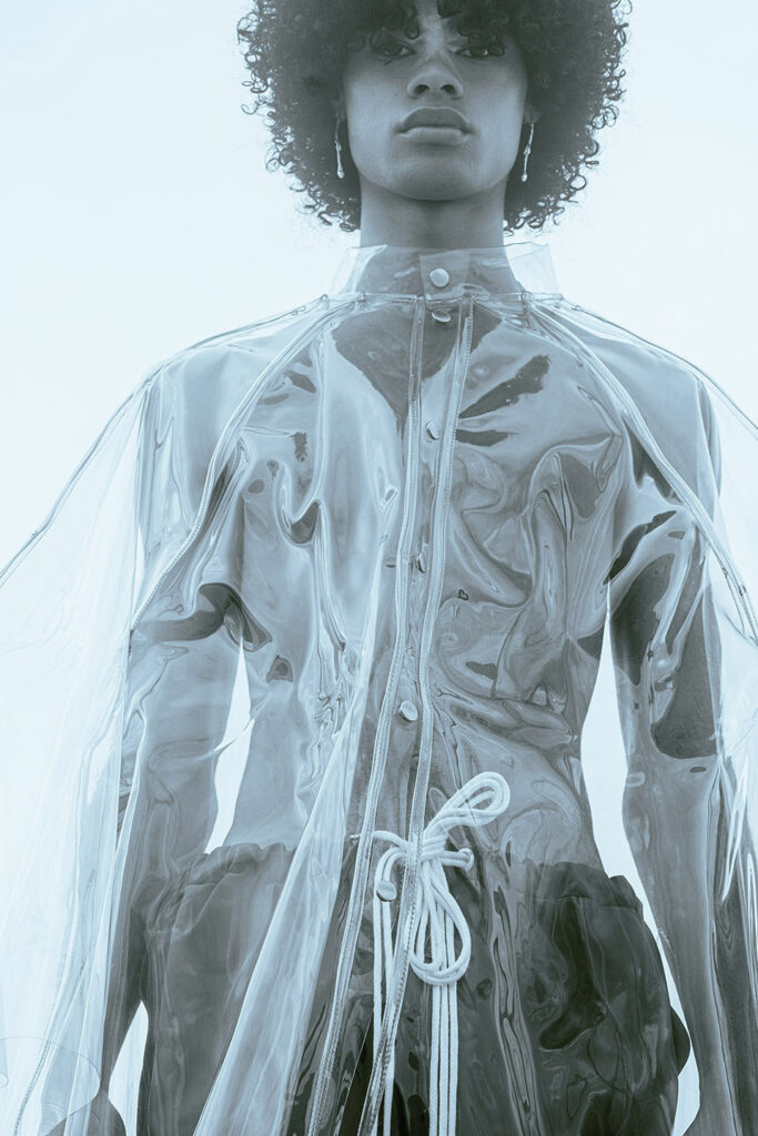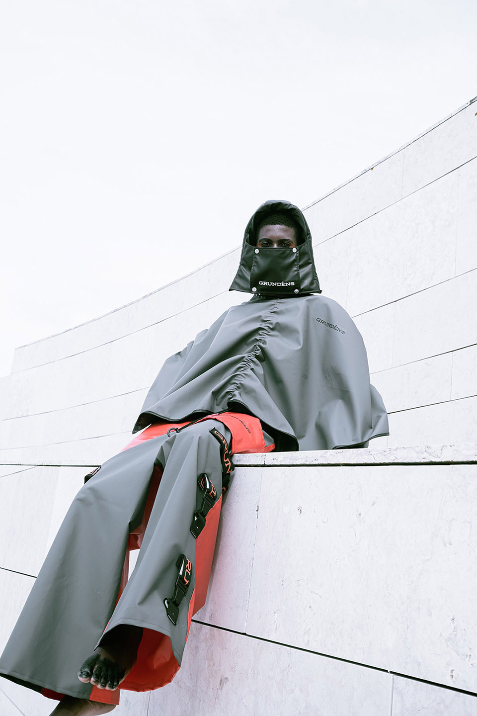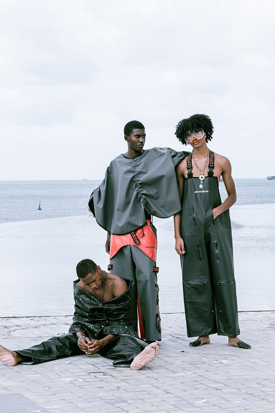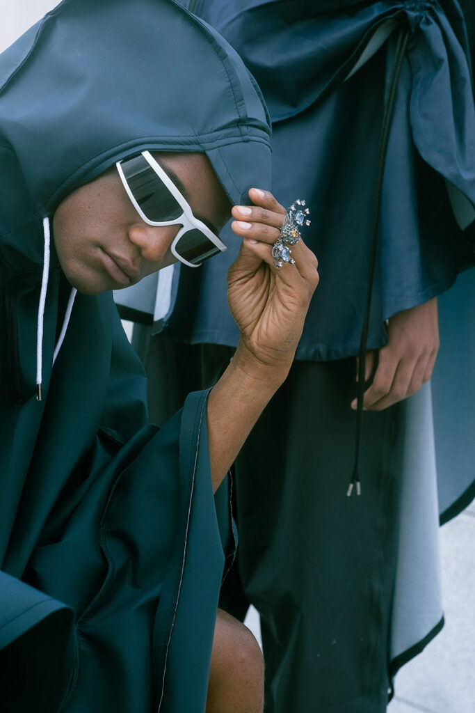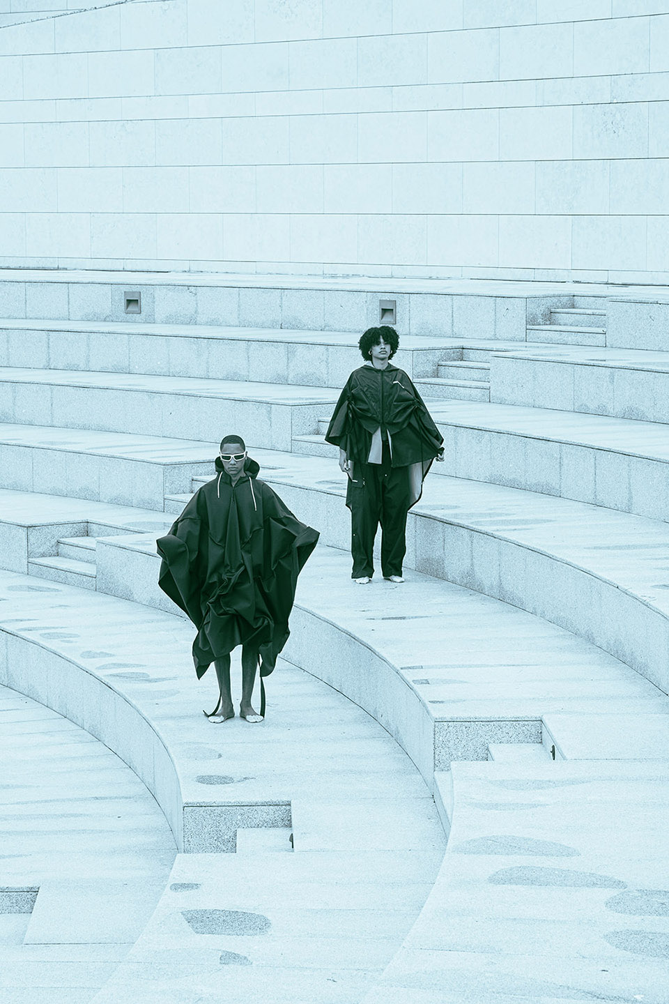Photographed by Bárbara Martons along the edge of the Tejo, on the sculptural steps of the Champalimaud Foundation — a space dedicated to pioneering scientific research — the story evokes a surreal near-future landscape. The young creative team shapes the models, a full Da Banda cast, into a tribe armoured with waterproof materials, sculptural silhouettes and protective layers.
