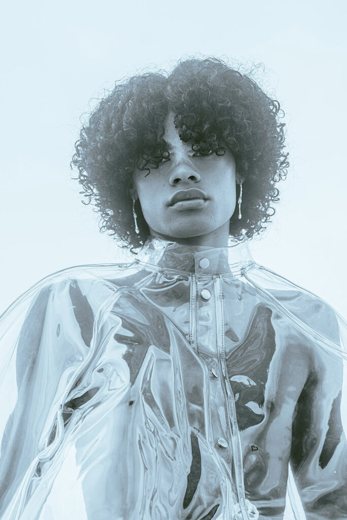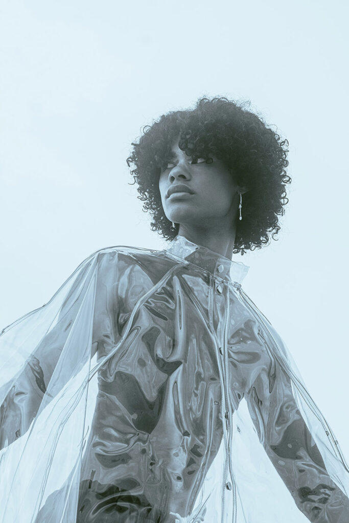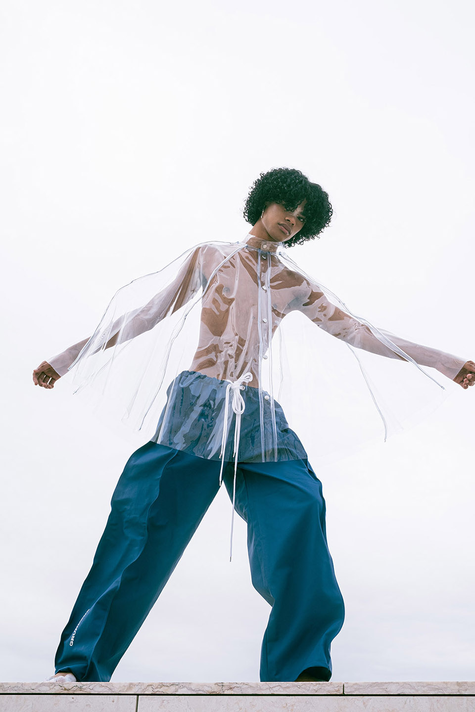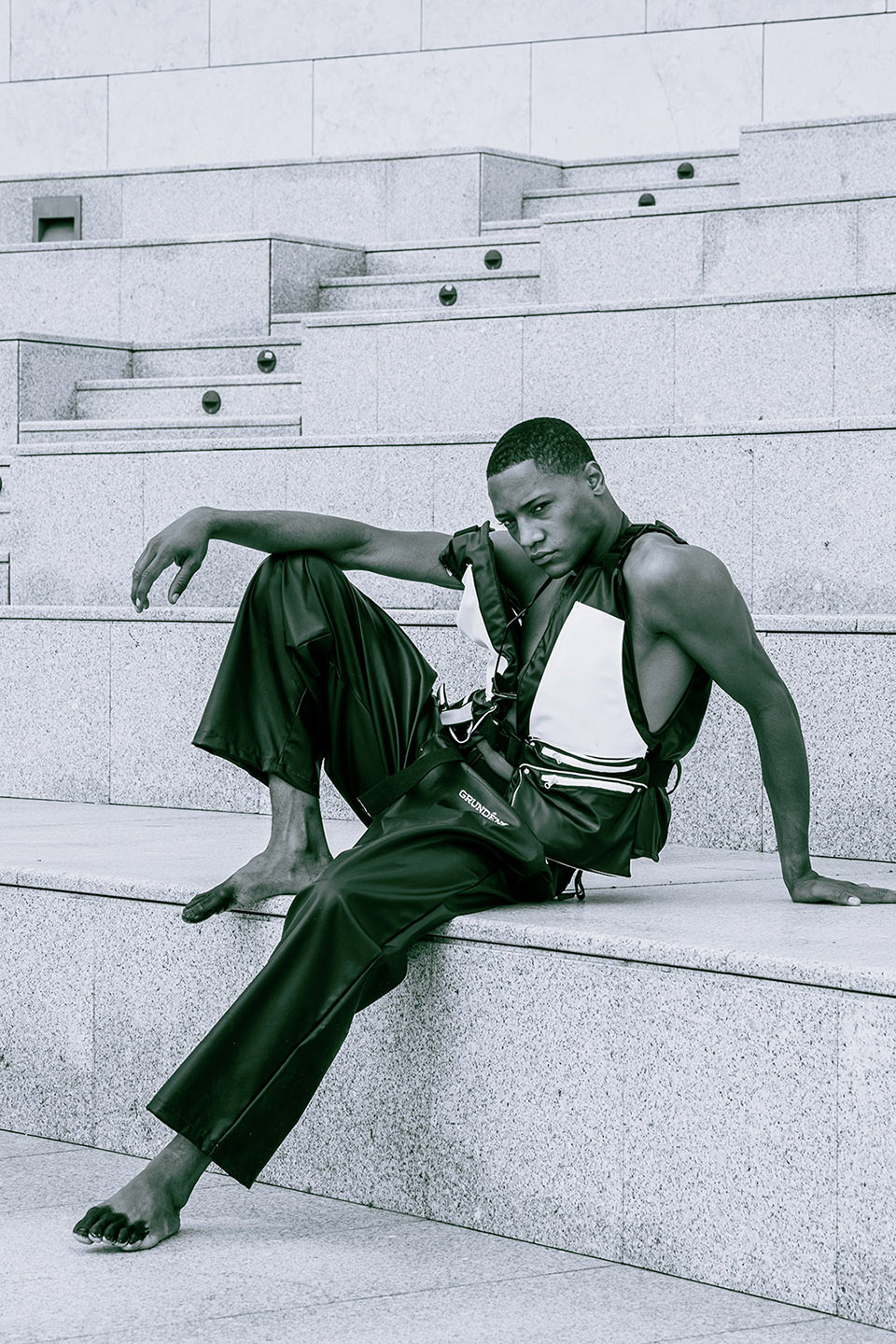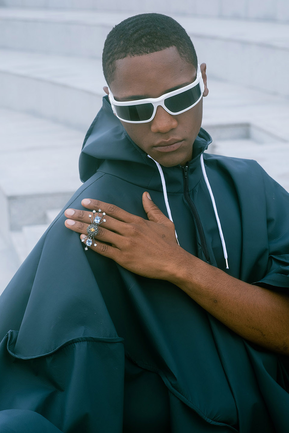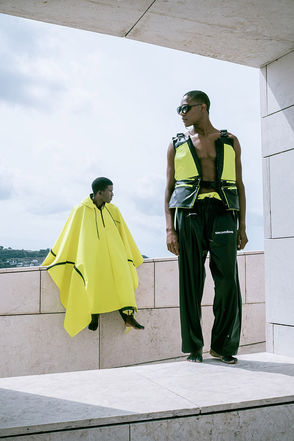Photographed by Bárbara Martons along the edge of the Tejo, on the sculptural steps of the Champalimaud Foundation — a space dedicated to pioneering scientific research — the story evokes a surreal near-future landscape. The young creative team shapes the models, a full Da Banda cast, into a tribe armoured with waterproof materials, sculptural silhouettes and protective layers.