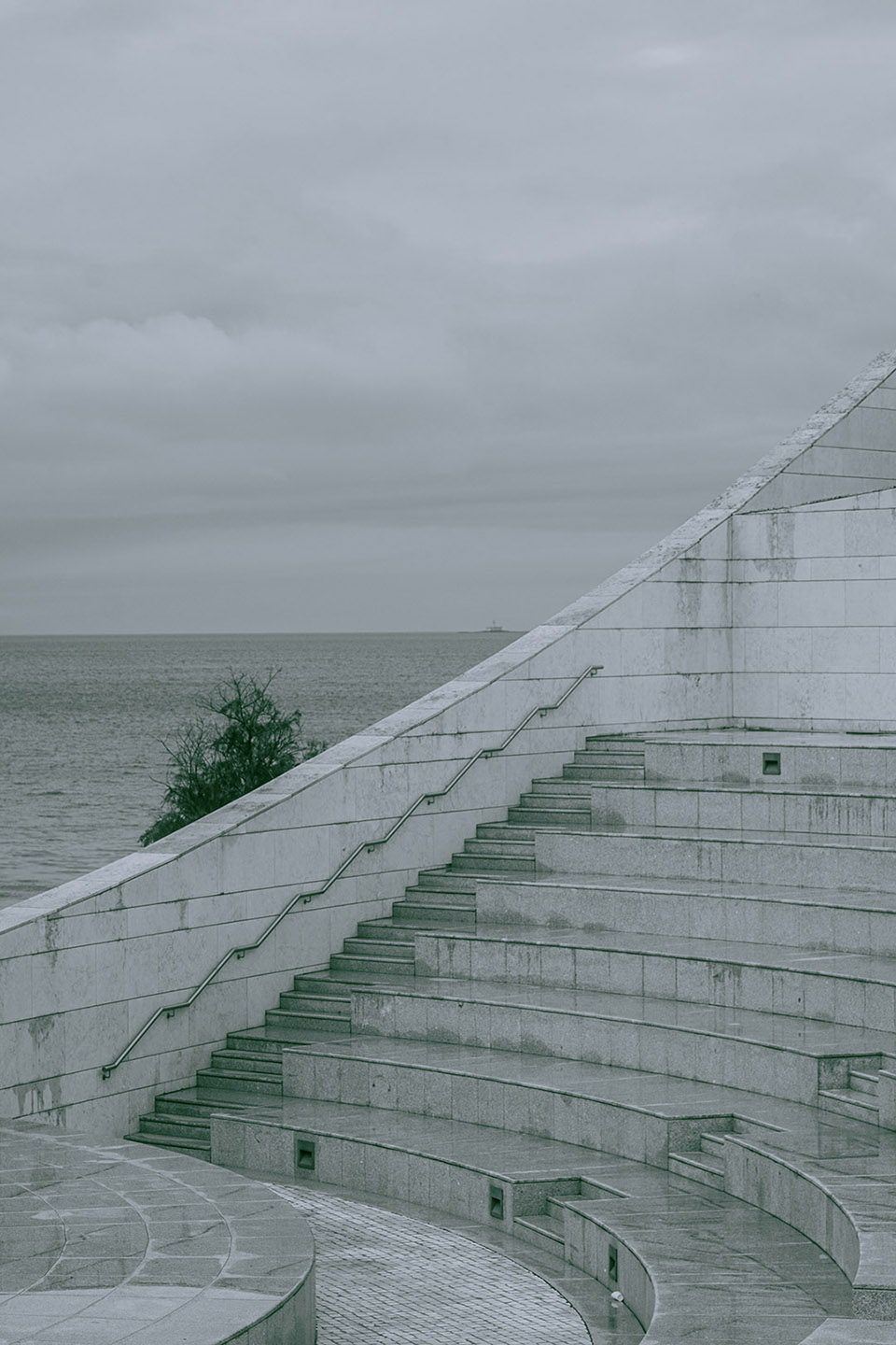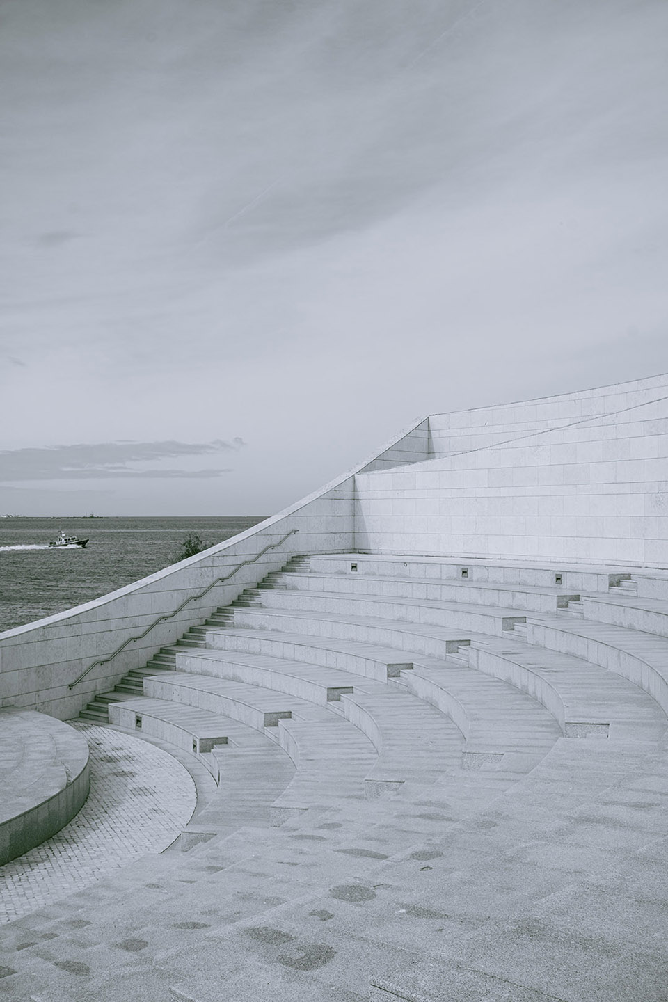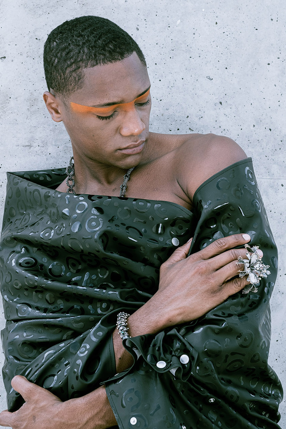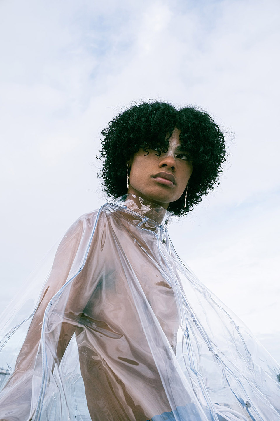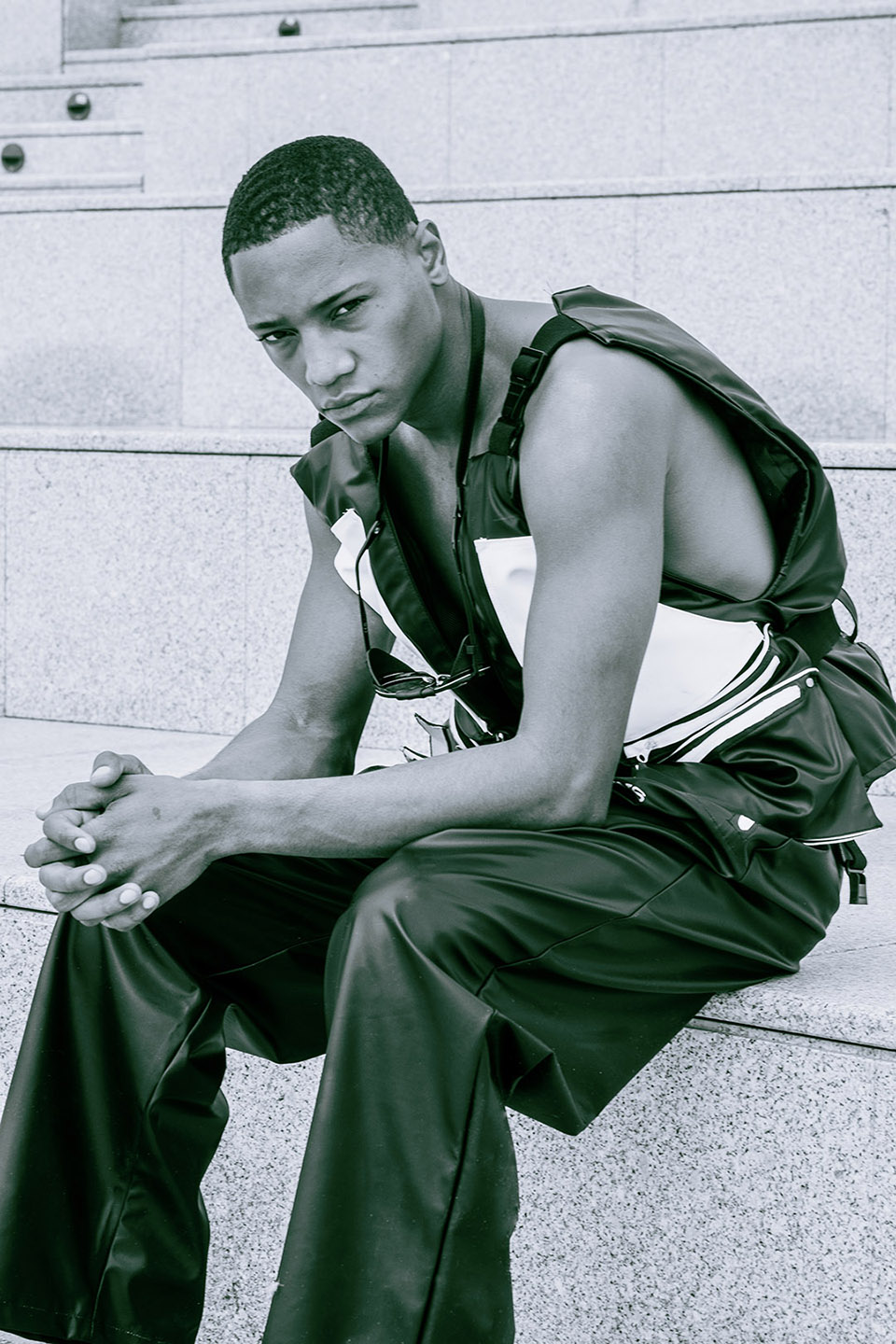 Photographed by Bárbara Martons along the edge of the Tejo, on the sculptural steps of the Champalimaud Foundation — a space dedicated to pioneering scientific research — the story evokes a surreal near-future landscape. The young creative team shapes the models, a full Da Banda cast, into a tribe armoured with waterproof materials, sculptural silhouettes and protective layers.