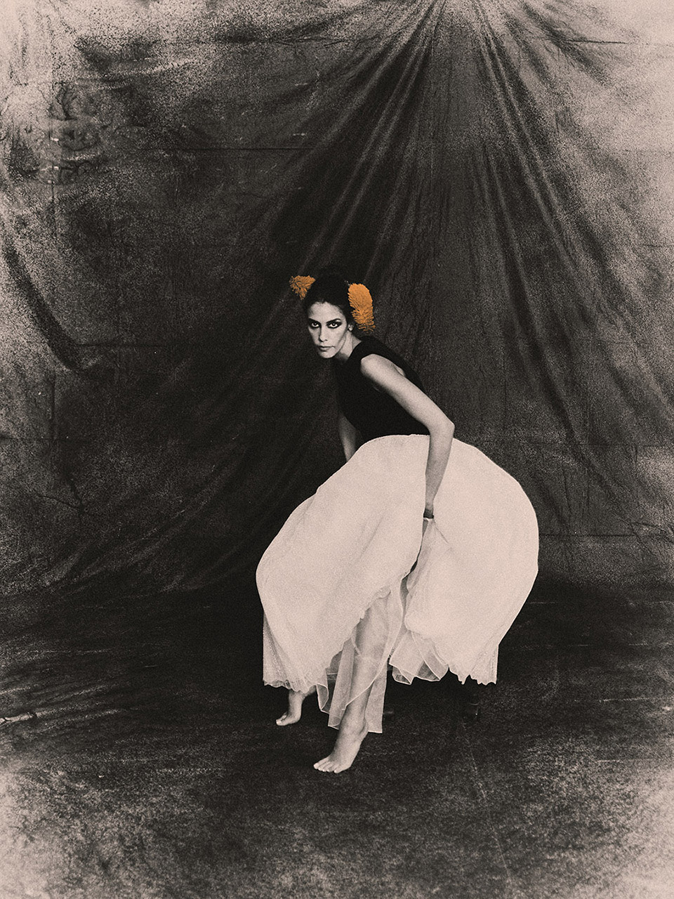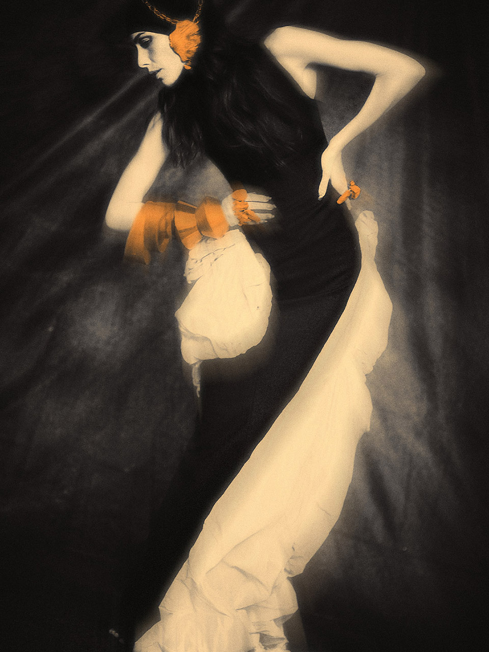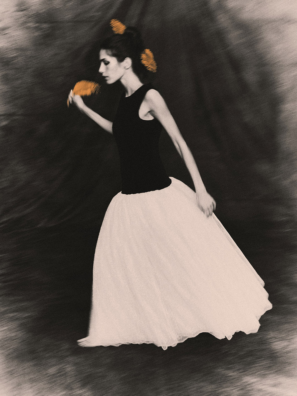 Our team at ZOOT — led by Antonia Rosa with image artist Sergio Santos — approached Isabela’s shoot as if we were painting with light. Inspired by Monet, Renoir, and Toulouse-Lautrec, the goal was to capture emotion, atmosphere, and the vibrating edge between reality and dream. Each image was hand-coloured by Sergio, who added a precise shade of orange to selected areas. For him, the tone carries “energy, creativity and warmth — a blend of passion and optimism.”