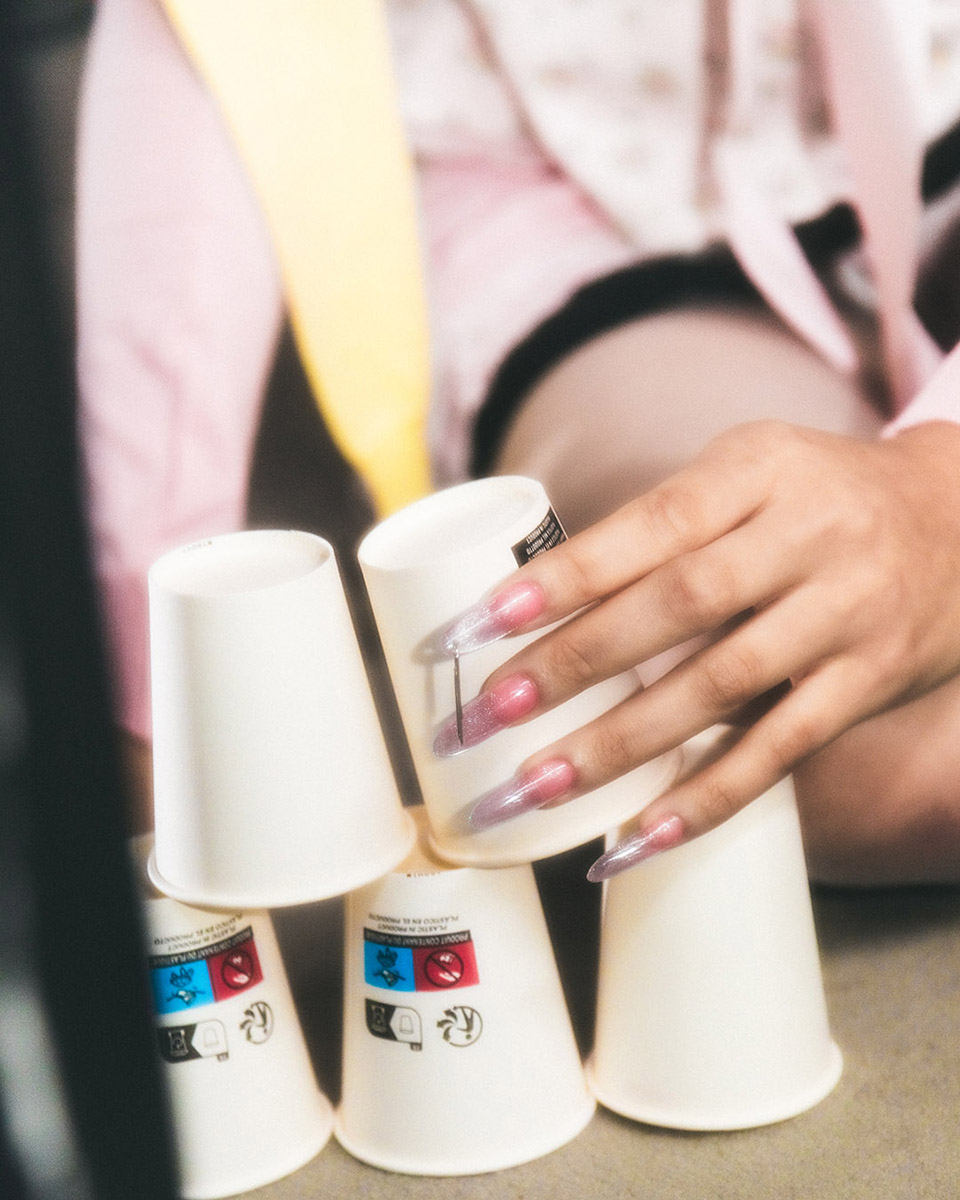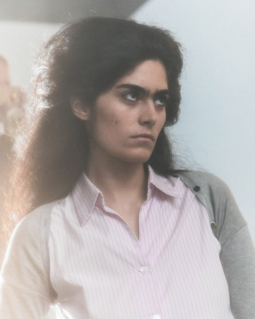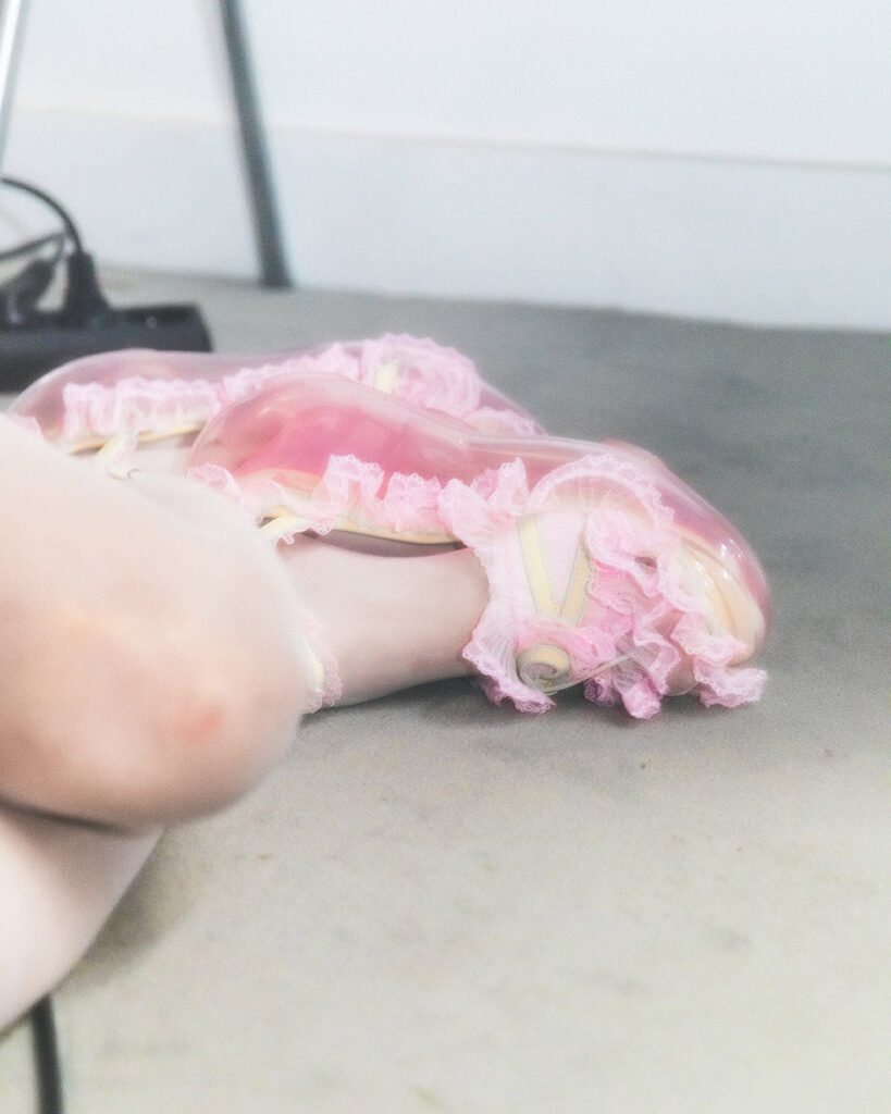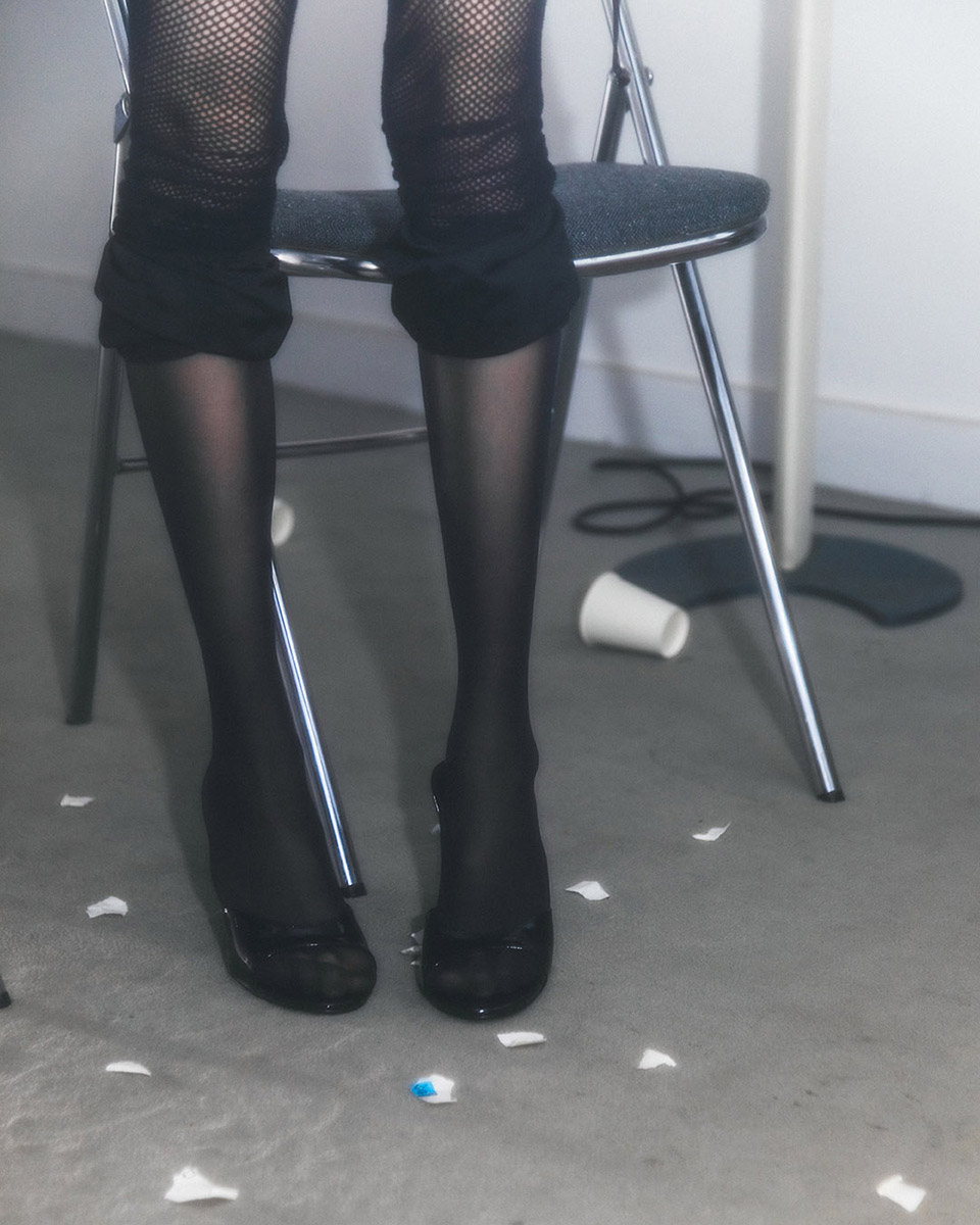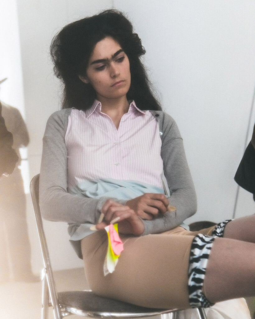 Her SS26 collection, “Everyday”, unveiled during PFW, transforms the mundane into the surreal. Set in a plain office space, ten models sit at their desks — typing, pausing, drifting into thought. In these ordinary gestures, Shueh reveals a quiet rebellion: the tiny acts of mental escape we find in routine. “In everyday routines, like going to the bathroom, I sometimes feel like I disappear from the boring environment and get a small sense of freedom.”