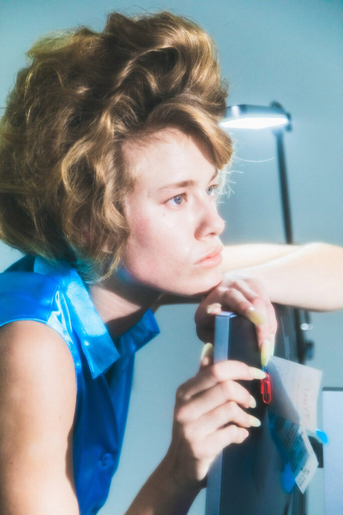 It’s this duality that defines Jenny Fax’s analog-futurist sensibility. Stylist Lotta Volkova sharpens this narrative with her signature edge for SS26, merging Fax’s tender nostalgia with an unsettling corporate surrealism. The result is a collection that feels both analog and futuristic — like an old VHS tape replaying a dream of the future.