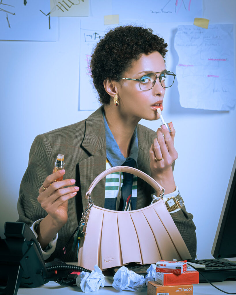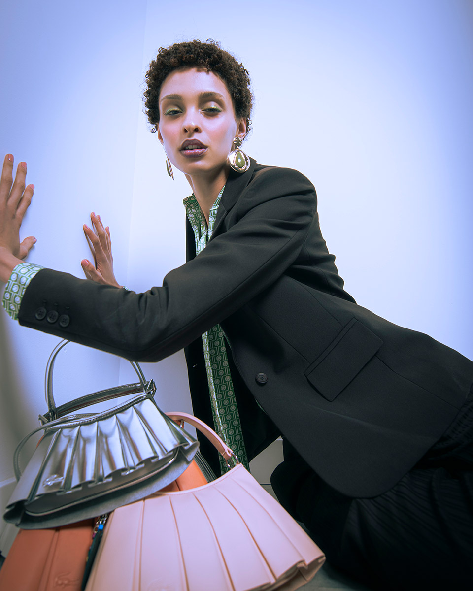 LACOSTE blazer, pants and bags; MANGO earings; Seaside shoes.