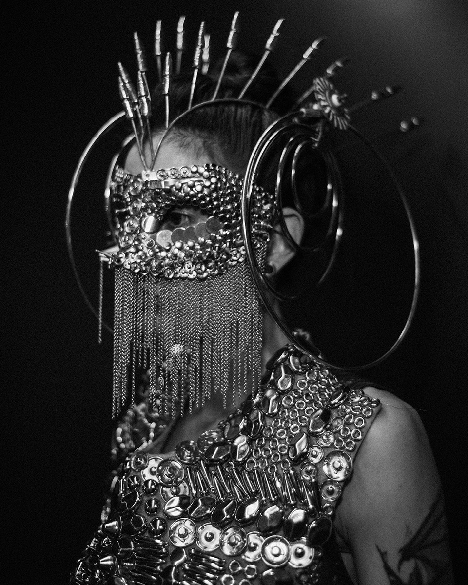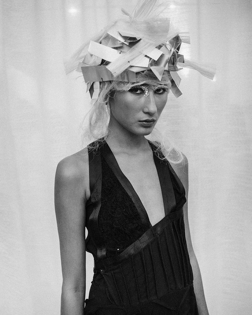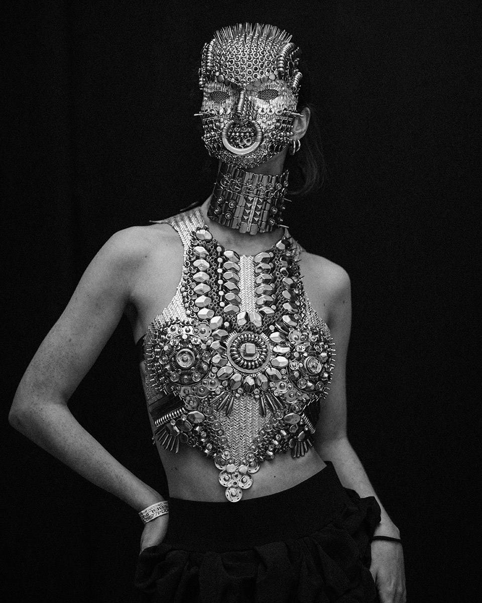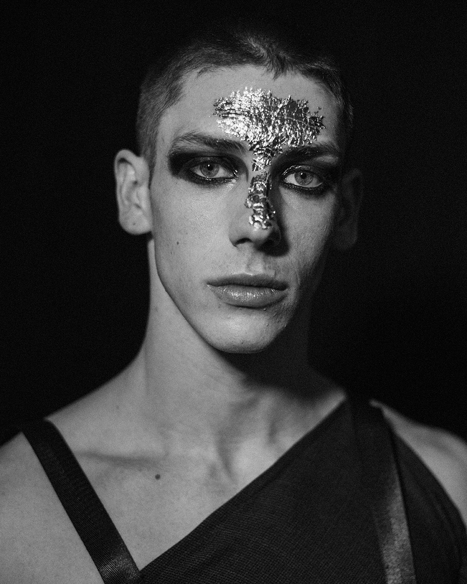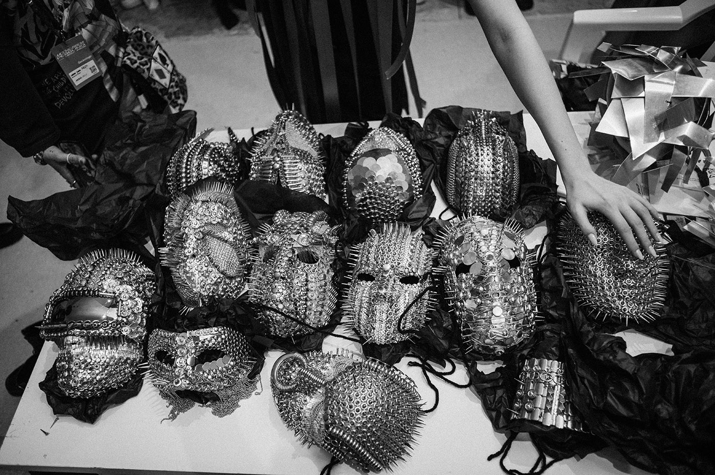 Valentim asked me to reproduce the masks he was creating in makeup. I mirrored them with silver foil, which we applied to each model’s face, shaped to their individual features.