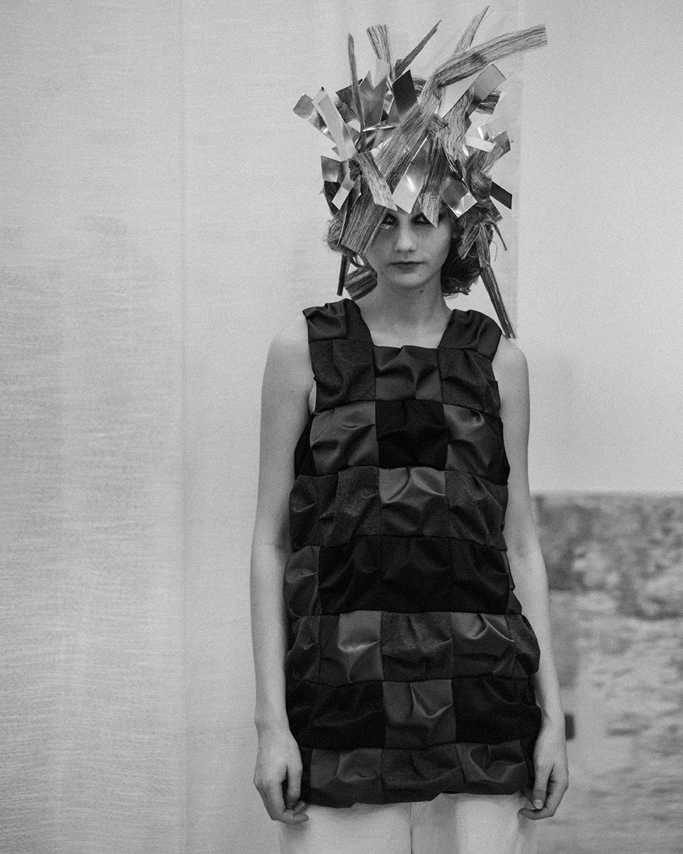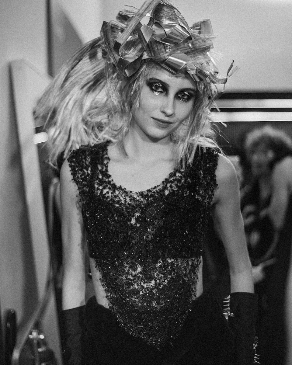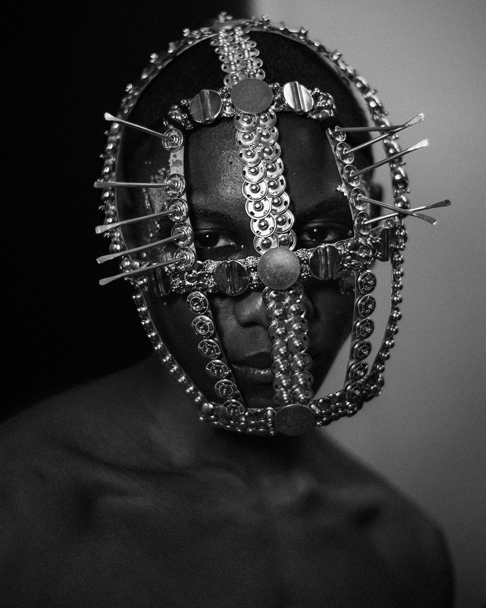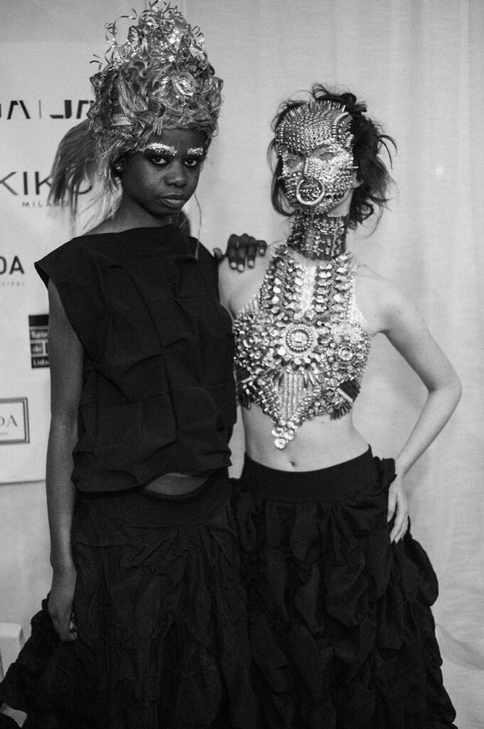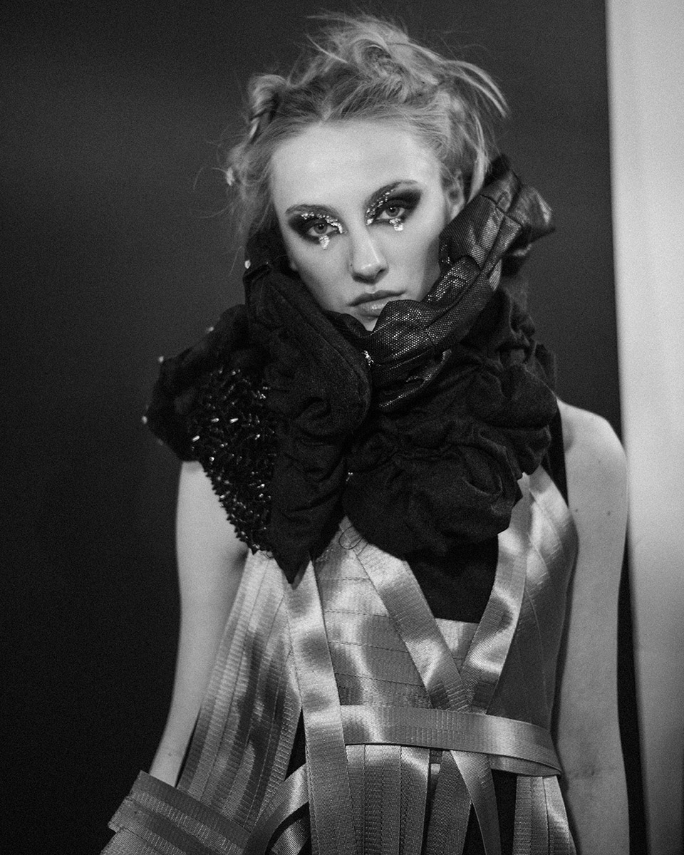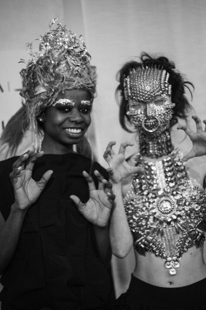 Valentim asked me to reproduce the masks he was creating in makeup. I mirrored them with silver foil, which we applied to each model’s face, shaped to their individual features.