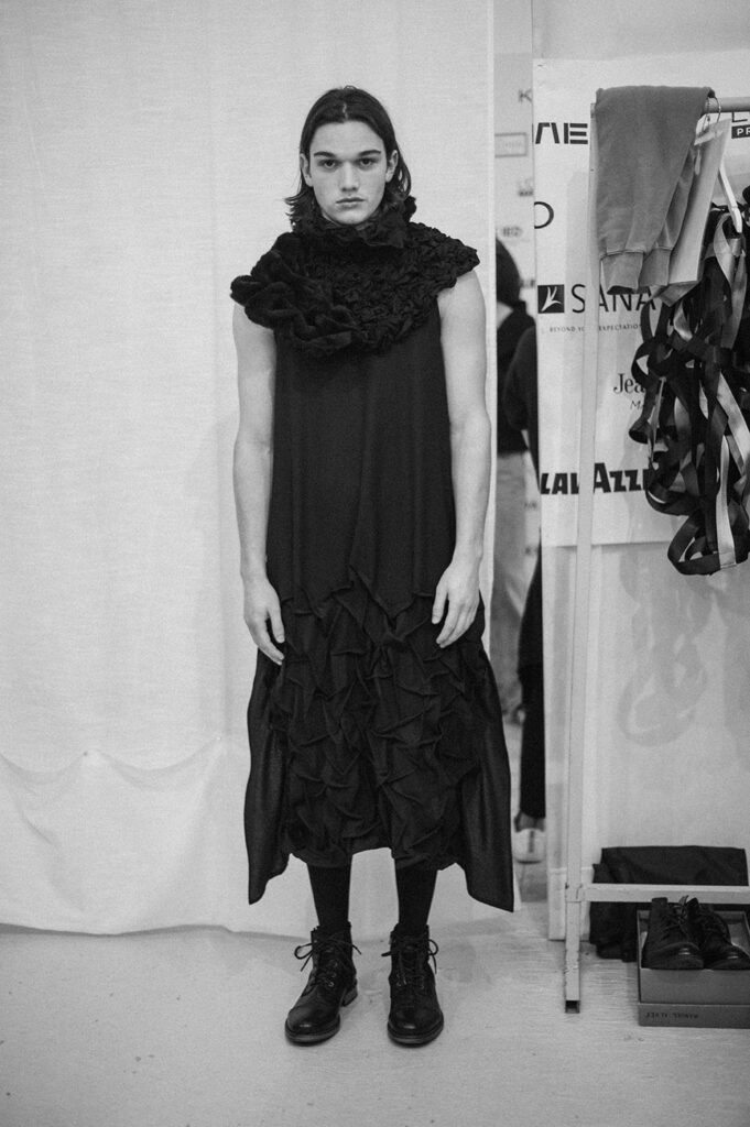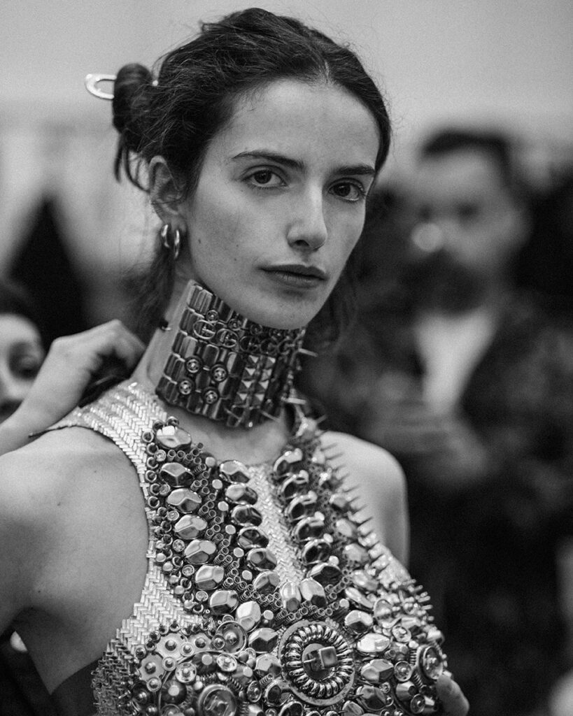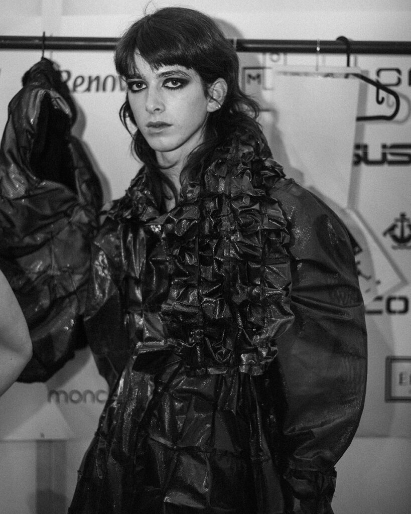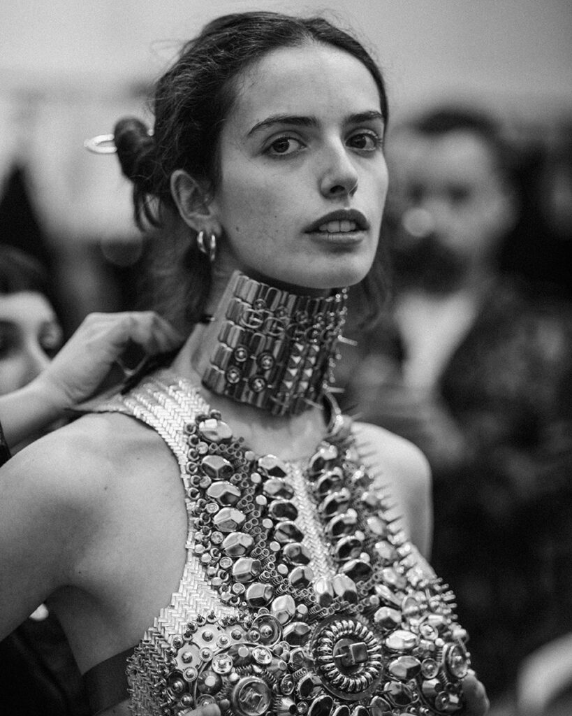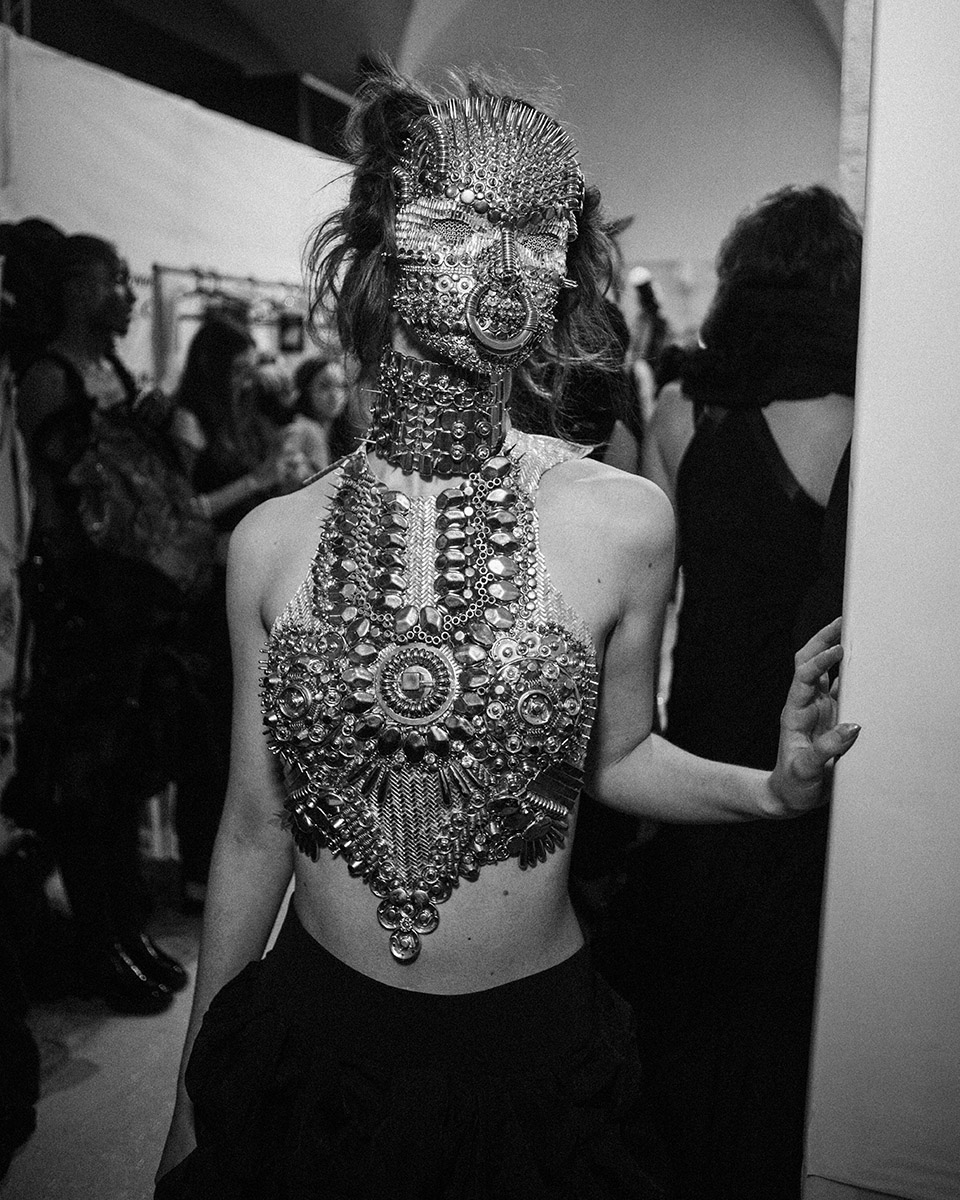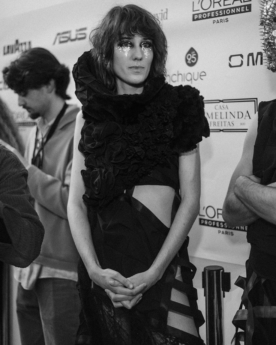 Seven days later, the atelier hit the runway at Pátio da Galé. Backstage moved in slow-motion chaos: Isabella captured last-minute adjustments, fast hands, and rising tension as Valentim’s AW26 collection — upcycled metals, glass stones, and textured dark fabrics — hit with raw energy and audacity.